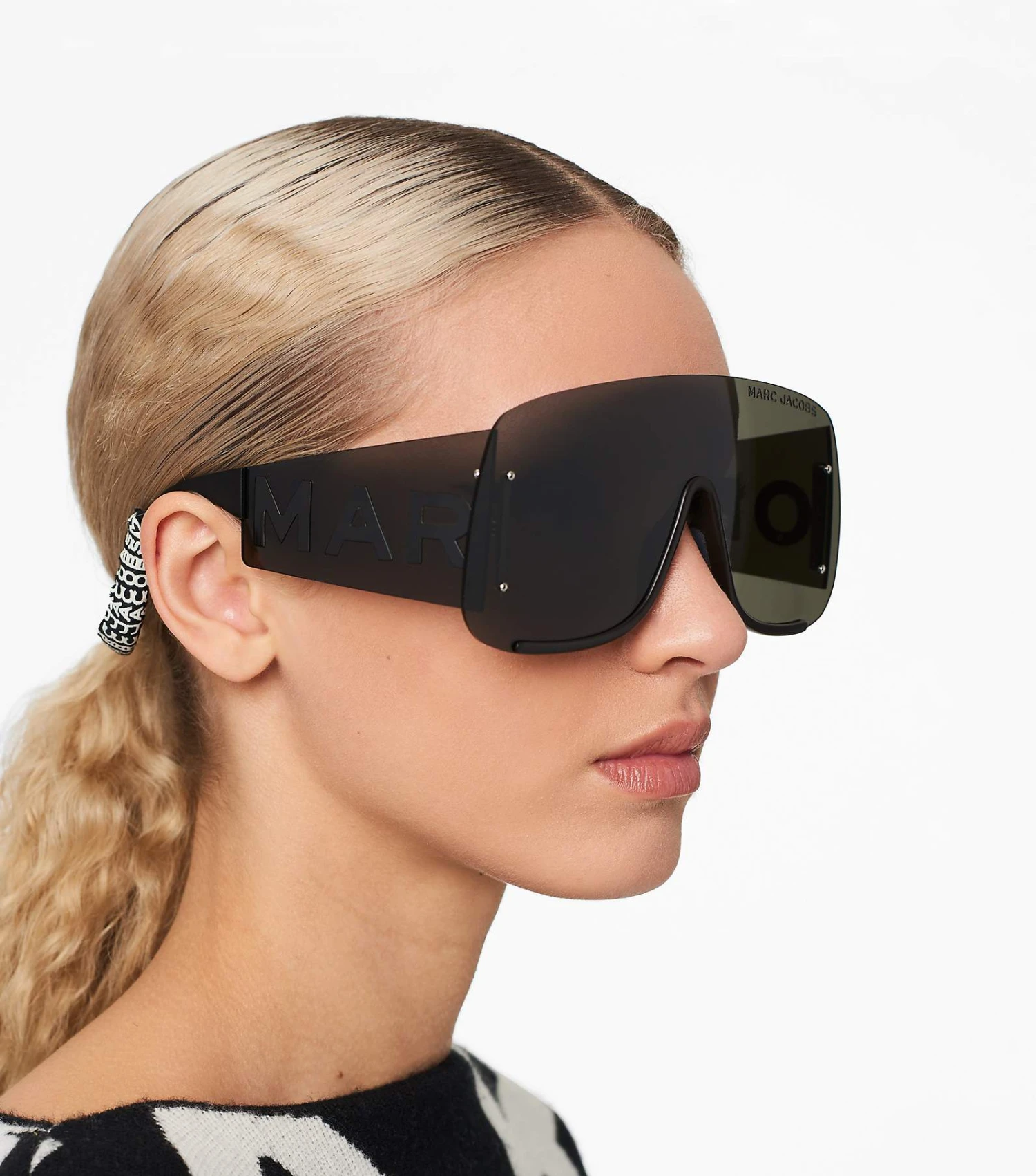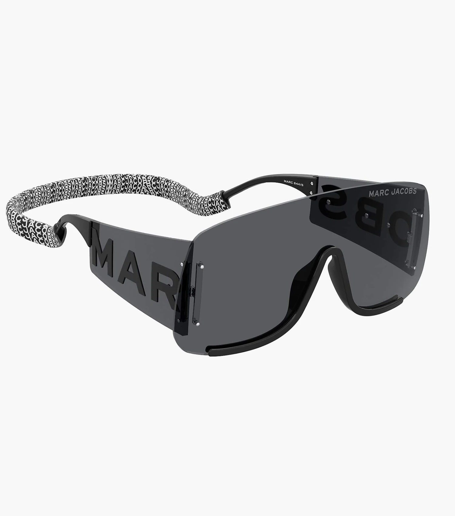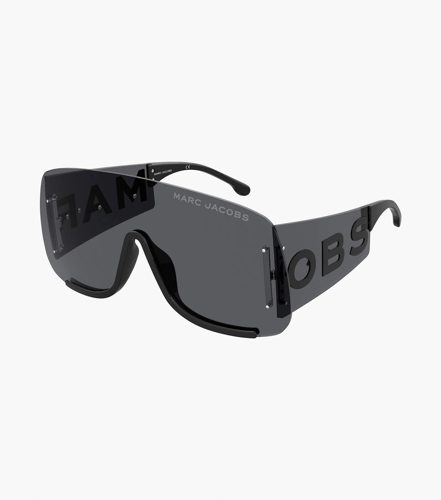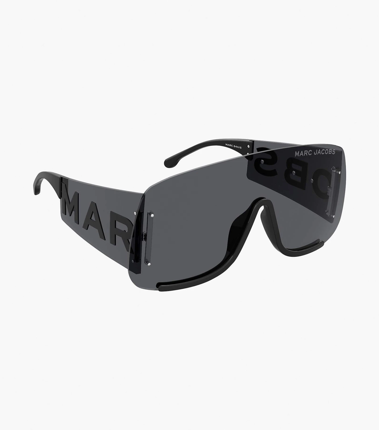 An oversized grey lens featuring metal lettering on the temple.