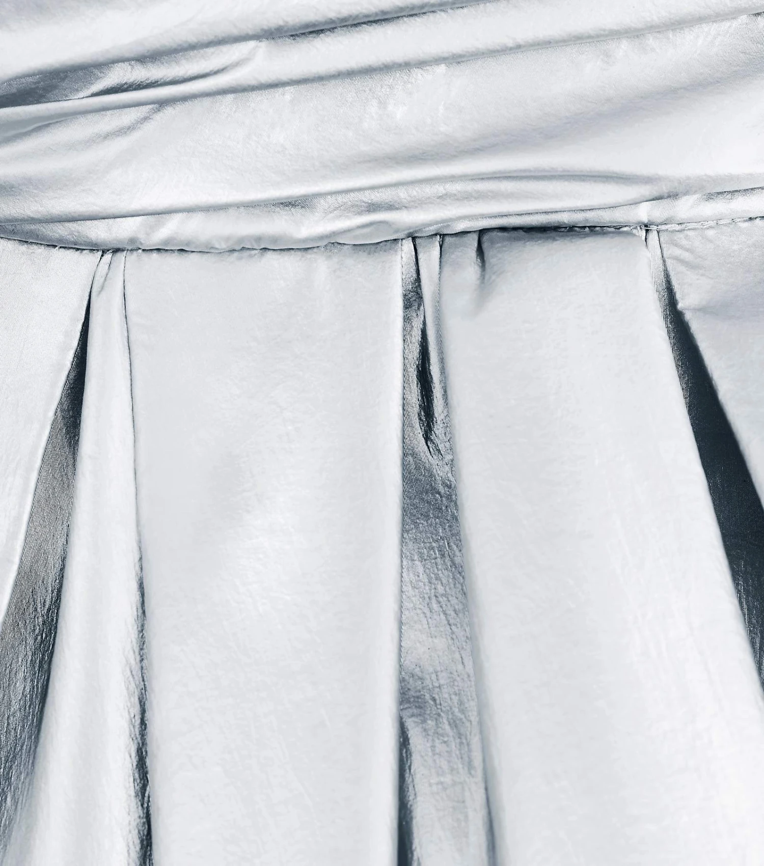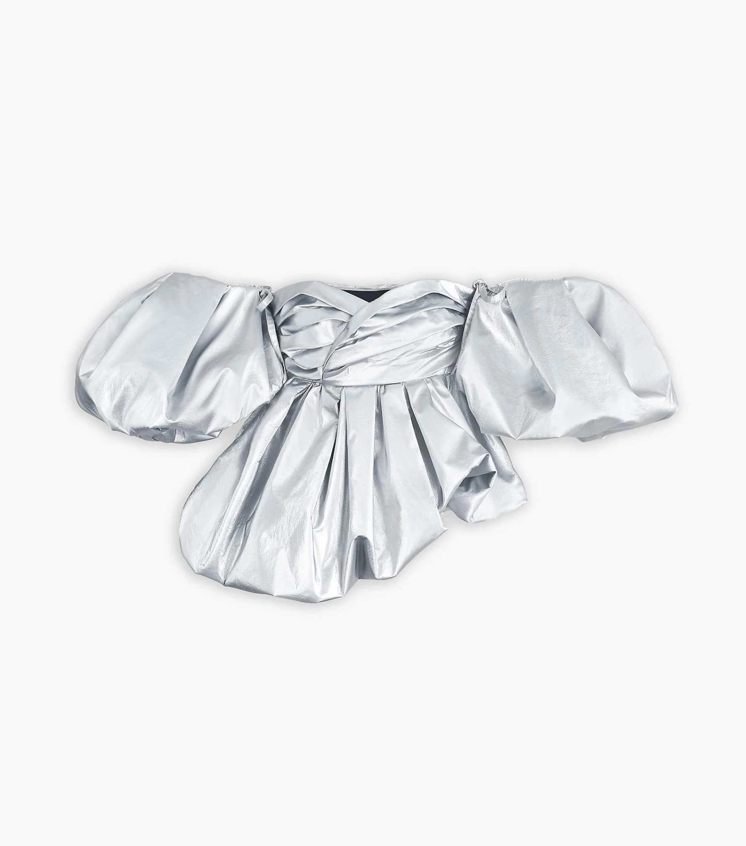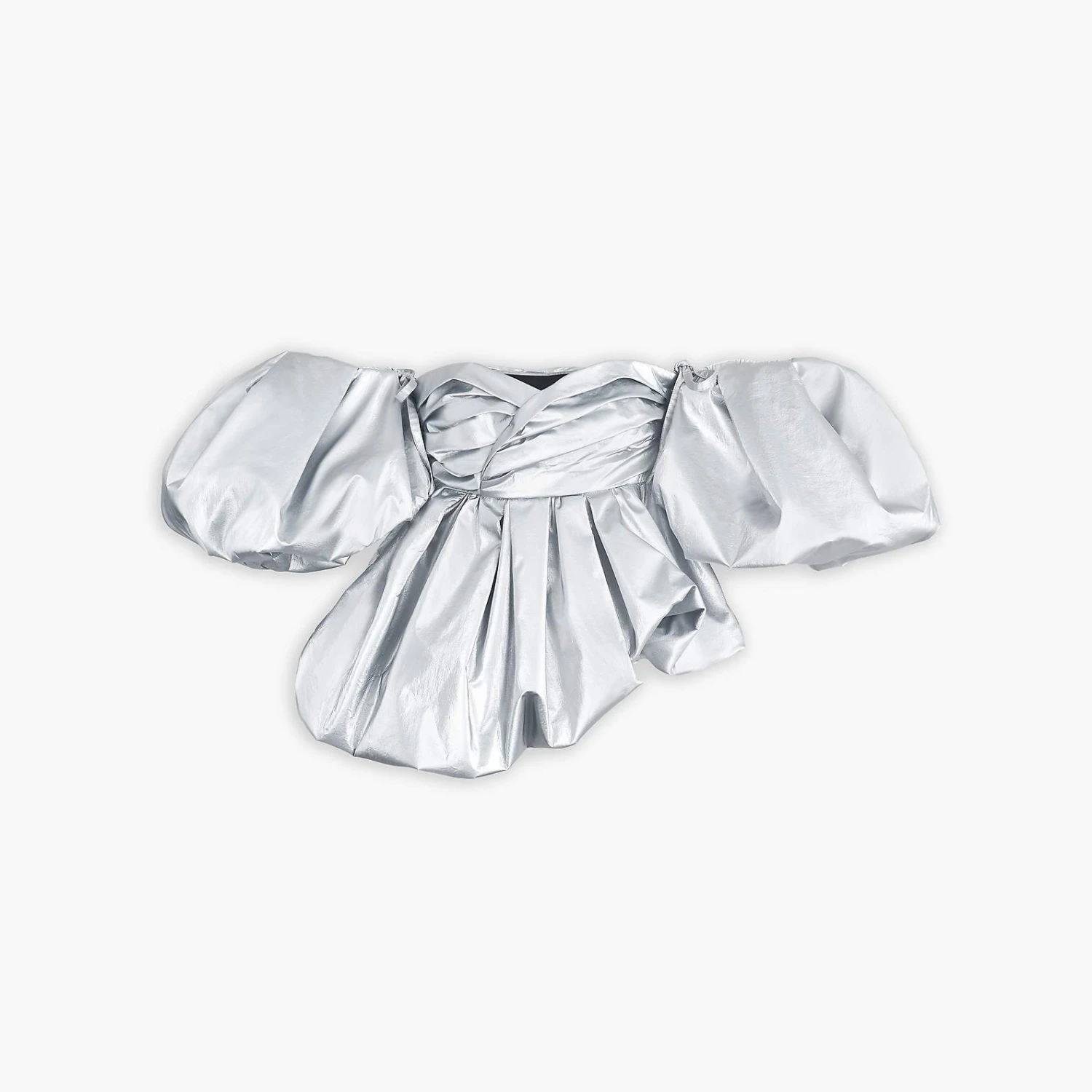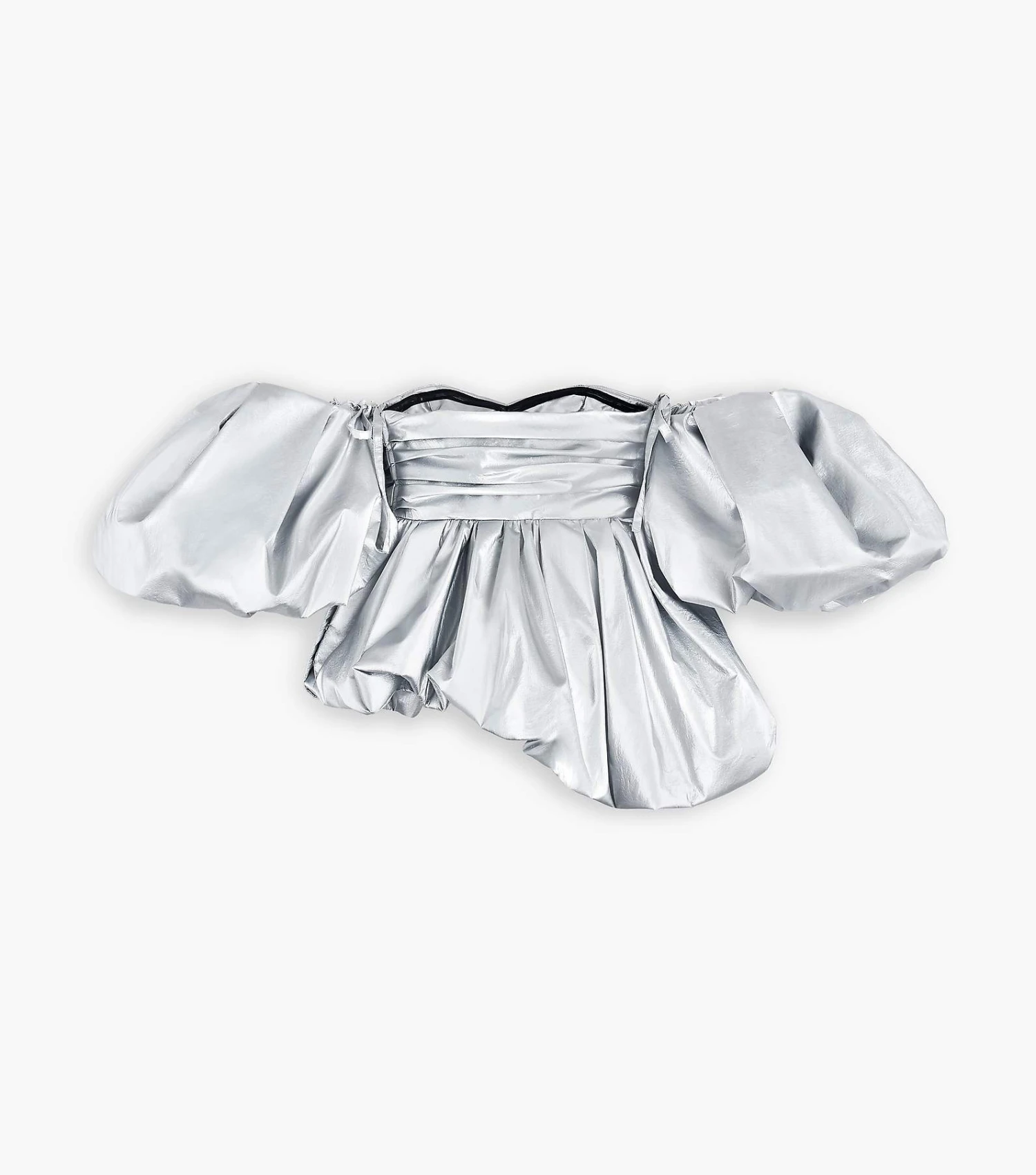 From couture to street. This statement-making piece is inspired by the voluminous silhouettes from the runway. Crafted in shiny nylon, this top is designed with a bubble hem and removable bubble sleeves to create puffed up dimension.