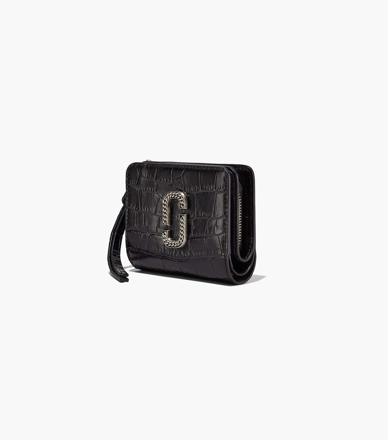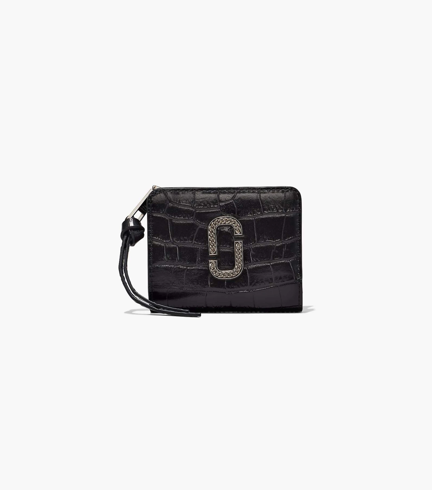 This crocodile-textured wallet is spotlighted by its glossy finish and antique silver chainlink hardware.