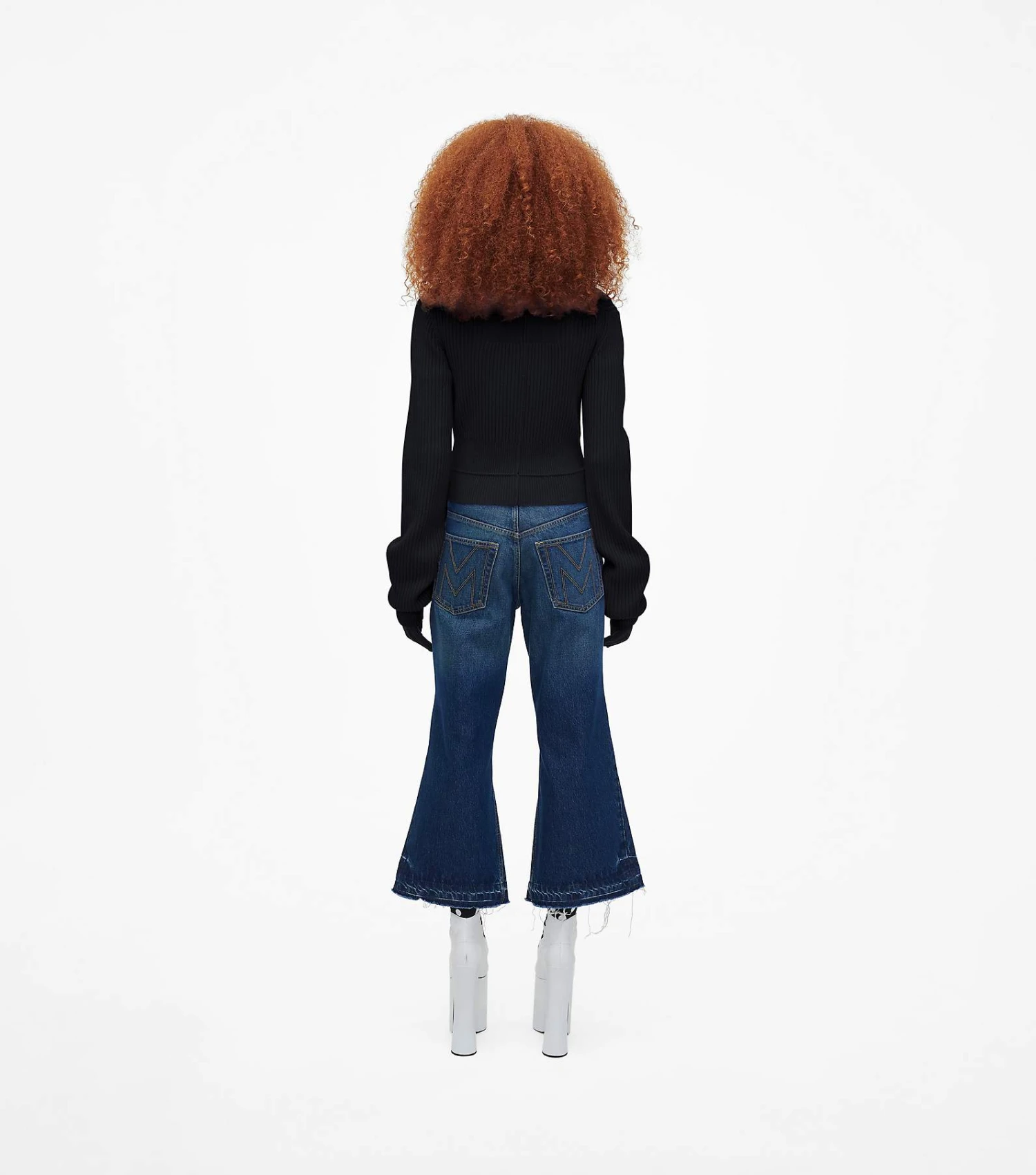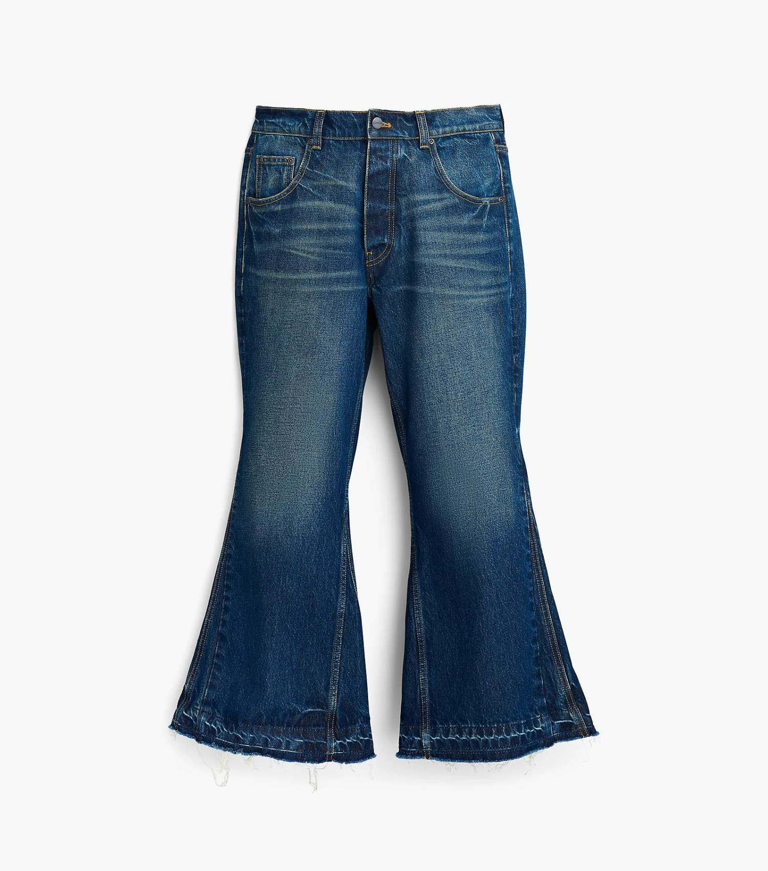 Inspired by the runway, reinterpreted for every day. These mid-rise flared jeans are washed in a signature cool-tinted dark indigo and feature the “M” stitch at the back pockets and the tonal leather logo patch. Each pair is finished with a raw-edge, flared cuff.