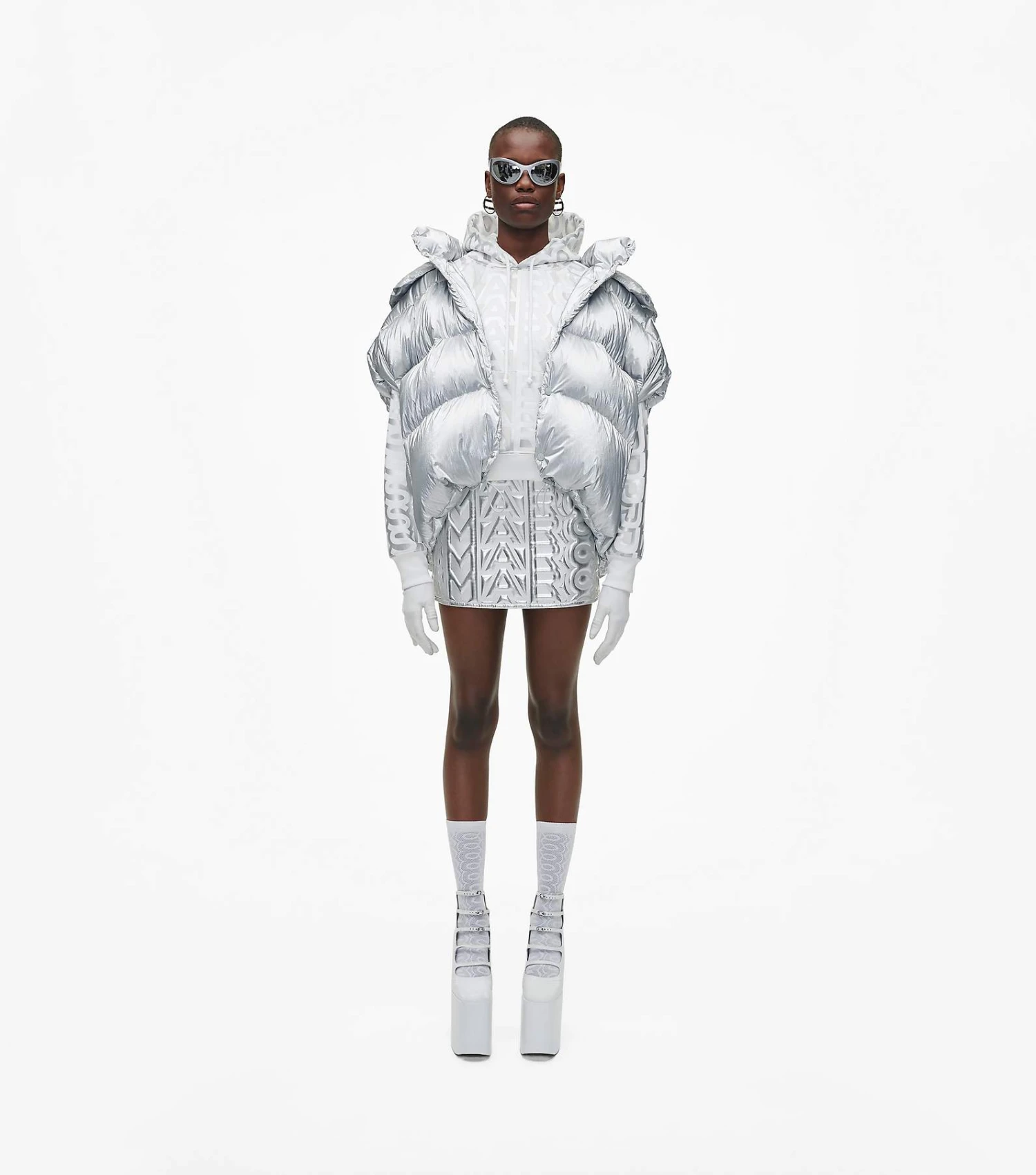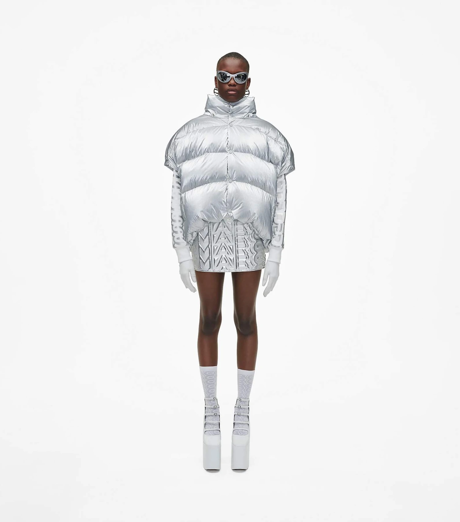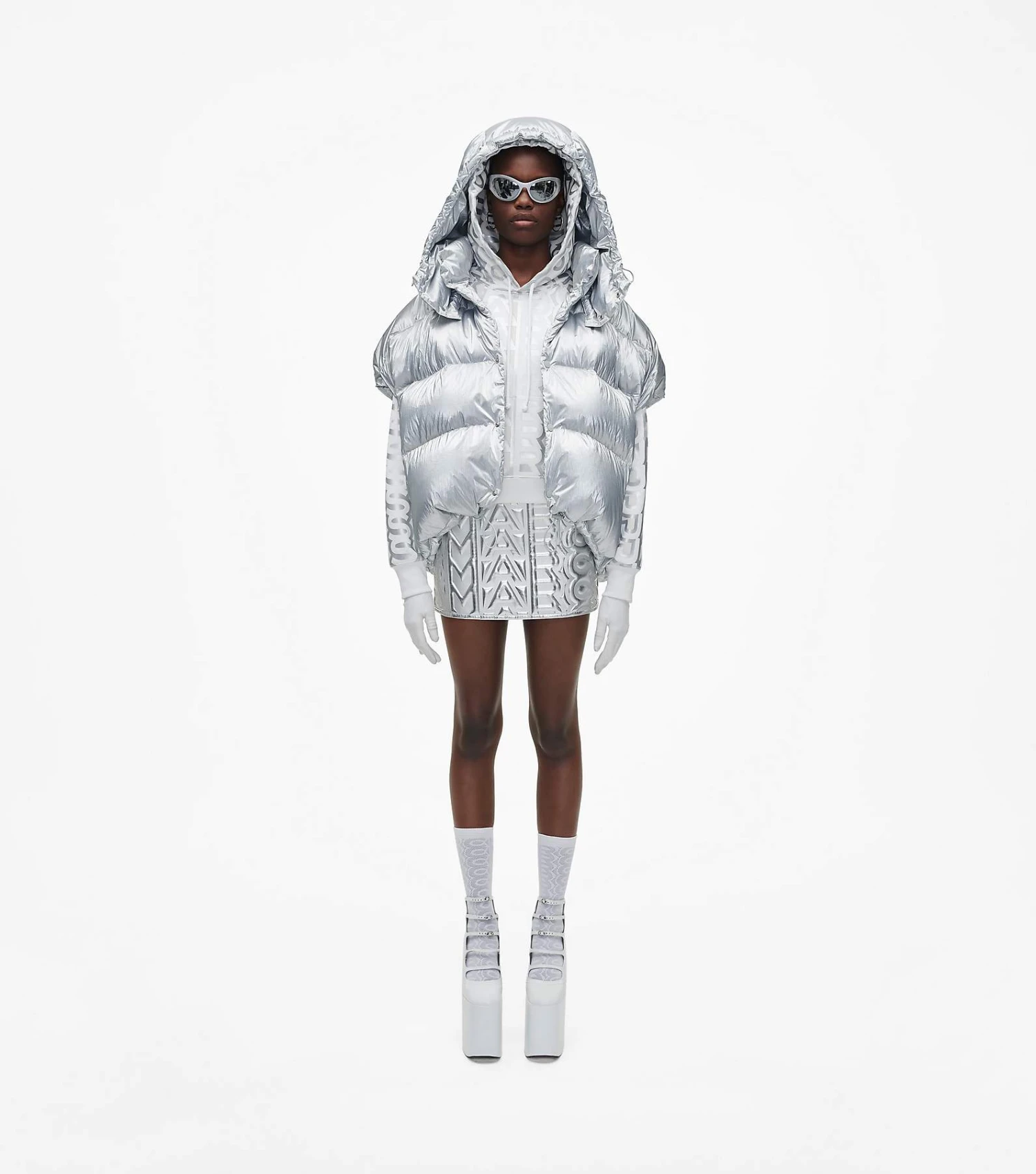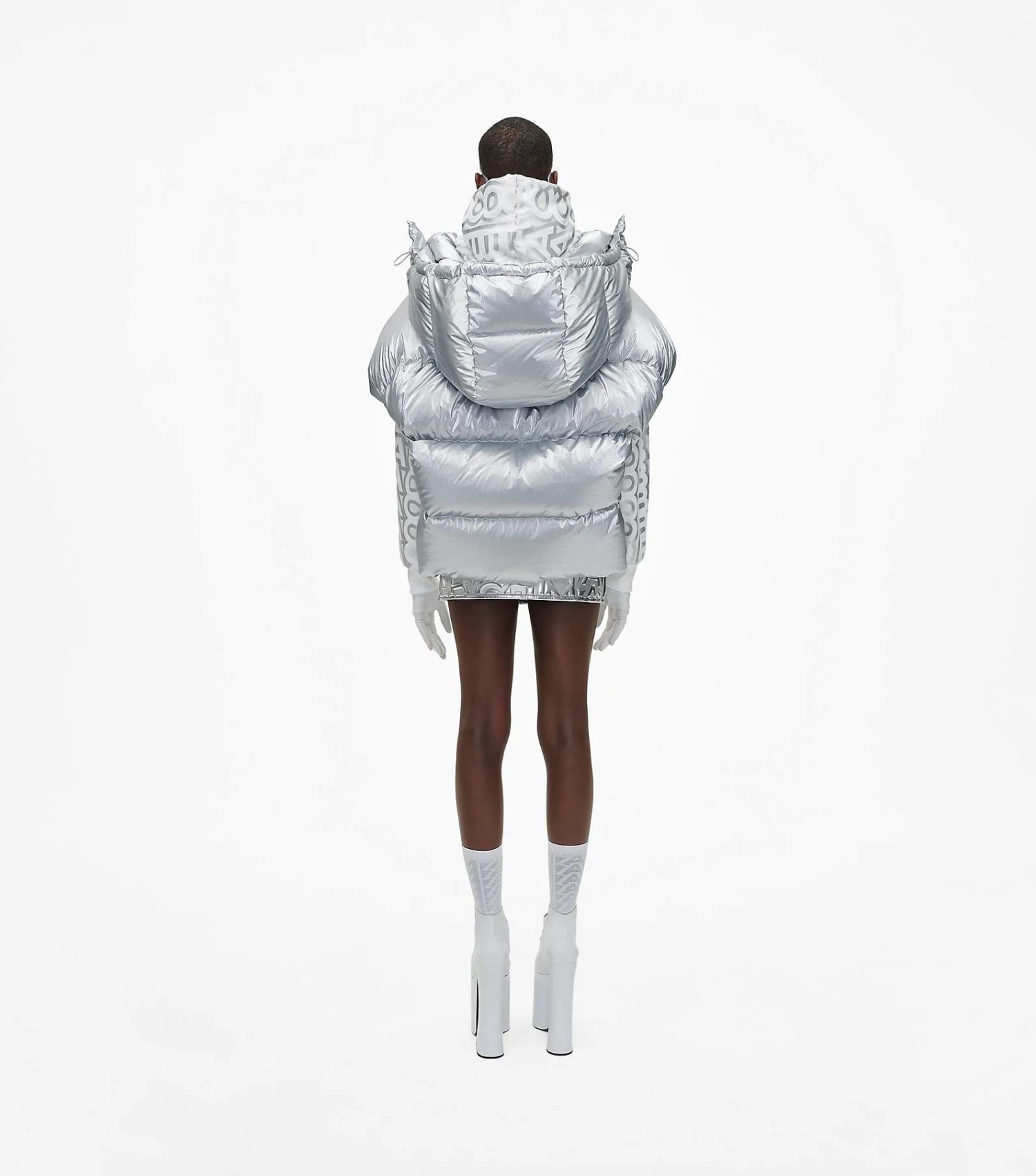 Inspired by the runway, reinterpreted for every day. This vest brings the edge in the season’s metallic silver. An oversized hood and bungee cords throughout create puffed-up shape and striking proportion.