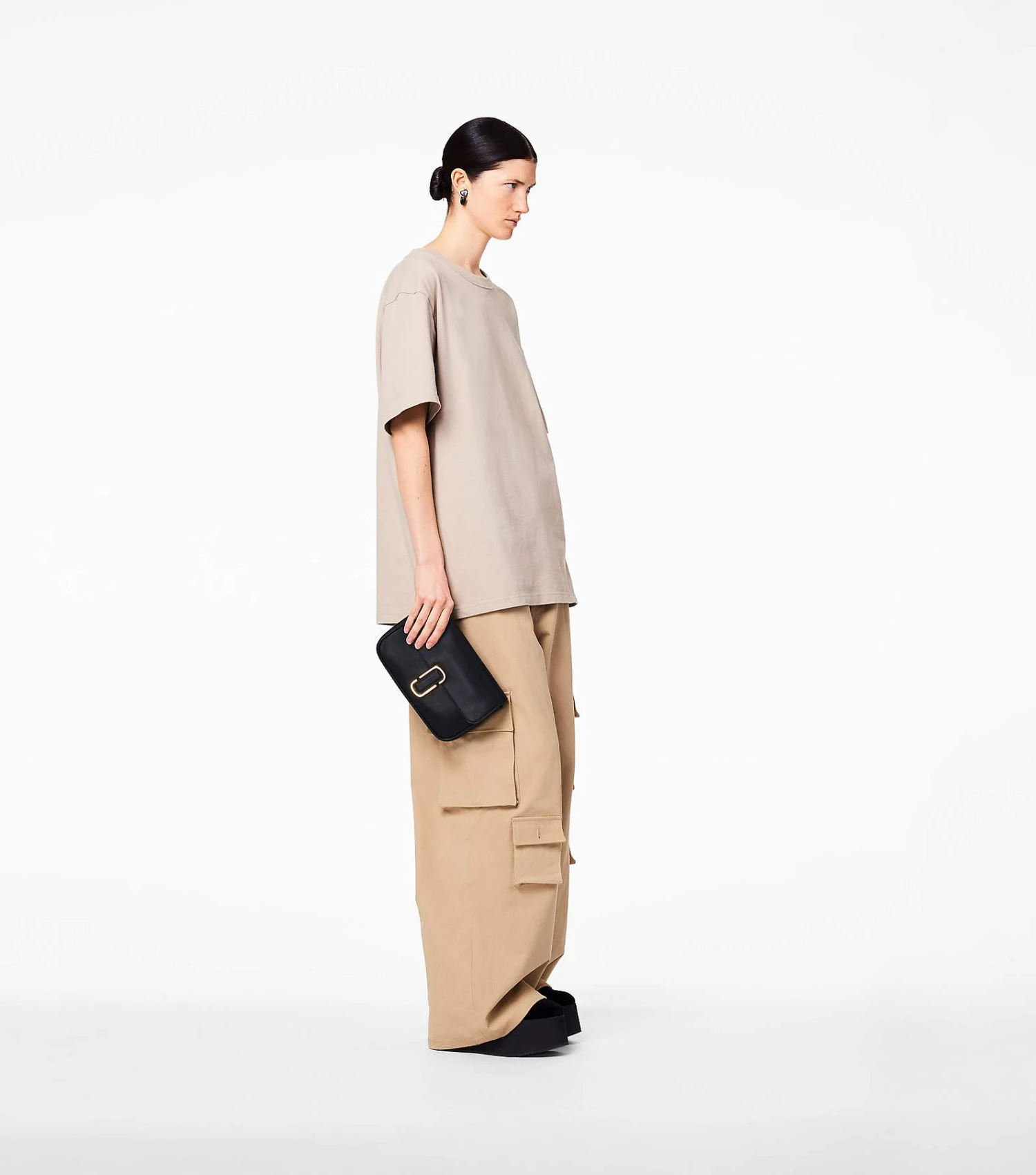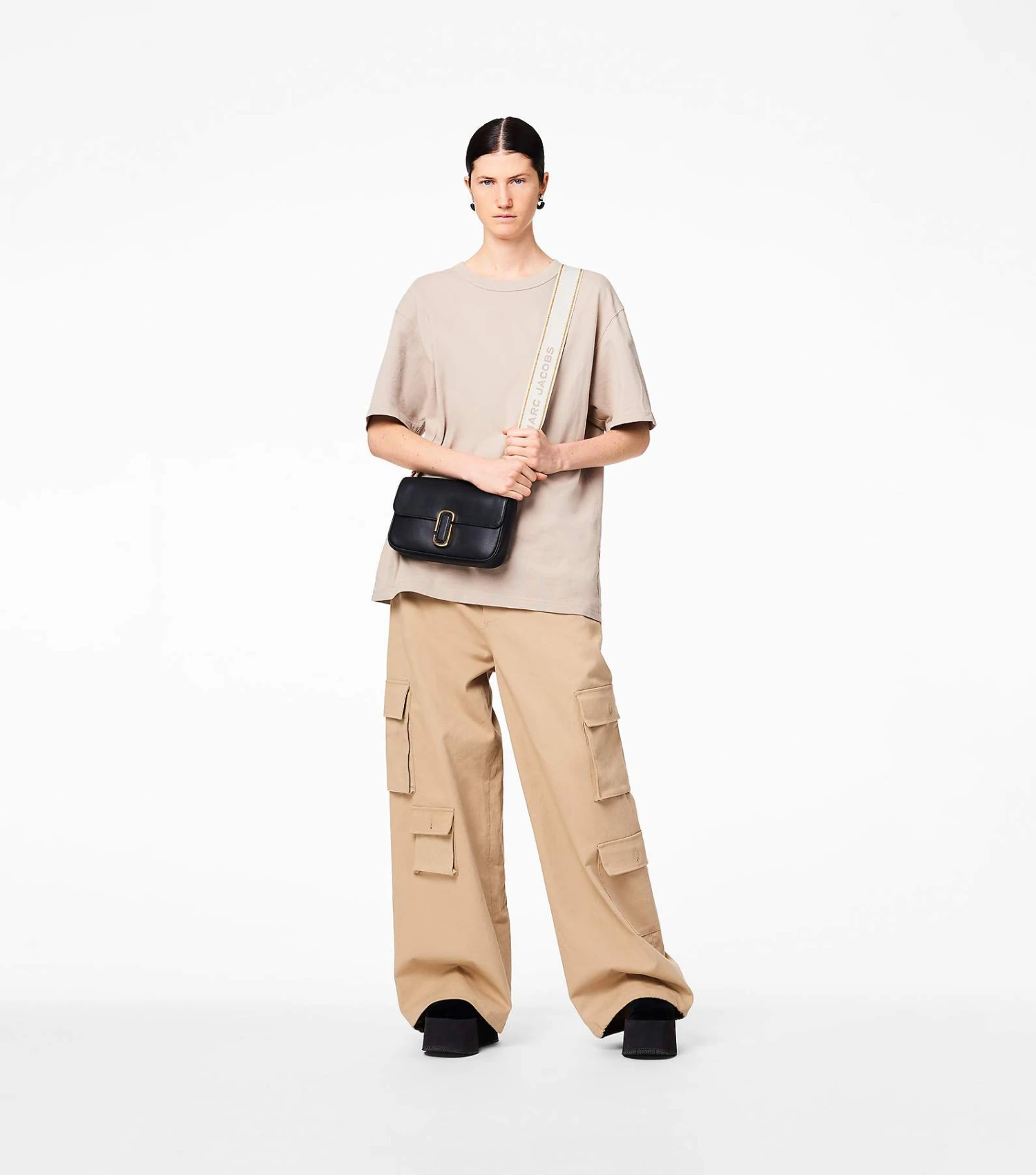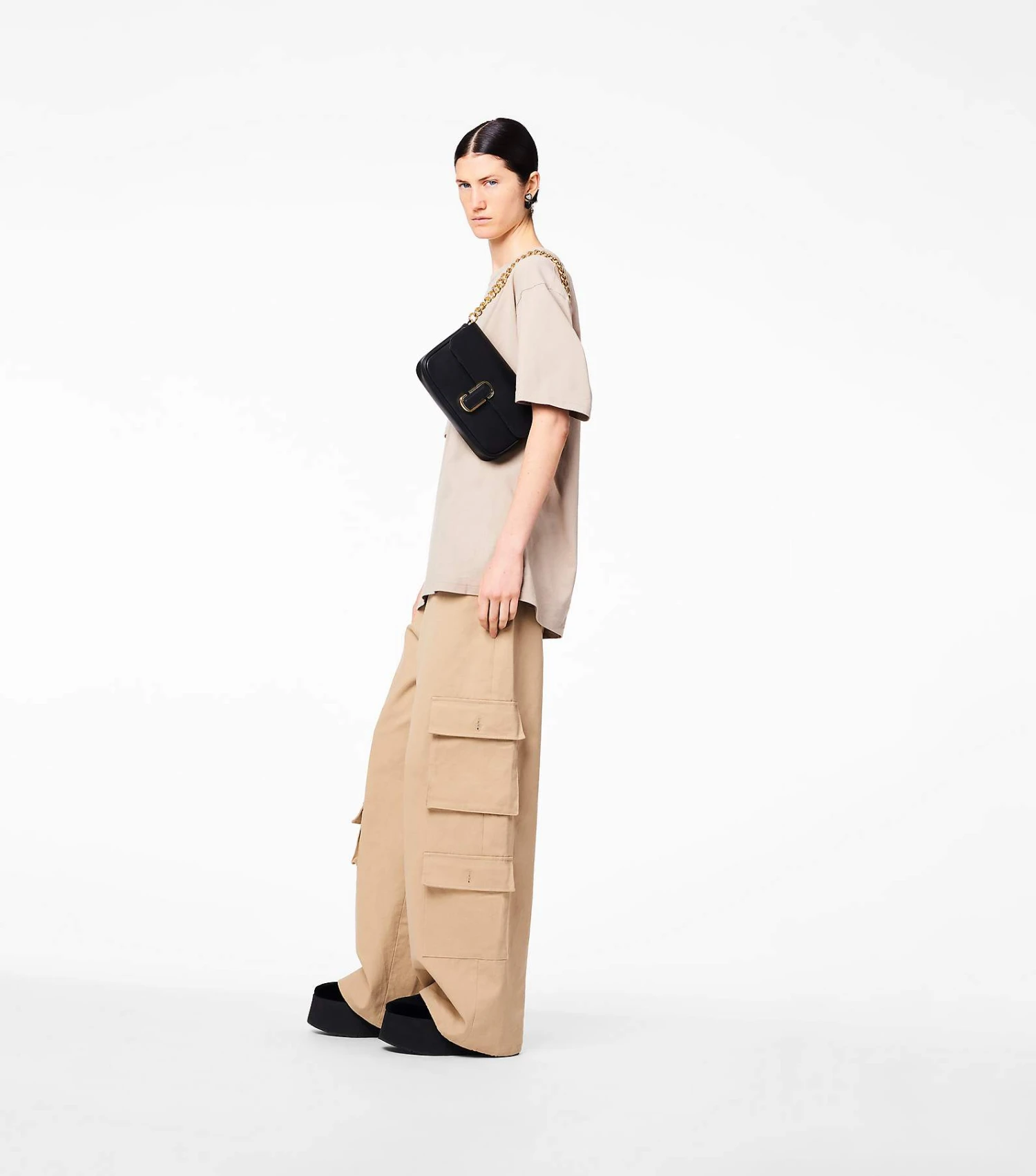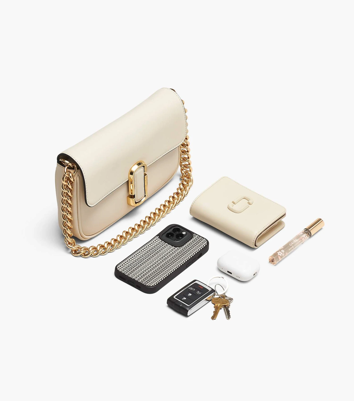 A shoulder bag crafted in smooth leather and sealed by the J Marc hardware. With three ways to wear, go from formal to casual by swapping the chain shoulder strap with the webbing crossbody strap, or carry it strapless as a clutch for a true evening moment.