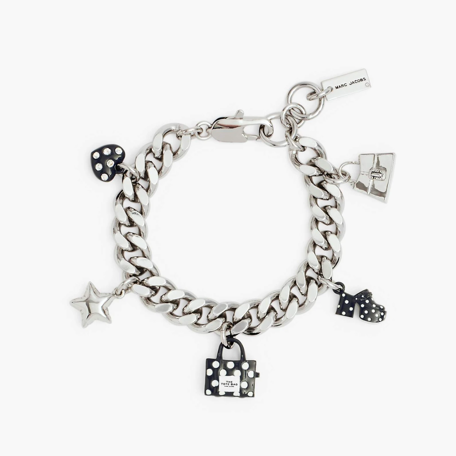 In the season’s bold spots, this charm bracelet reimagines the Marc Jacobs icons to new heights with charms designed after our signature tote, St. Marc, J Marc Clog, and more.