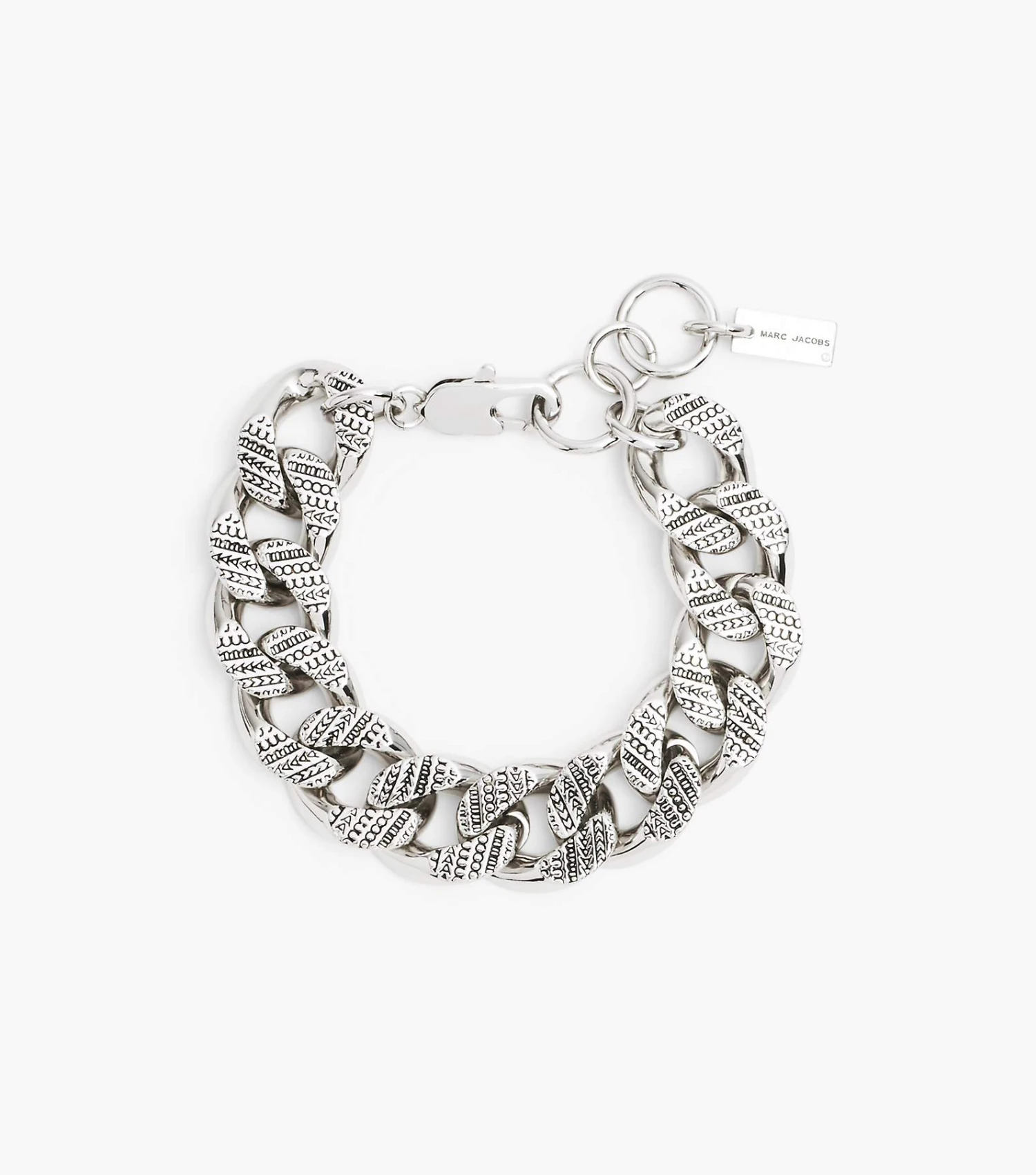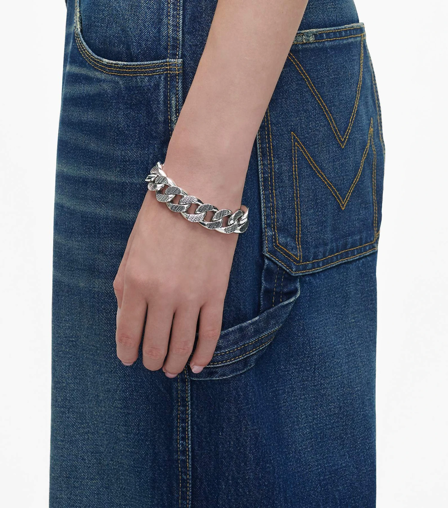 Monogram goes grunge in this chain link bracelet designed for a slightly oversized, chunky shape and finished with an engraved micro-scale monogram pattern throughout.