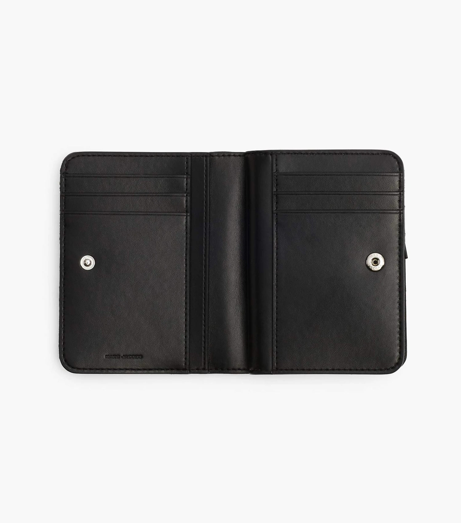 Woven monogram jacquard and leather offer a refined approach to organizing your affairs. Sealed by a snap closure, this mini compact wallet includes six card slots, one bill sleeve, four interior slip pockets, and one coin pouch with a double gusset for extra organization.