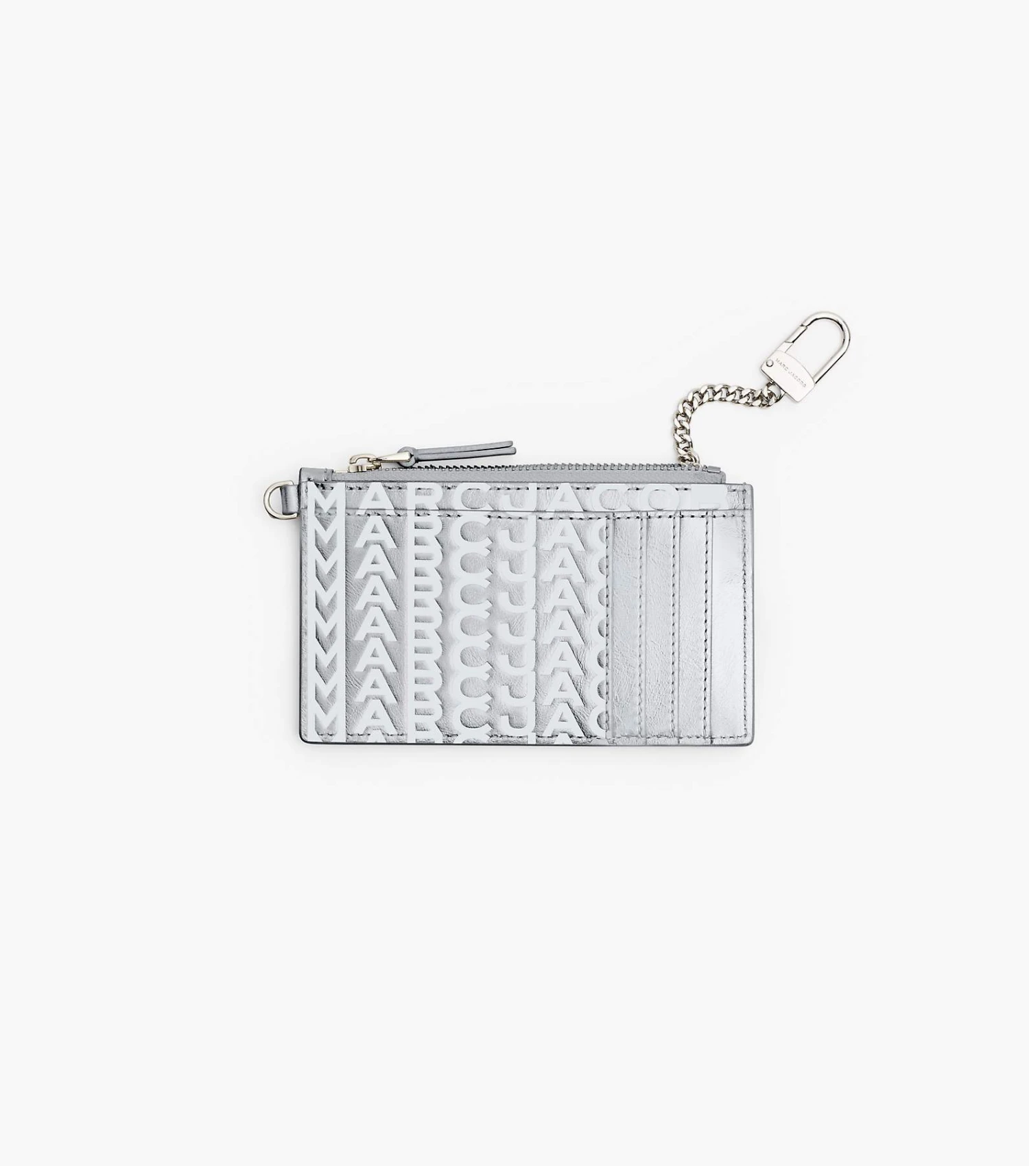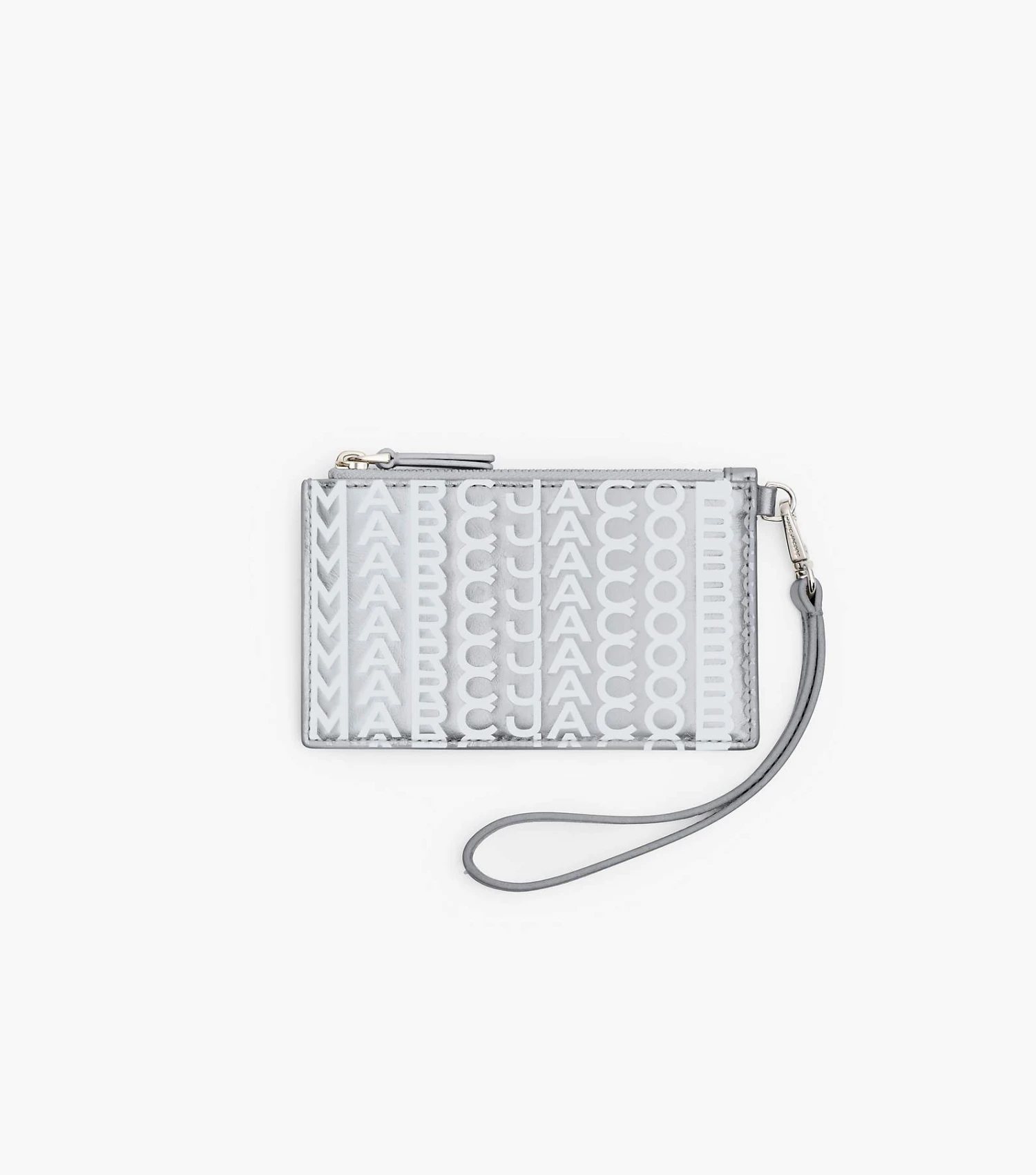 Striking metallic silver leather refreshes this monogram top zip wristlet wallet. It seals with a top-zip closure and includes four card slots, two front slip pockets, one top zip pocket, one chain with a key ring, and a removable wristlet strap. Pair back with the matching monogram metallic silver handbags to complete the set.