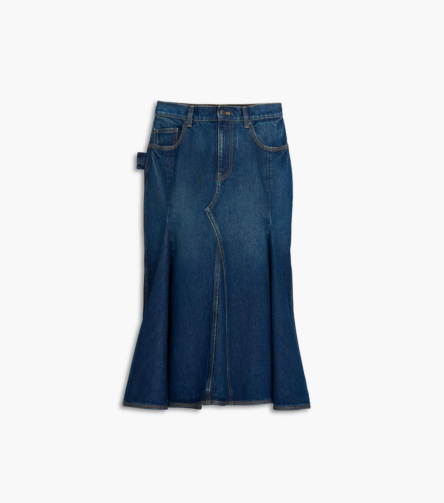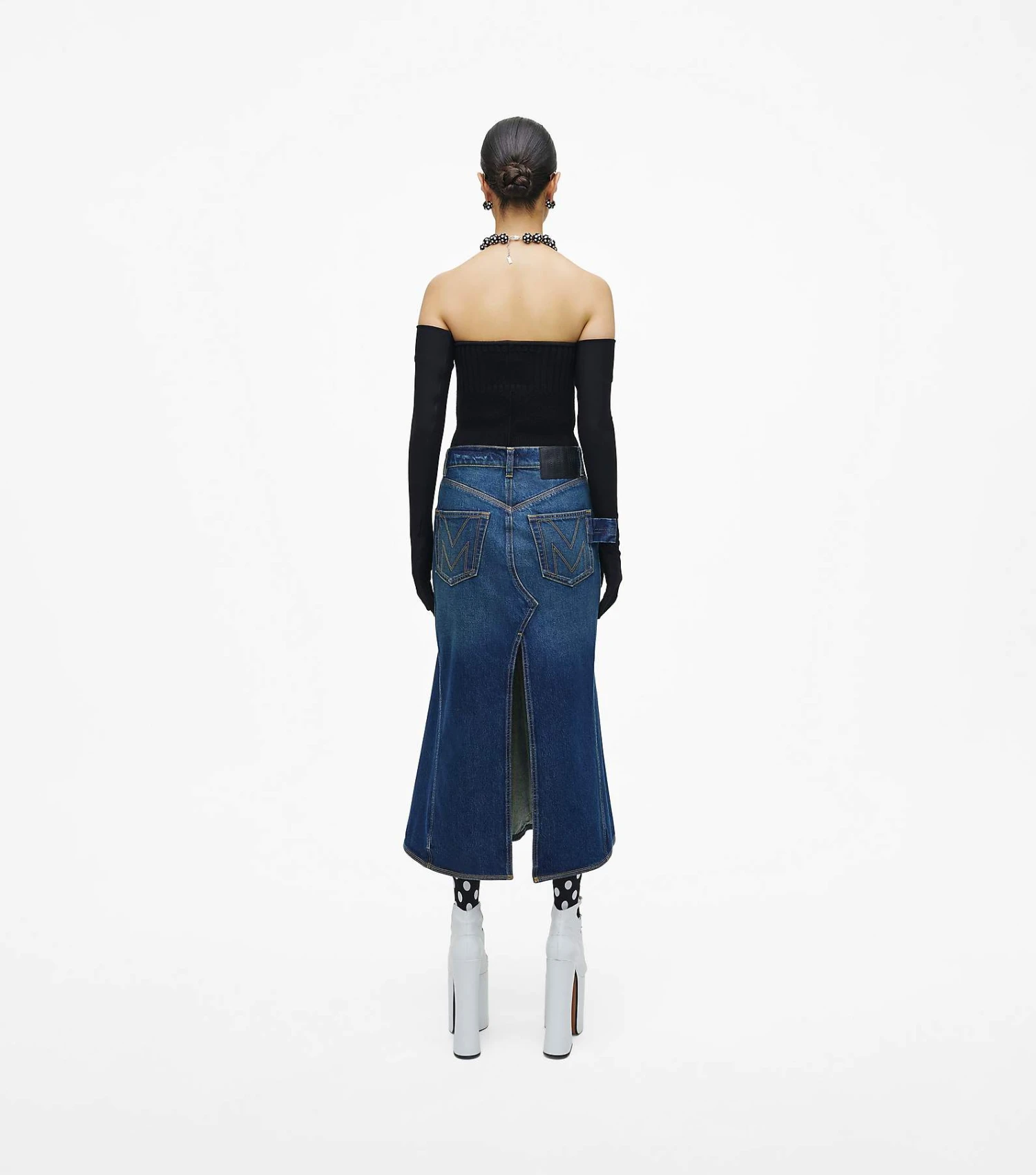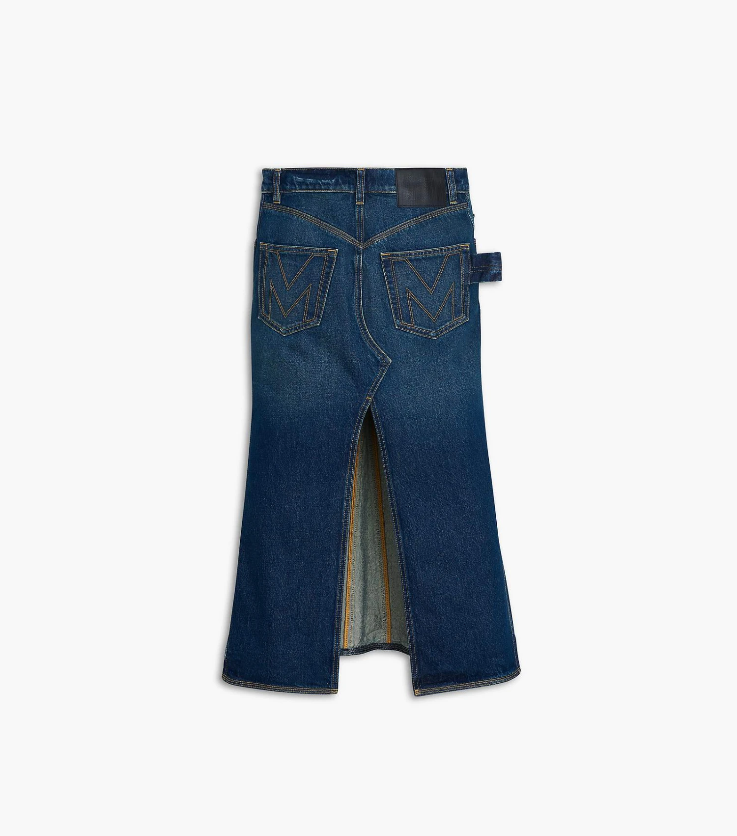 Crafted from a dark indigo wash, this mid-length denim skirt sits at a natural waist and flares slightly below the knee to create sweeping movement. This piece is finished with a sleek high slit at the back and an “M” stitched at the back pockets.