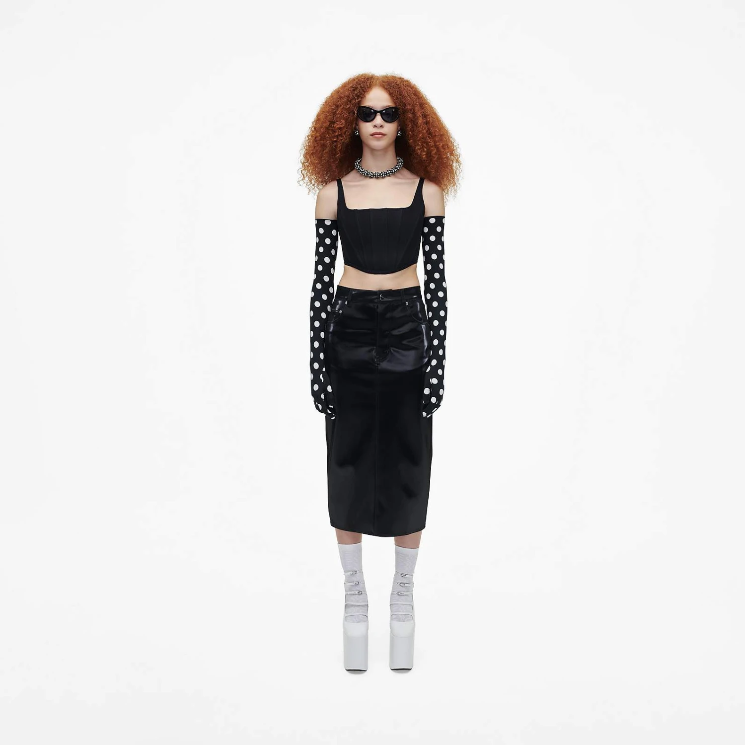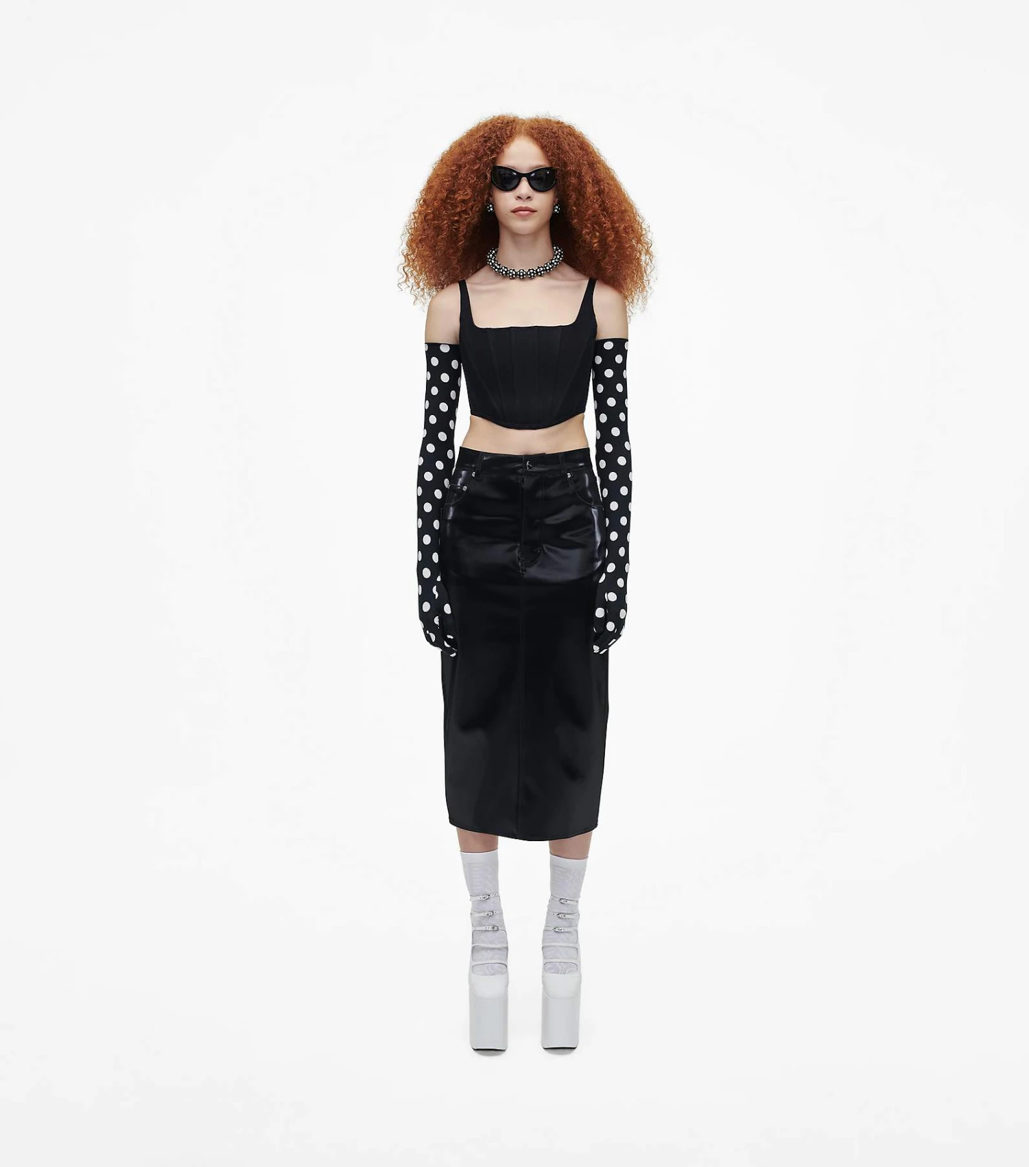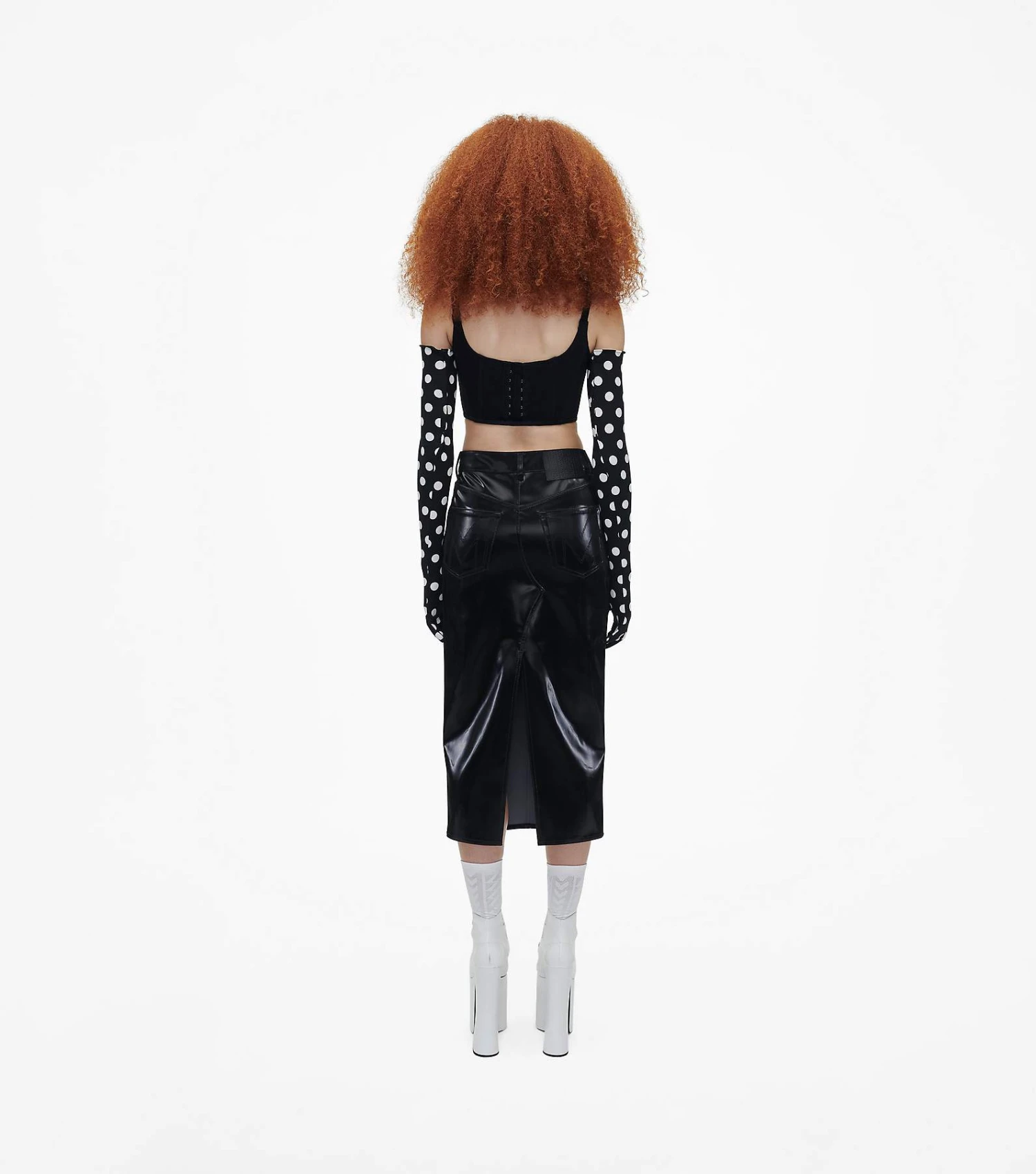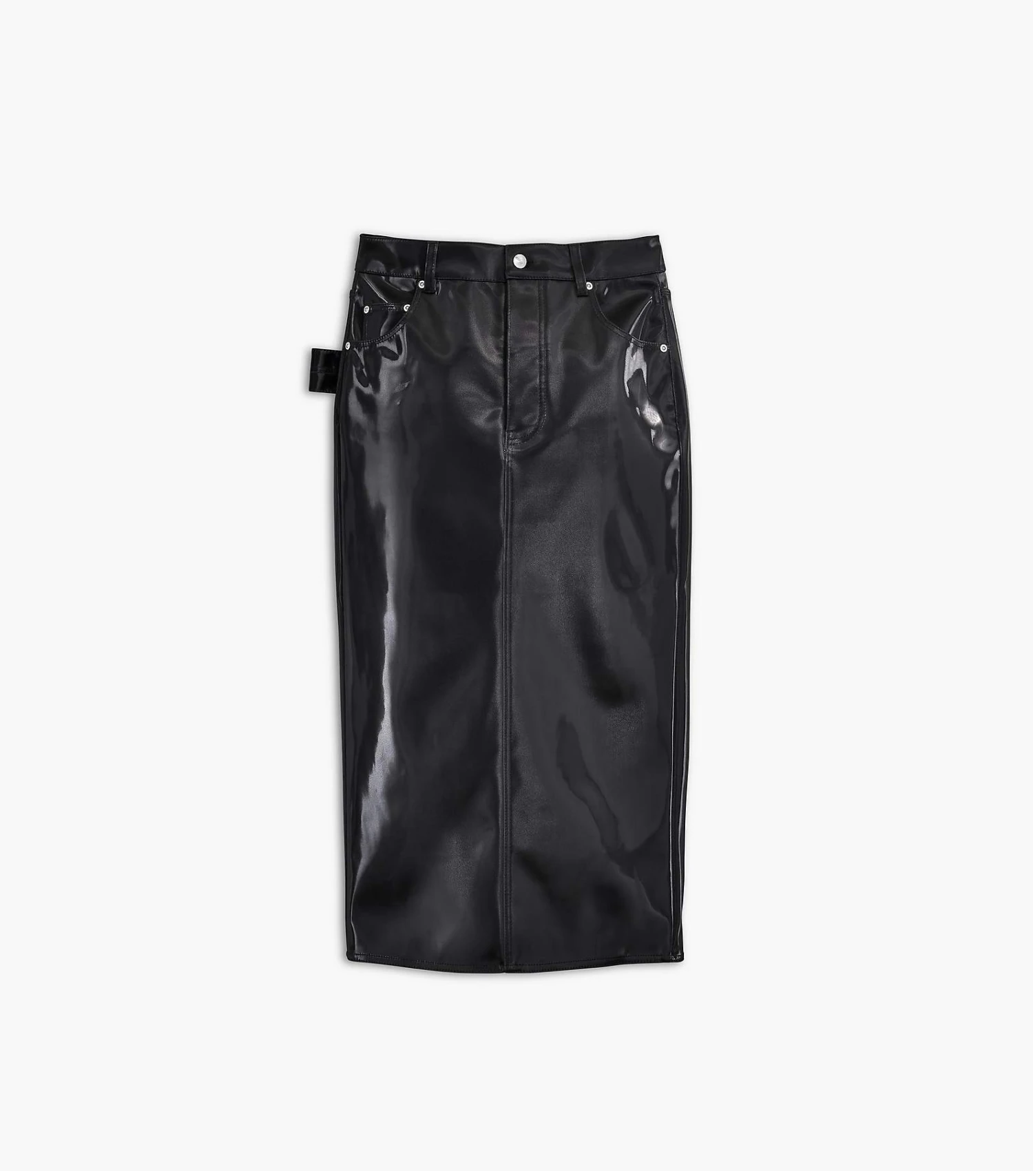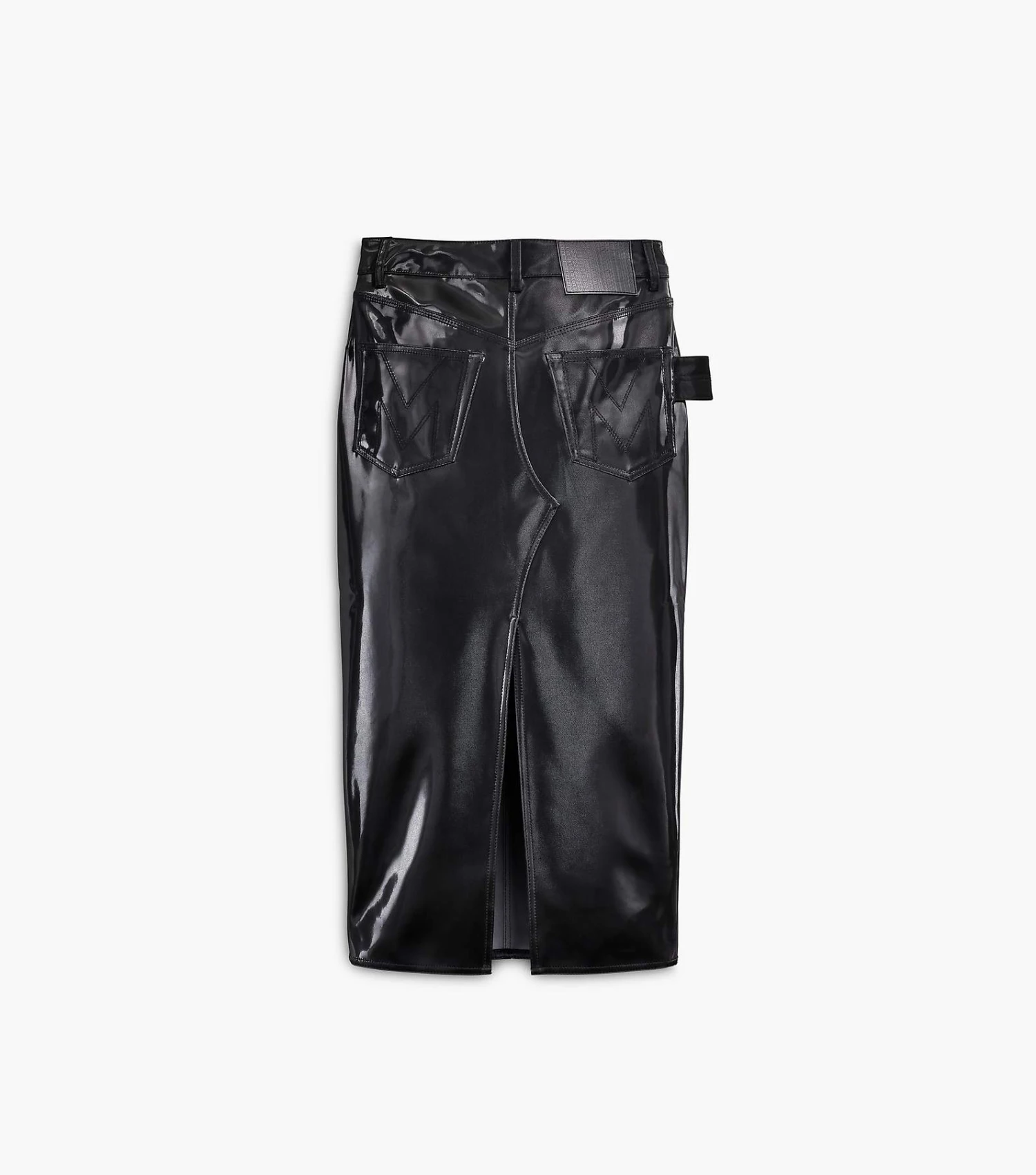 Crafted in a reflective faux leather, this slim skirt is designed for a glossy finish with an “M” stitched at the back pockets. Pair with the matching Inspired by our Reflective Trucker Jacket to complete the look.
