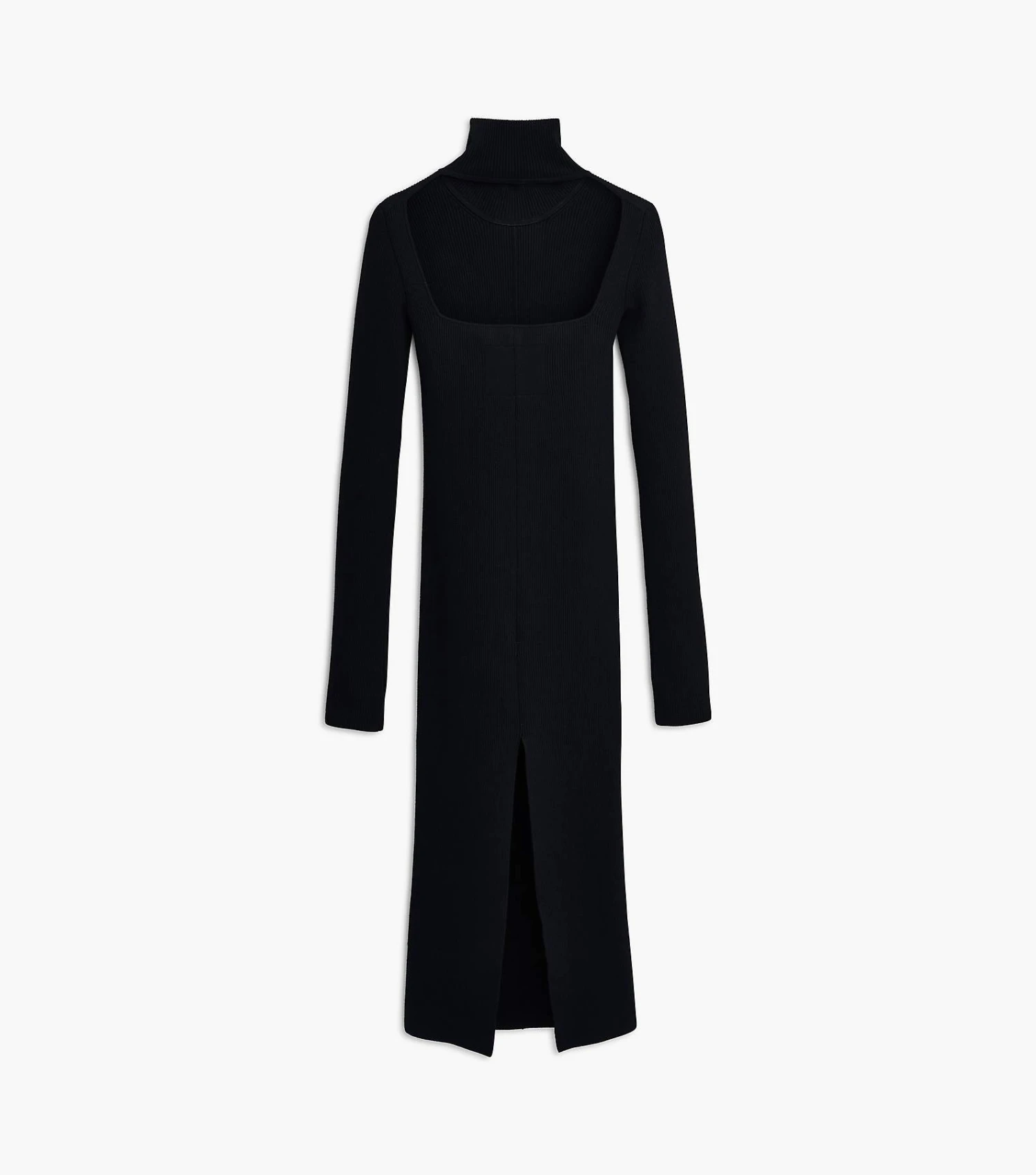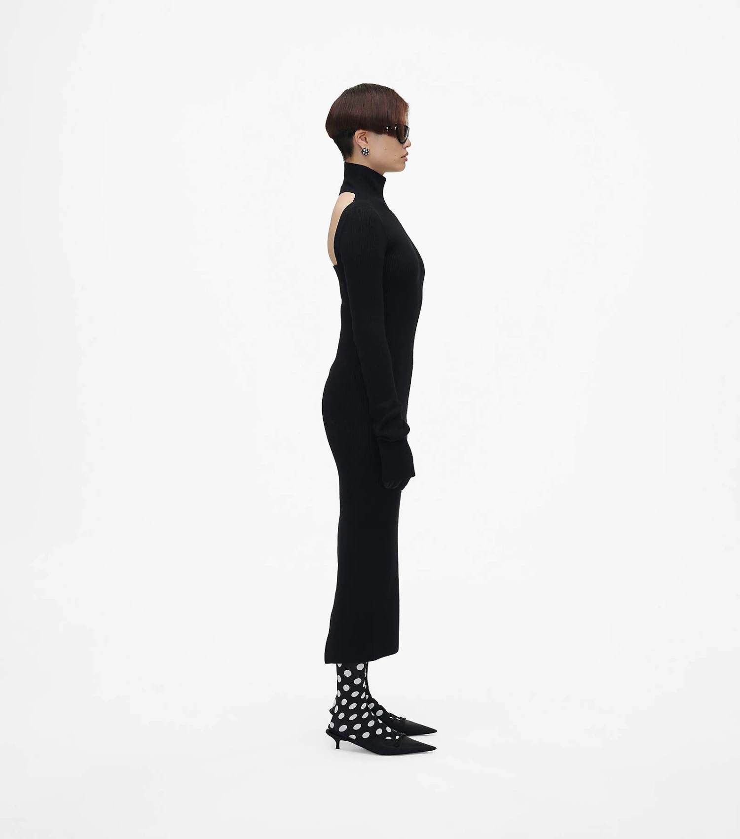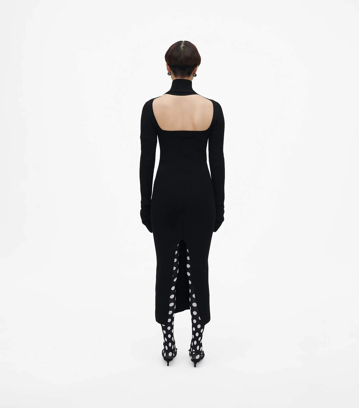 A one-of-a-kind piece. This reversible knit dress can be worn two ways with the opening revealing decolletage or exposing the back. The dress is complete with intricate hand-linked seams and thumbholes at the sleeve cuffs.