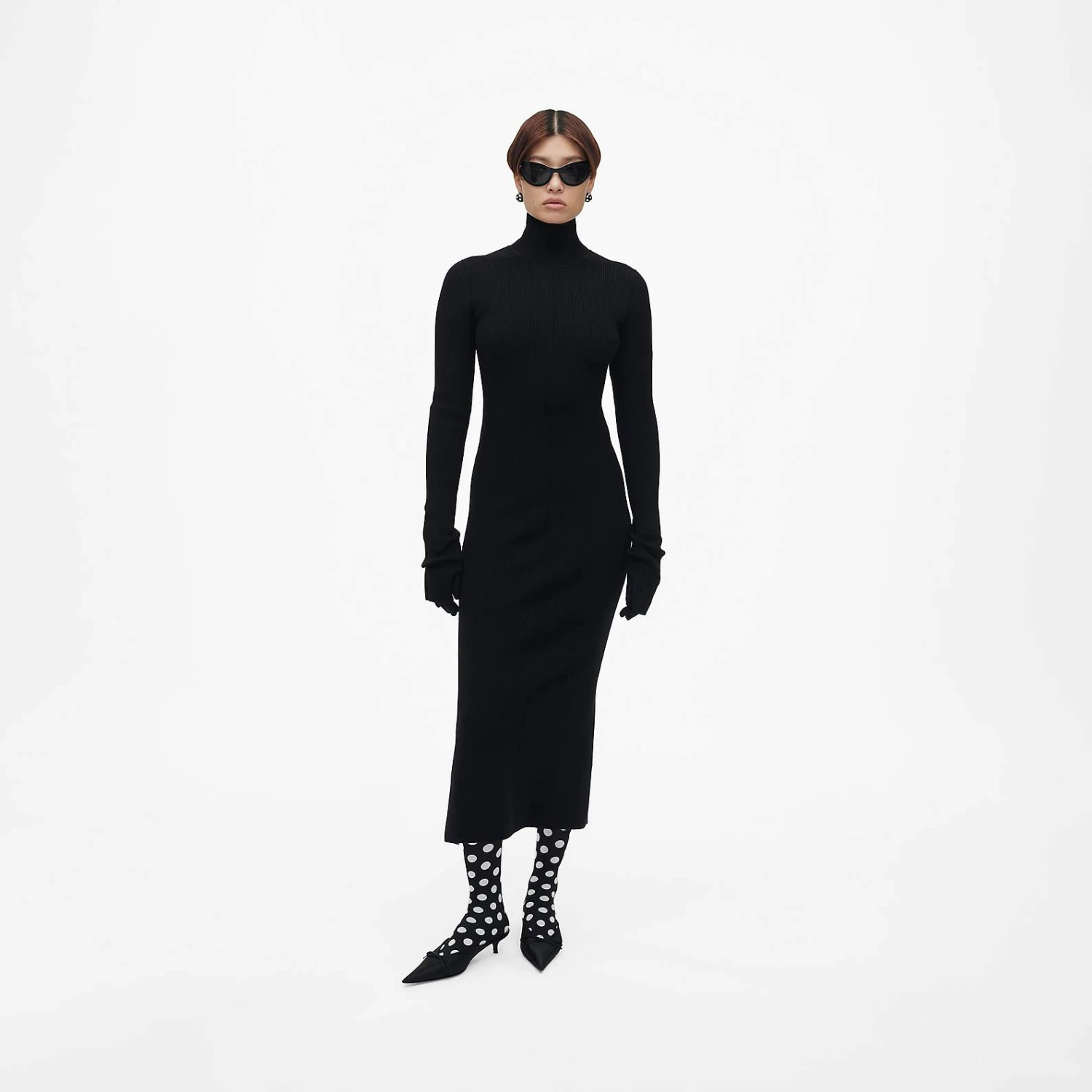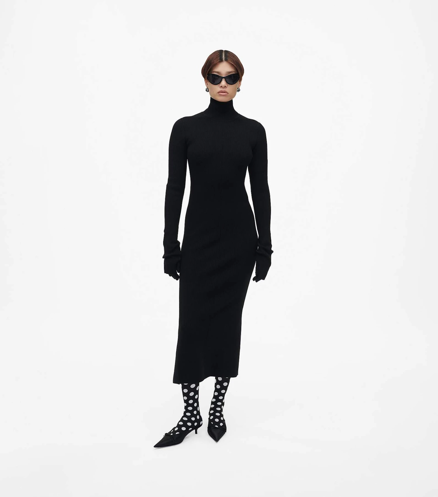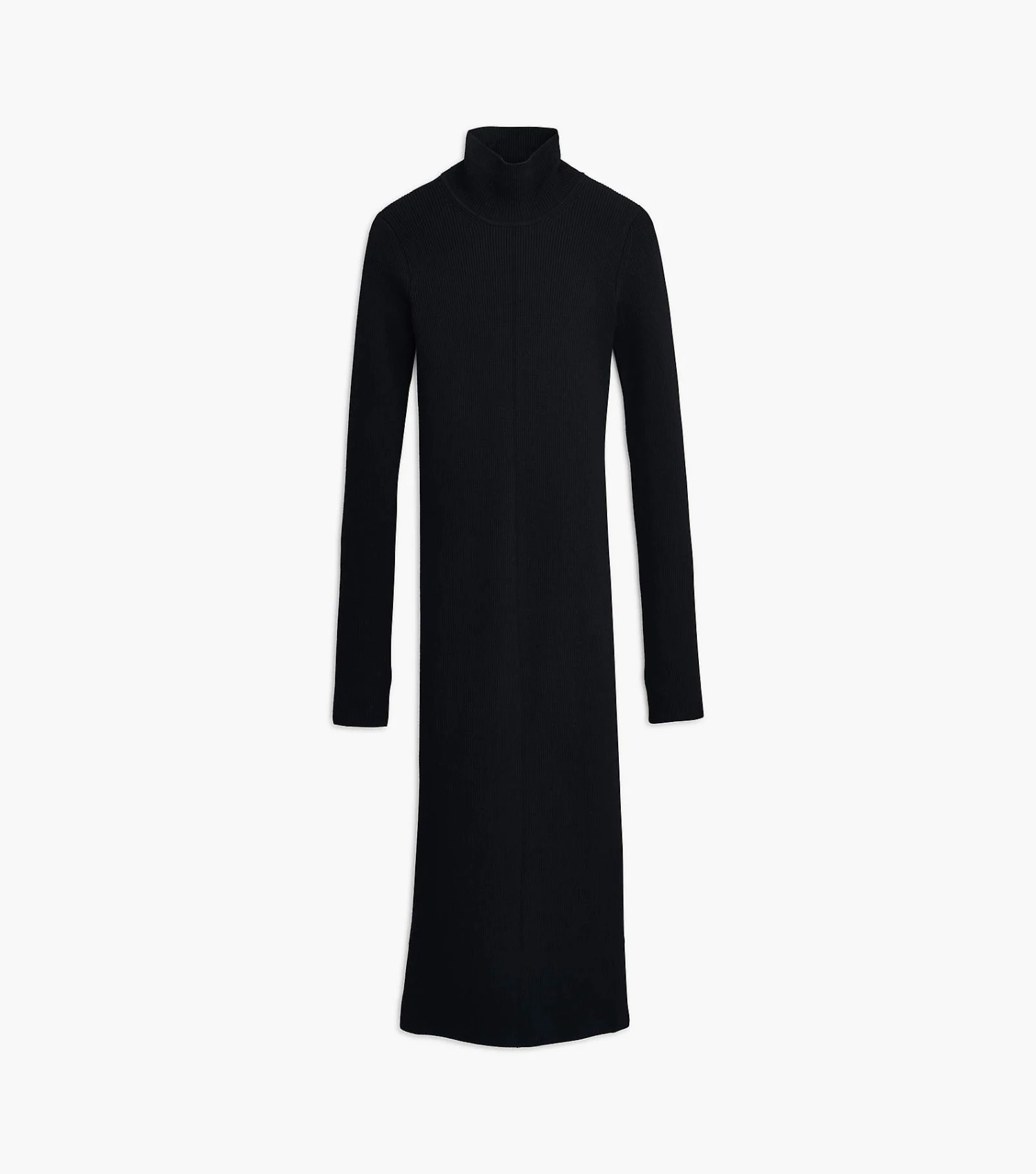 A one-of-a-kind piece. This reversible knit dress can be worn two ways with the opening revealing decolletage or exposing the back. The dress is complete with intricate hand-linked seams and thumbholes at the sleeve cuffs.
