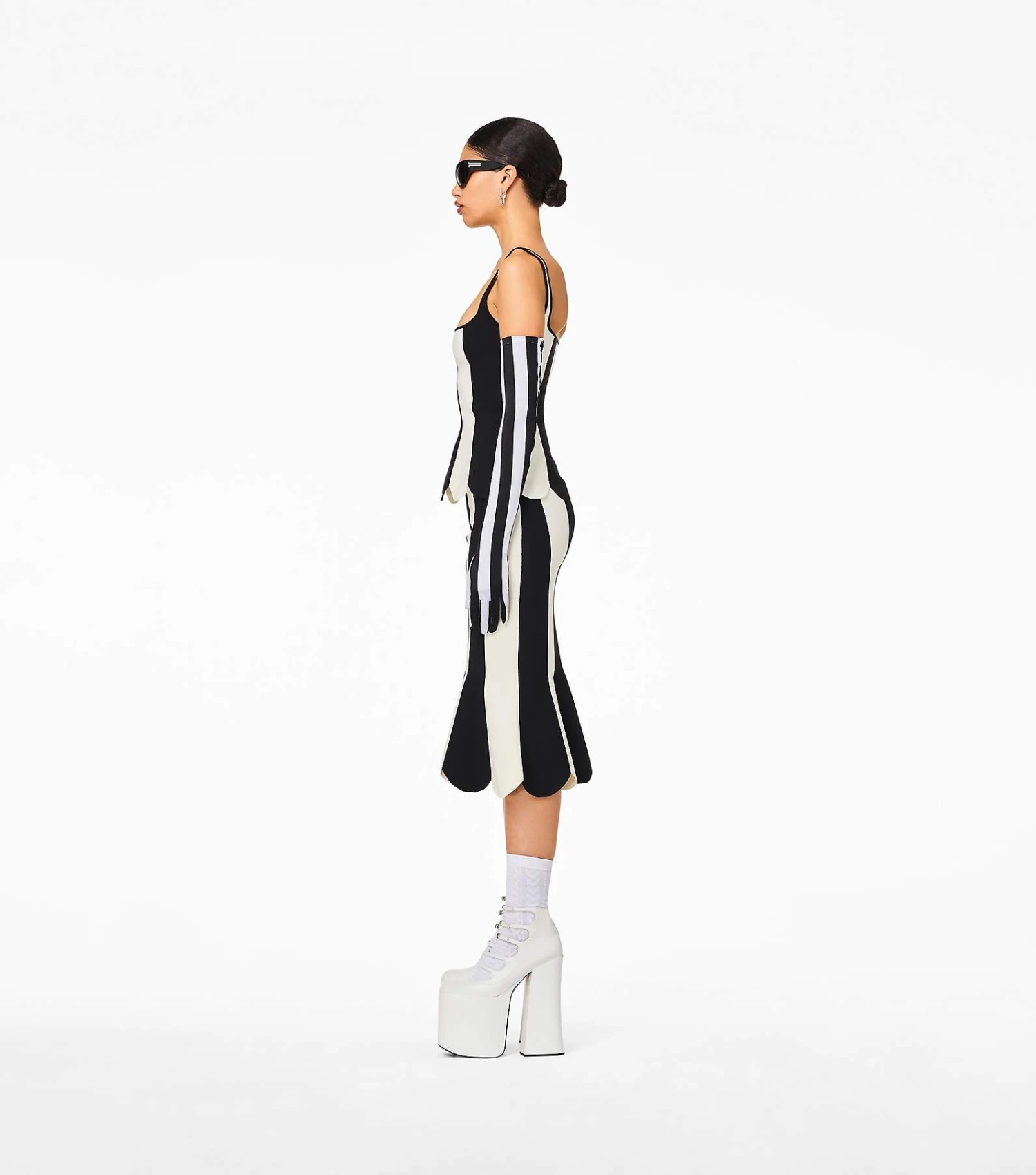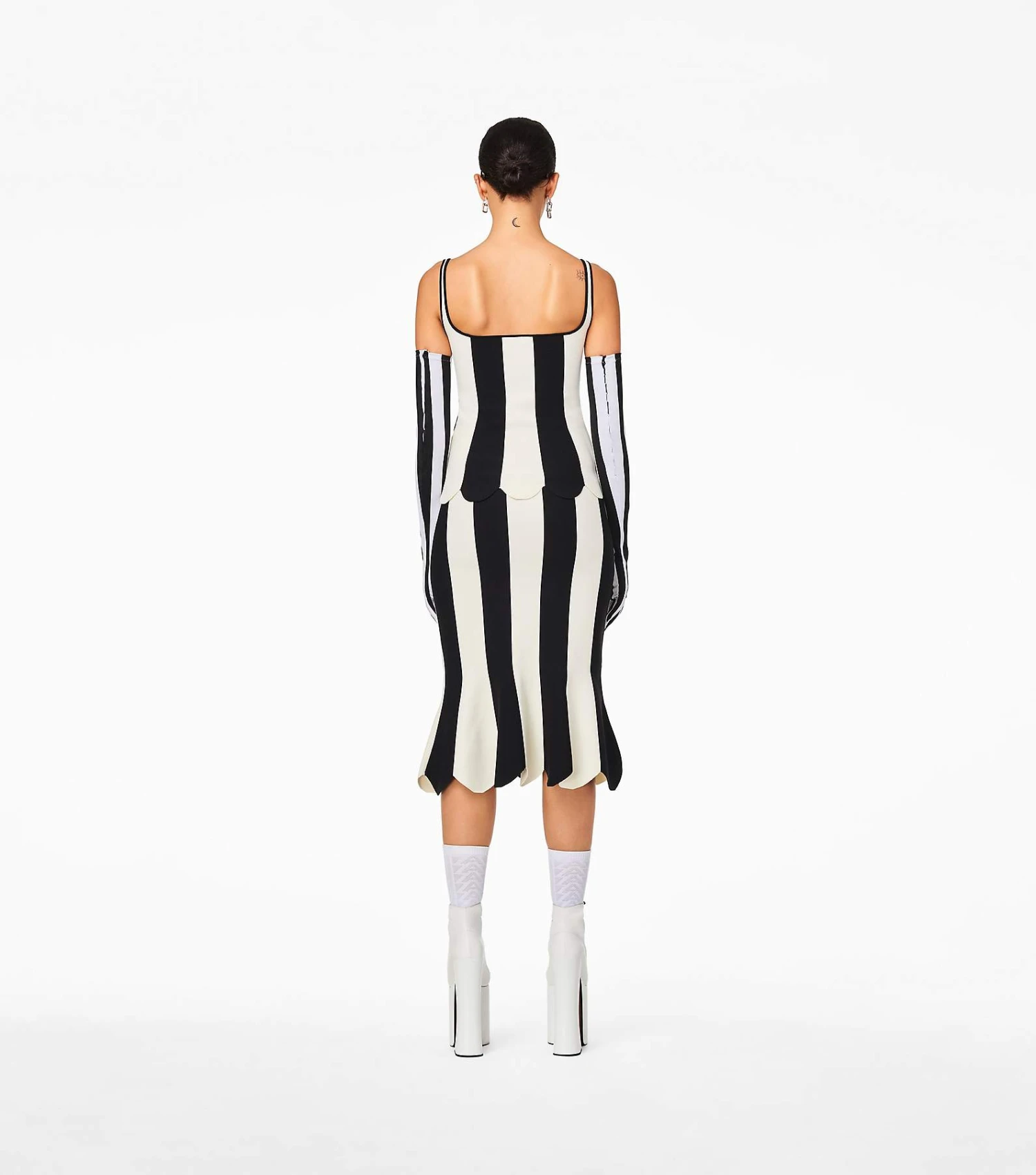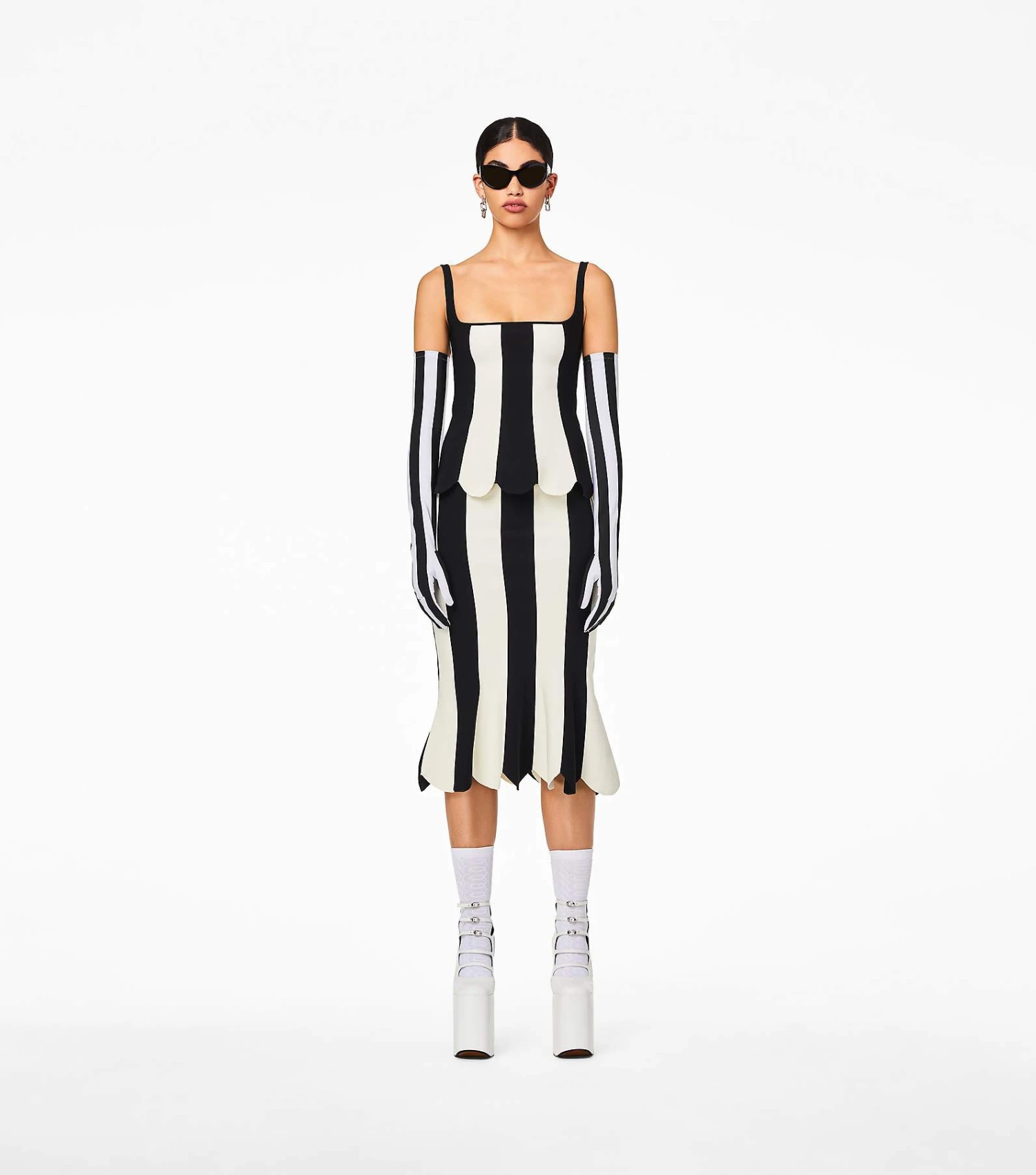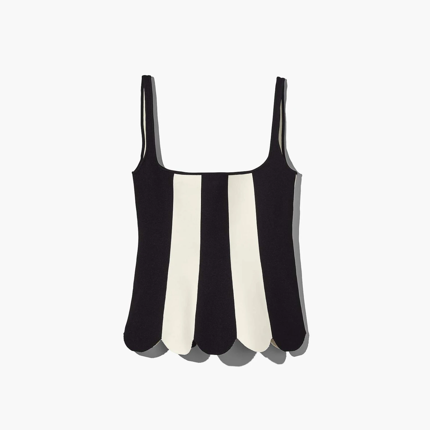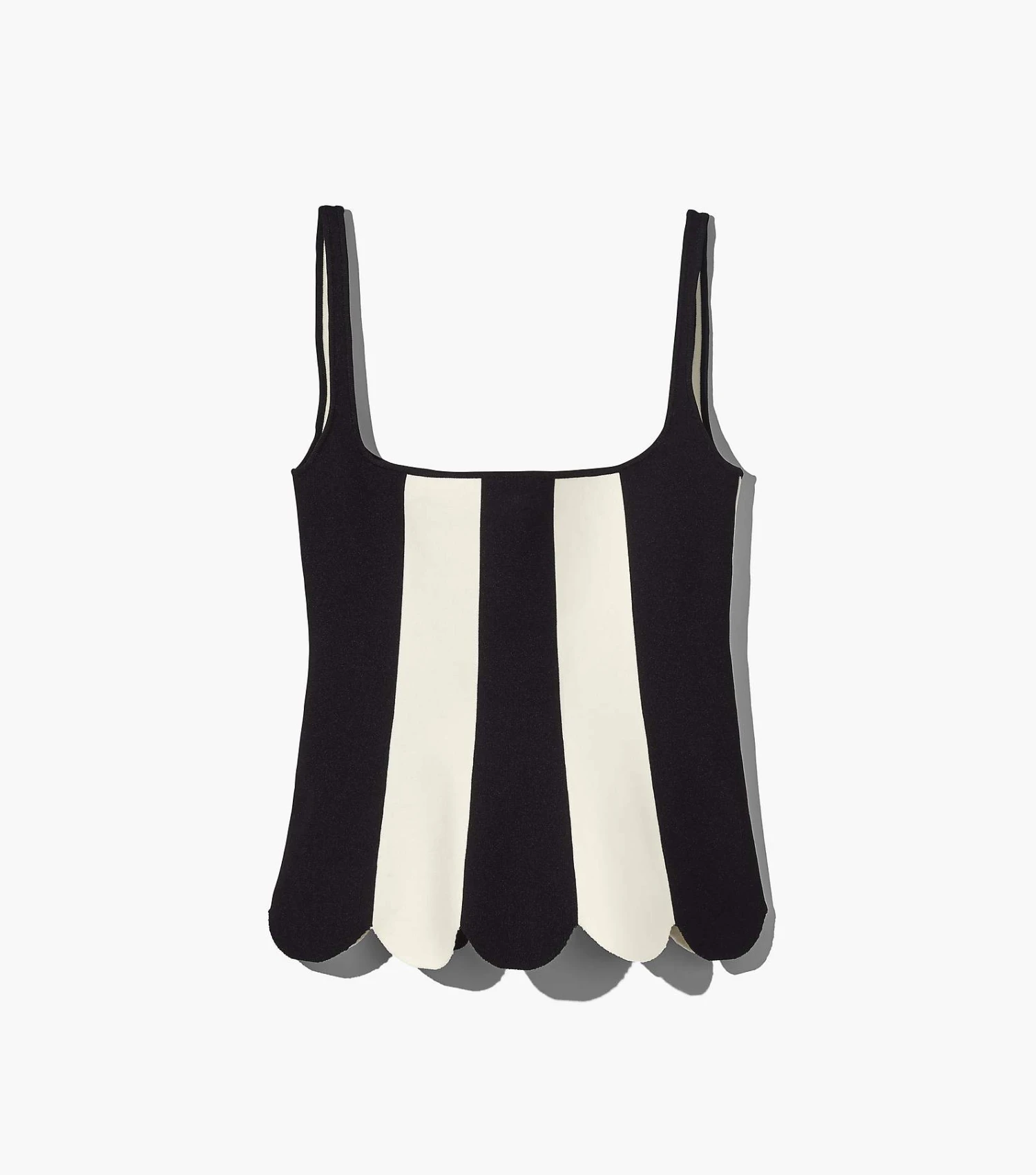Inspired by the early 60s free spirit of the Spring/Summer 2013 collection, this scalloped knit top is designed with a scoop neck and monochrome paneled stripes. Complete the look with the complimentary scuba stripe skirt.