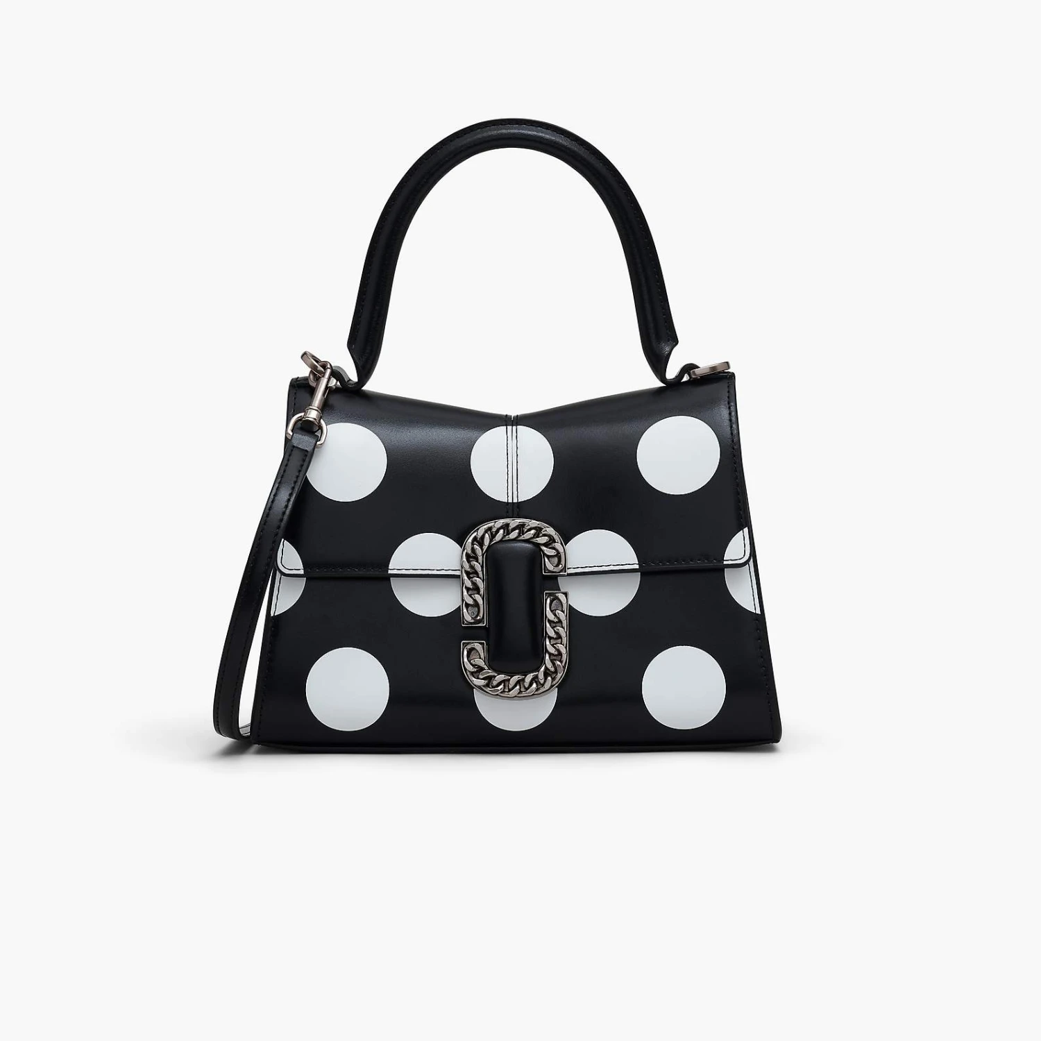 The St. Marc Top Handle gets the spot treatment with a bold graphic pattern inspired by the Fall ’22 runway. Just like the original, it’s designed for a distinctive “M” shape and is crowned with chain link J Marc hardware closure at front. Inside it includes one interior zip pocket and two card slots. Style yours two ways: either carry it at the top handle or attach the adjustable leather strap to wear as a crossbody for hands-free styling.
