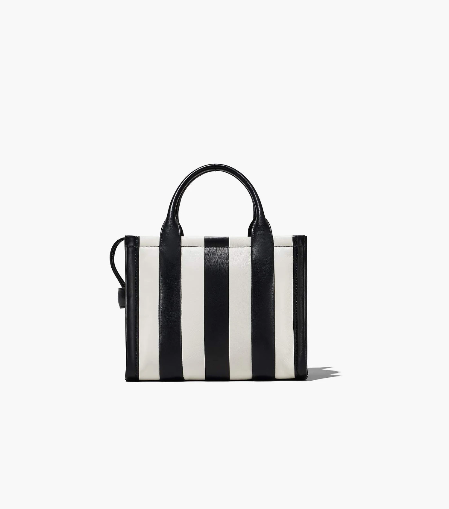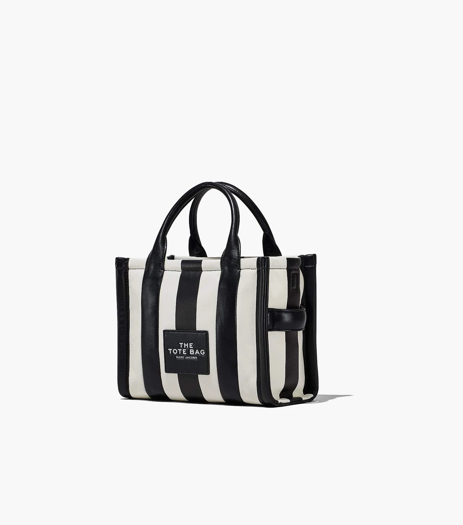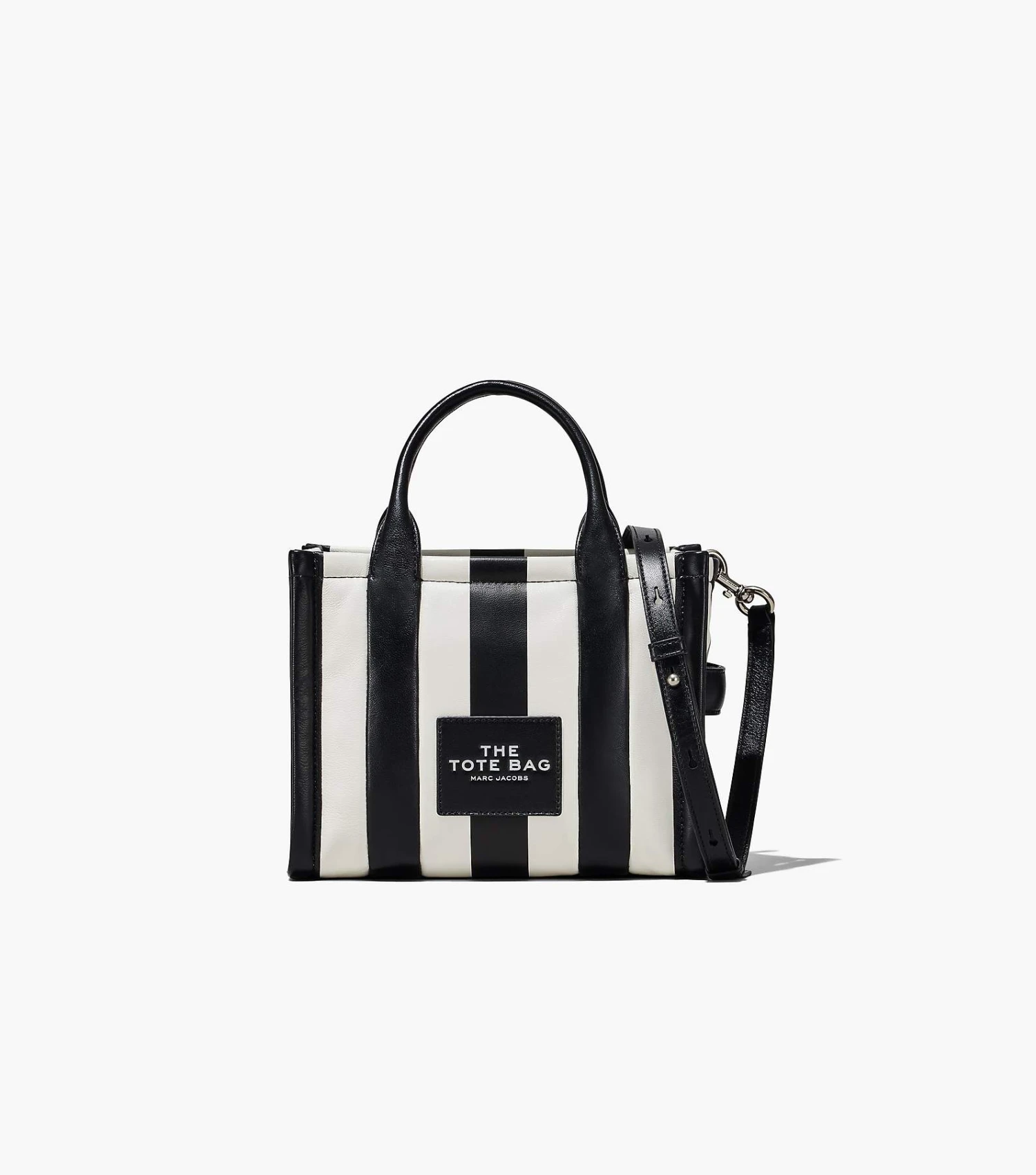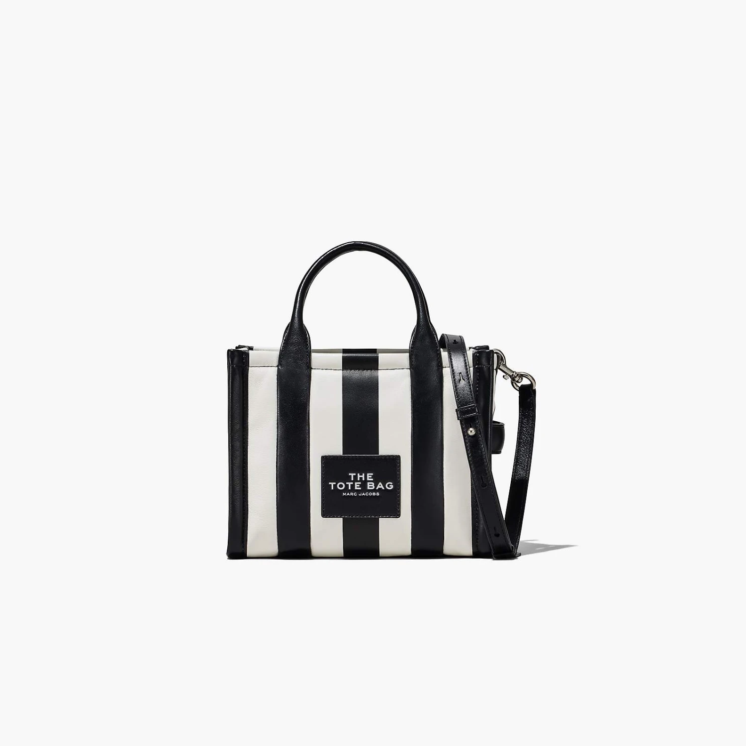 This version of our small tote bag is refreshed in the season’s monochrome stripes inspired by designs from the Spring/Summer 2013 runway. Inside, it includes one interior slip pocket and one card slot. Carry it by the top handles or wear it as a crossbody bag with the removable, adjustable leather strap. Explore all the different tote bag sizes in our size guide.