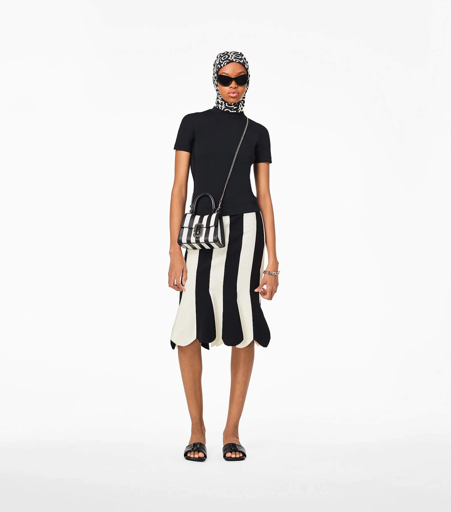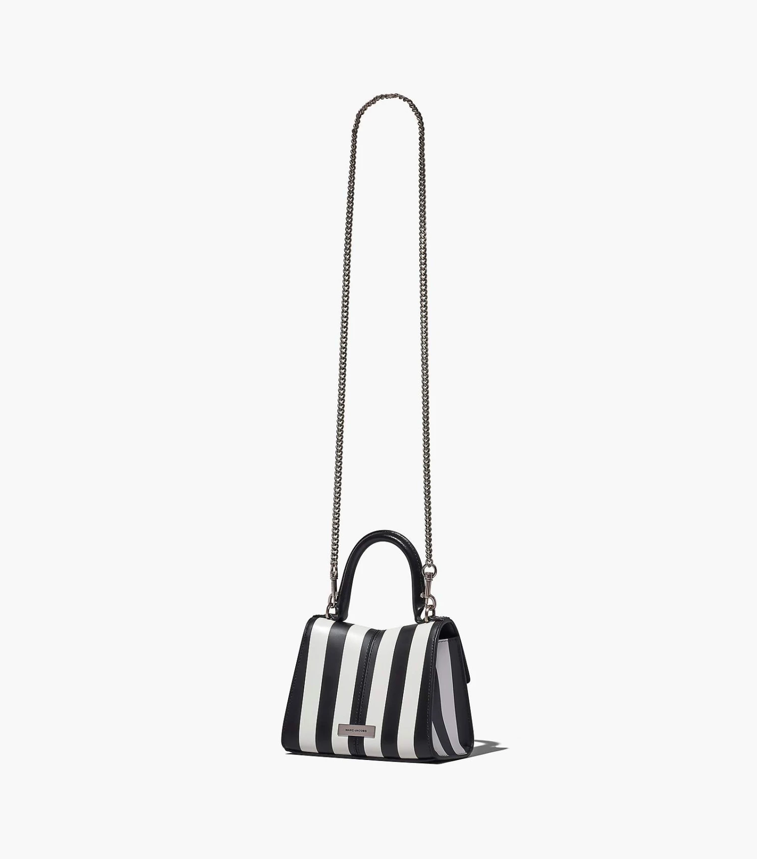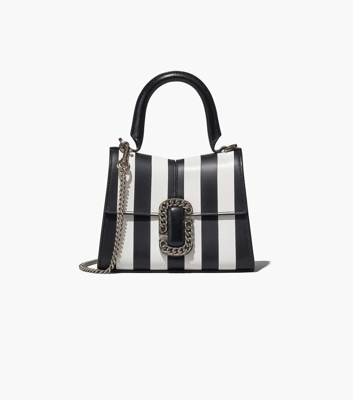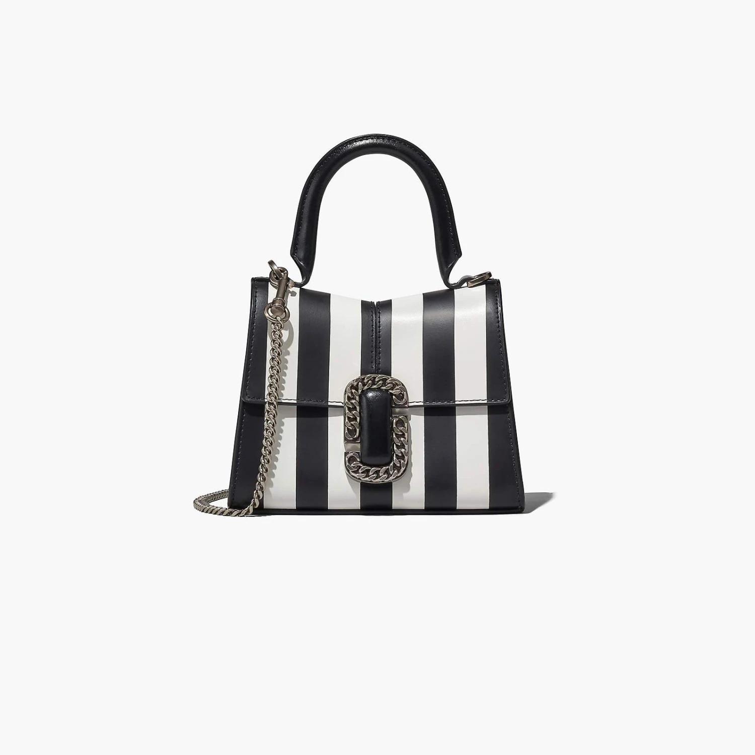 Inspired by the Fall 2016 runway St. Marc bag, the Mini St. Marc is a petite silhouette crafted from luxurious leather in an archival runway striped design. It’s designed with a distinctive “M” shape and sealed by a chain link J Marc hardware closure at front. Inside, it includes two card slots for easy organization. Carry by the top handle or attach the removable chain strap to wear as a crossbody bag for hands-free styling.