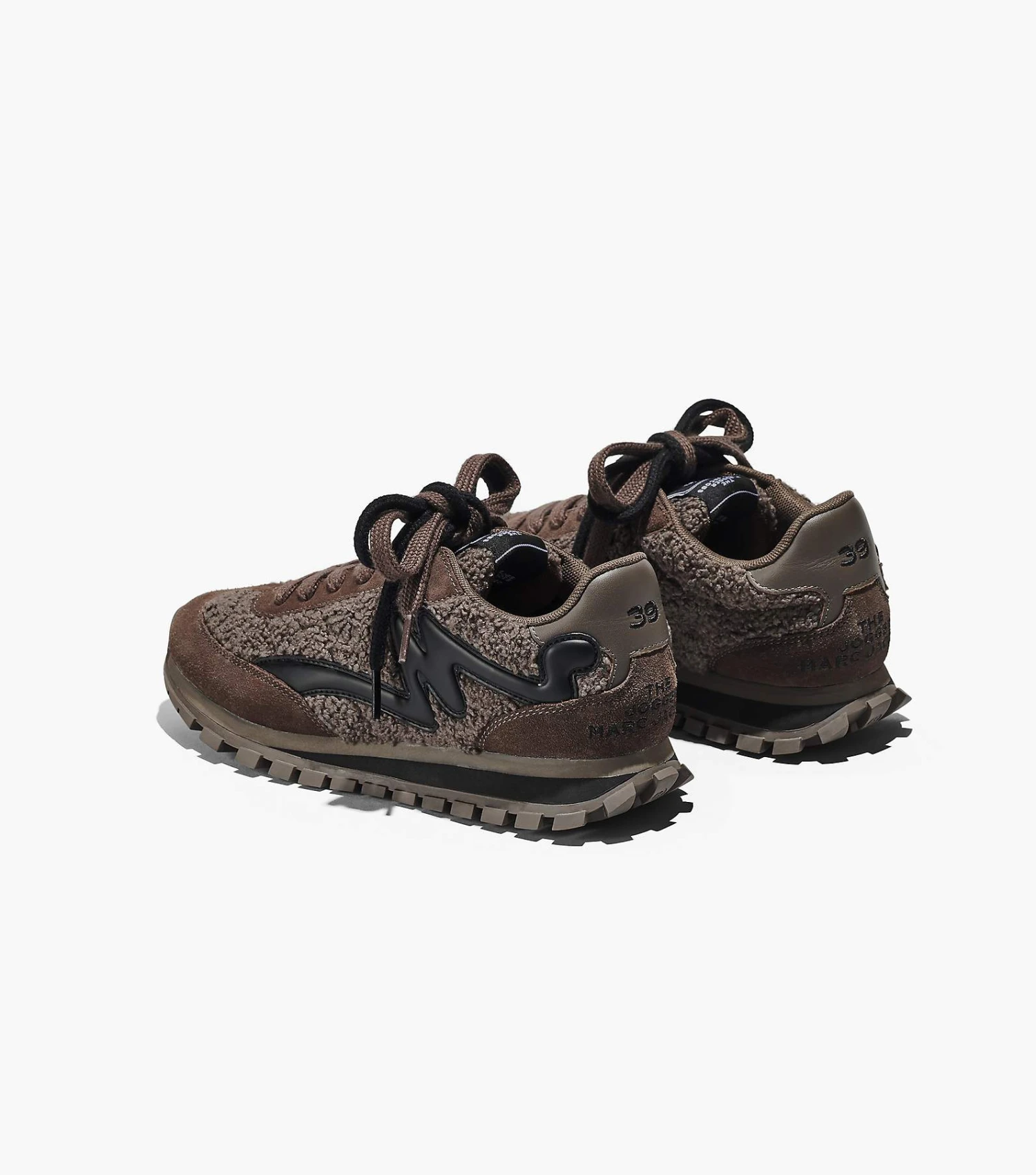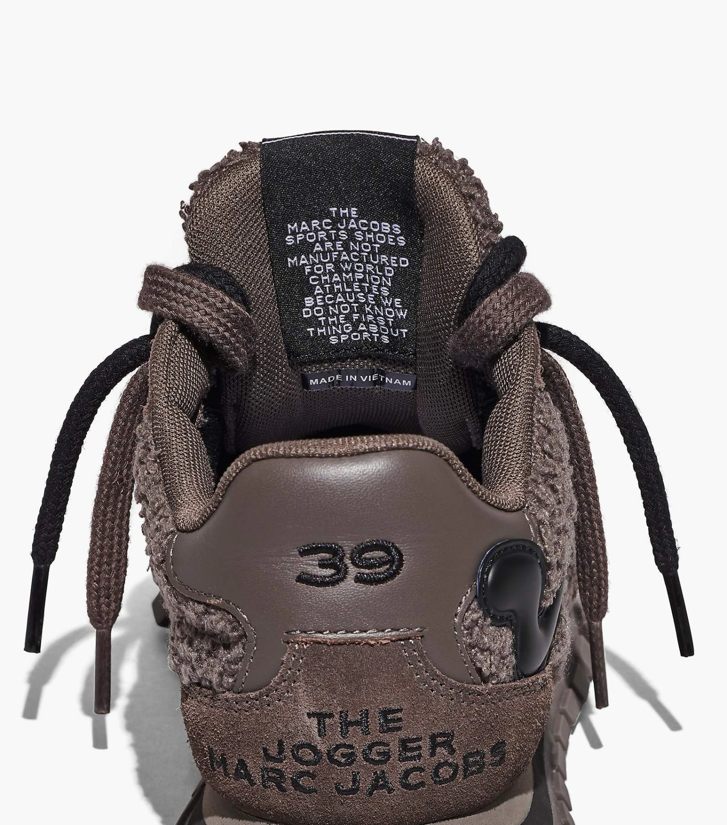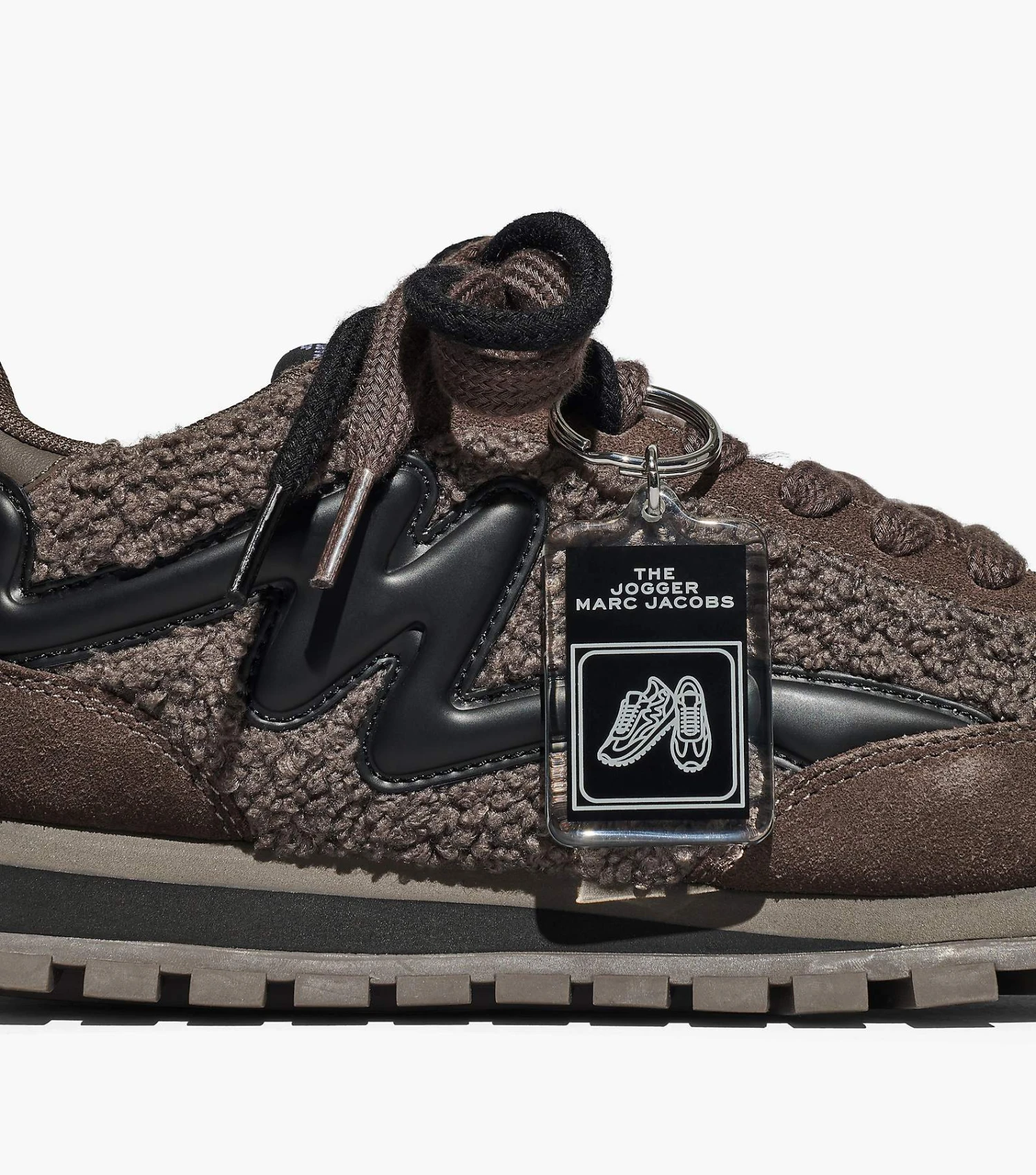 70s-inspired leather and terry cloth running shoe with interchangeable signature “M” at the sides.