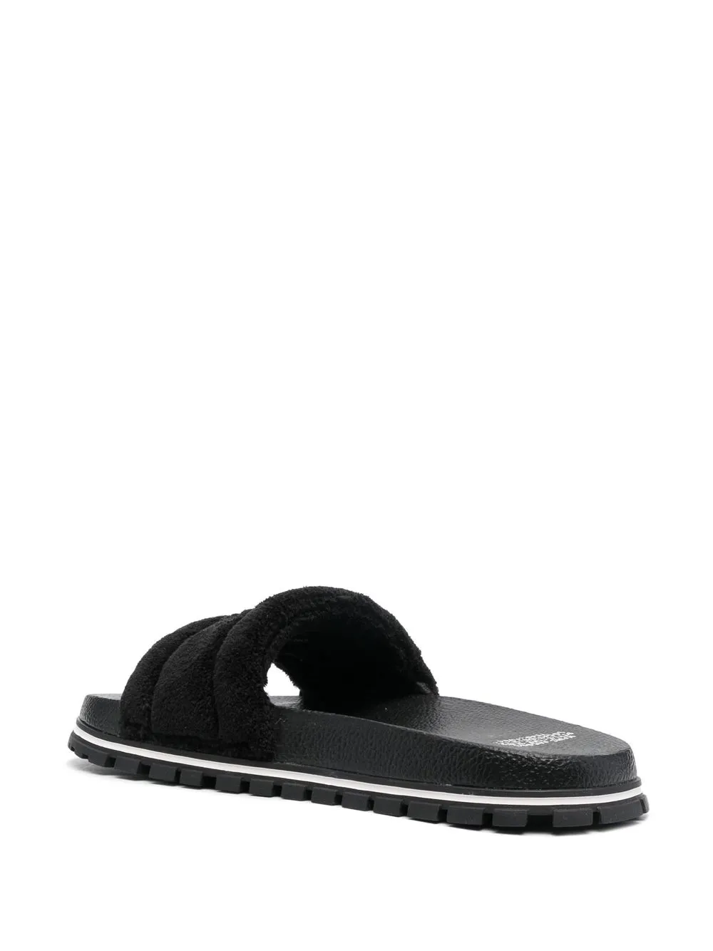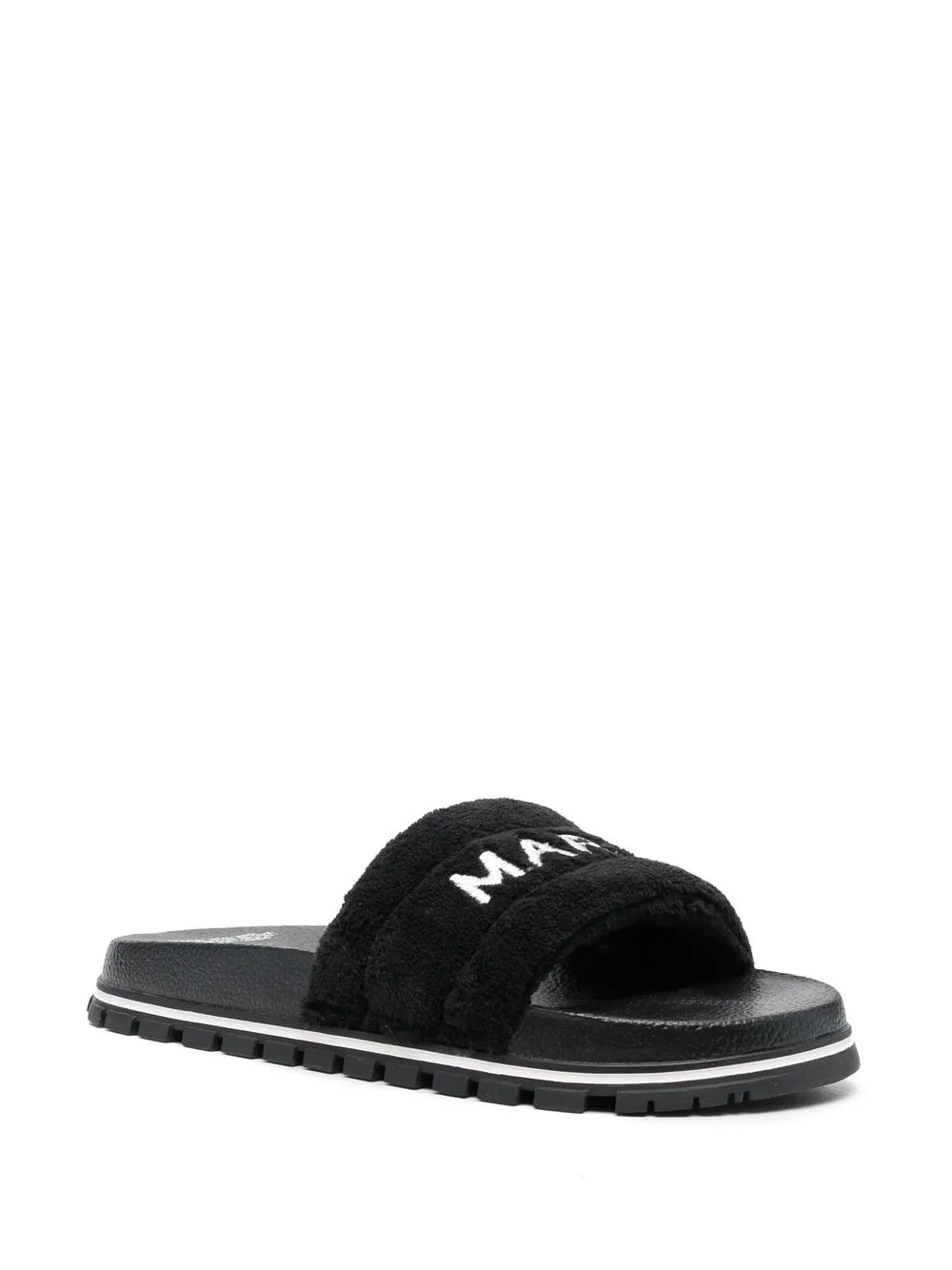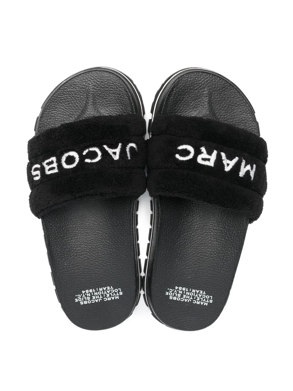 embroidered-logo slides from Marc Jacobs featuring jet black, embroidered logo to the front, fleece texture, round toe, open toe, branded insole, moulded footbed and flat rubber sole.