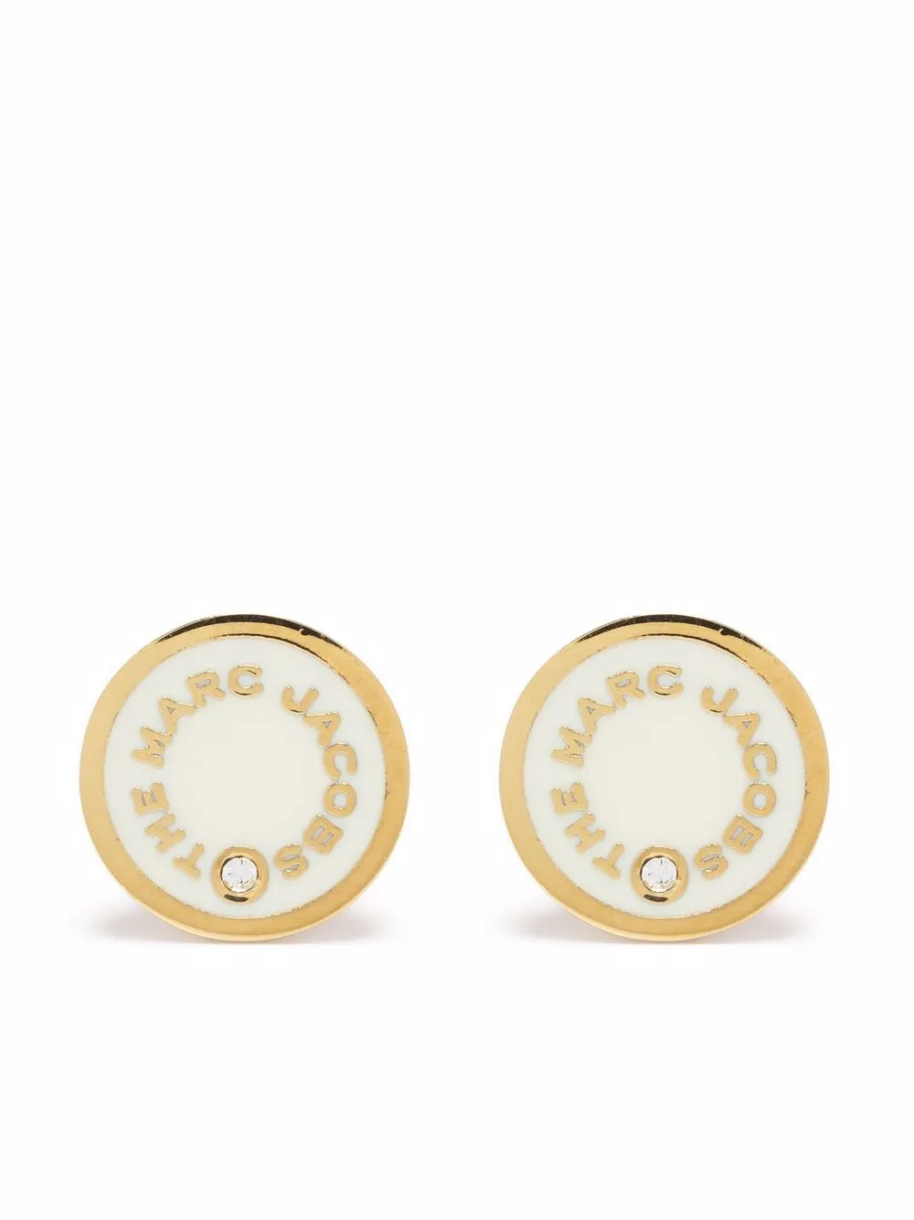Cream white/gold metal engraved-logo cuff earrings from Marc Jacobs featuring engraved logo, crystal embellishment and butterfly fastening. Two’s company. These earrings come as a pair..