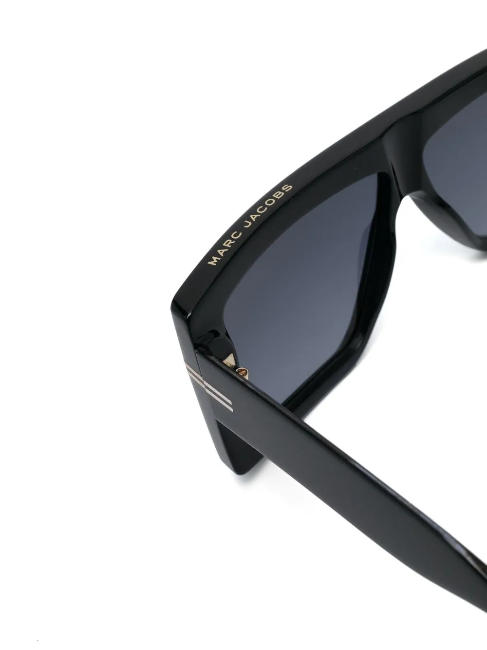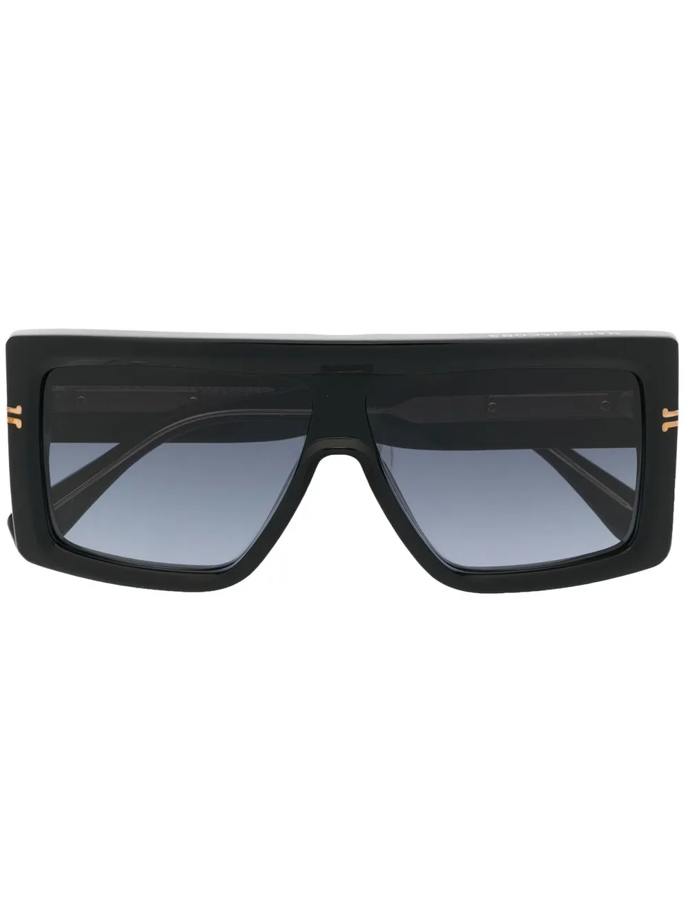 logo-print oversize-frame sunglasses from MARC JACOBS EYEWEAR featuring logo print to the front, tinted lenses, UV-protective lenses, oversize frame, straight arms, angled tip and black/gold-tone. All glasses from FARFETCH are sold as non-prescription frames.. These glasses come with a protective case..
