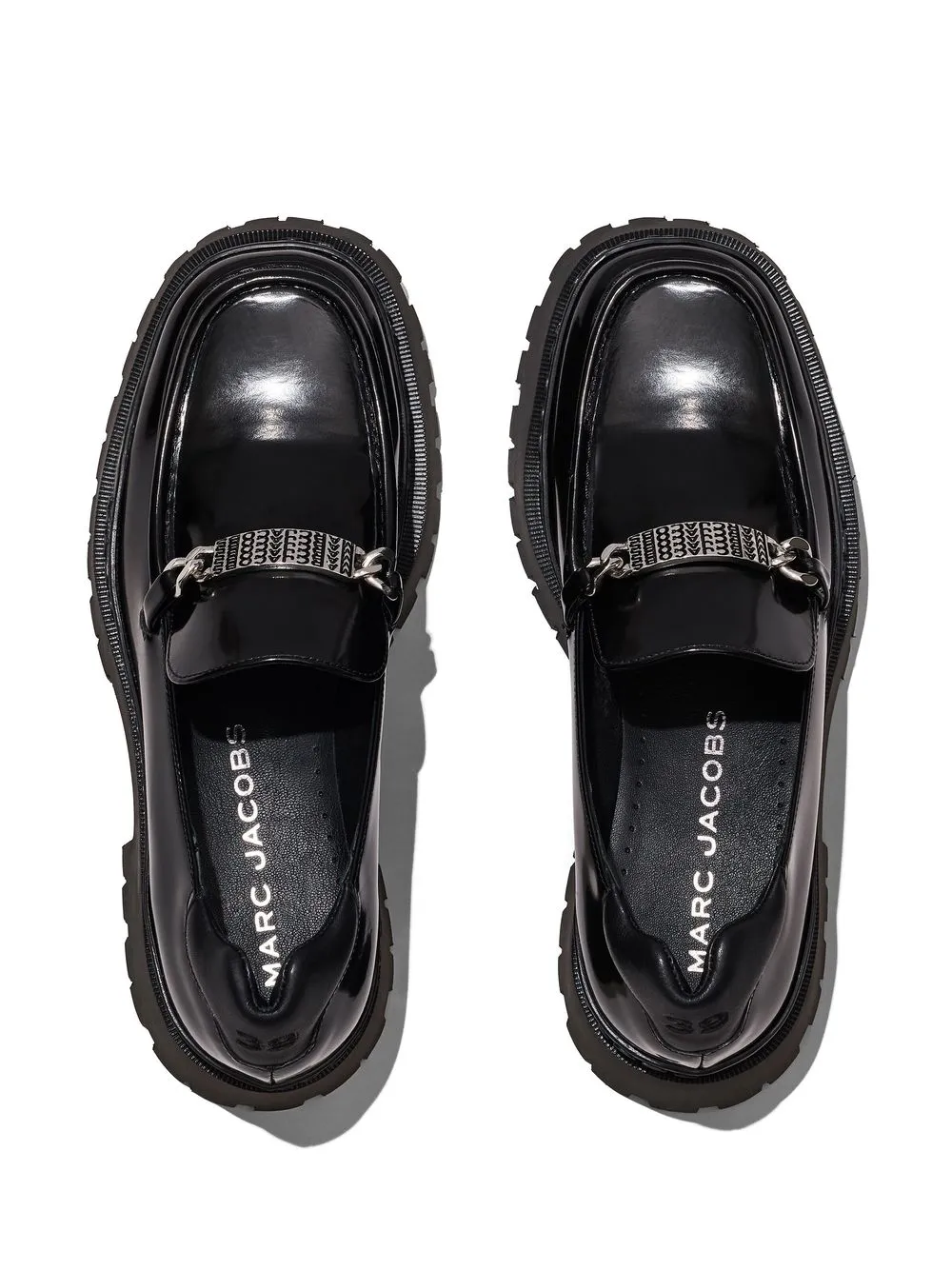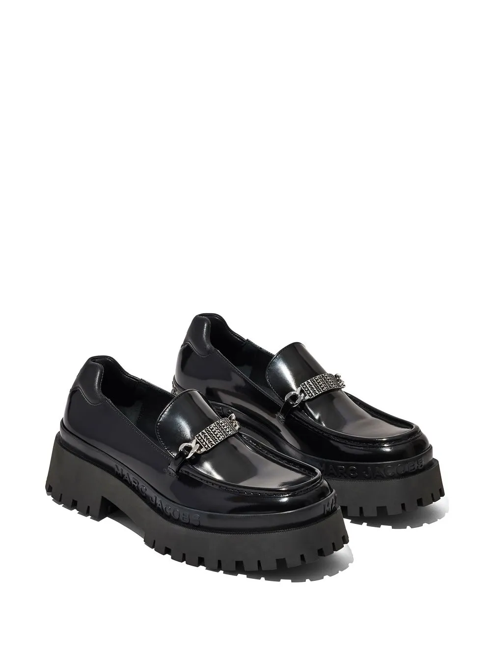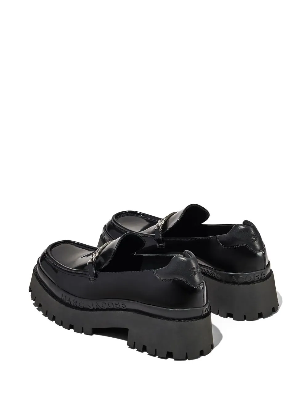 leather platform loafers from Marc Jacobs featuring black, leather, logo plaque at the tongue, embossed logo to the side, square toe, slip-on style, ridged rubber sole and branded insole.