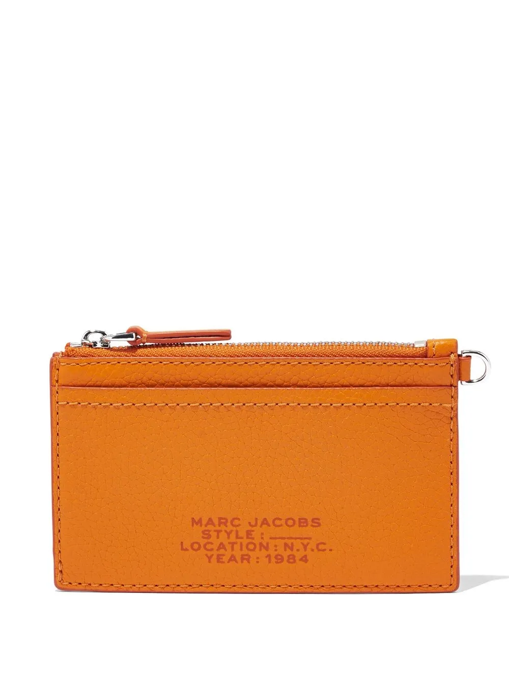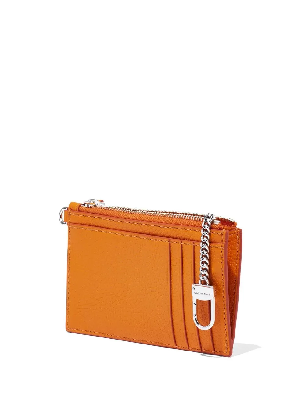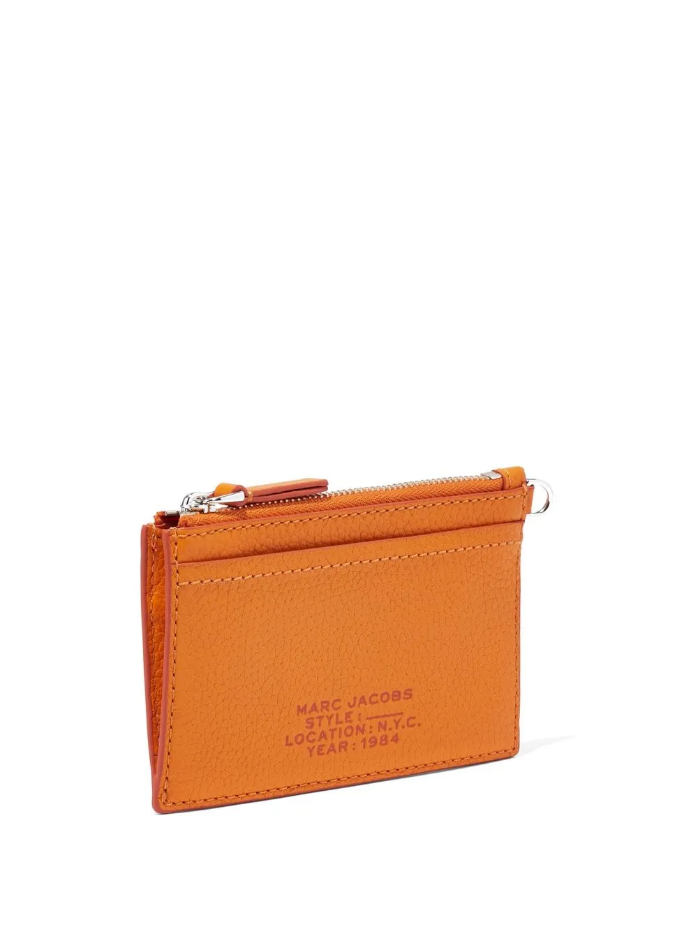 leather wristlet wallet from Marc Jacobs featuring caramel brown, embossed logo to the front, rear card slots, wrist strap, top zip fastening, main compartment and leather trim.