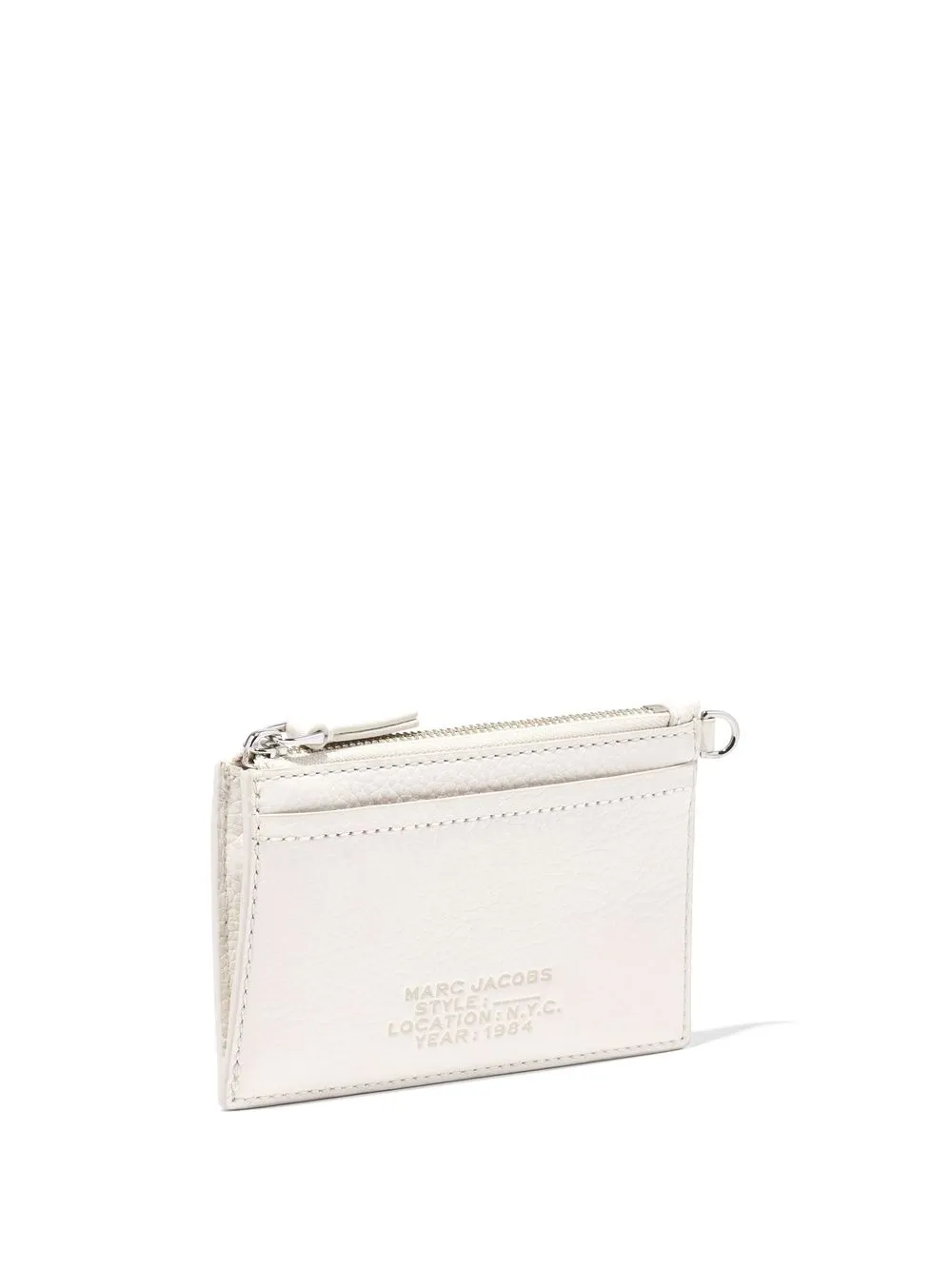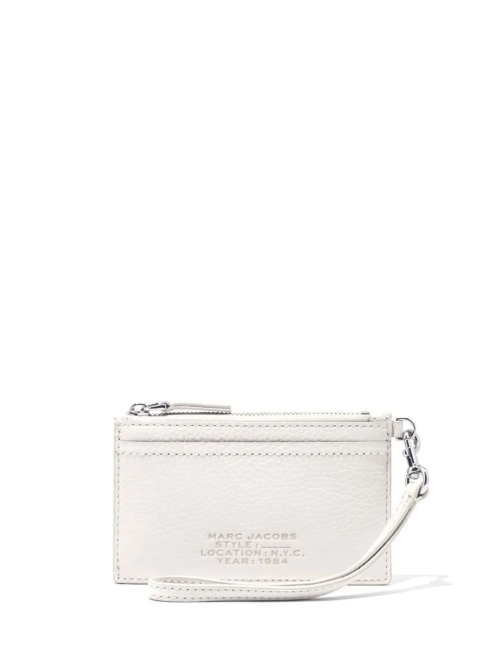 leather wristlet wallet from Marc Jacobs featuring cloud white, detachable wrist strap, embossed logo to the front, rear card slots, slip pocket to the front, top zip fastening, main compartment and leather.