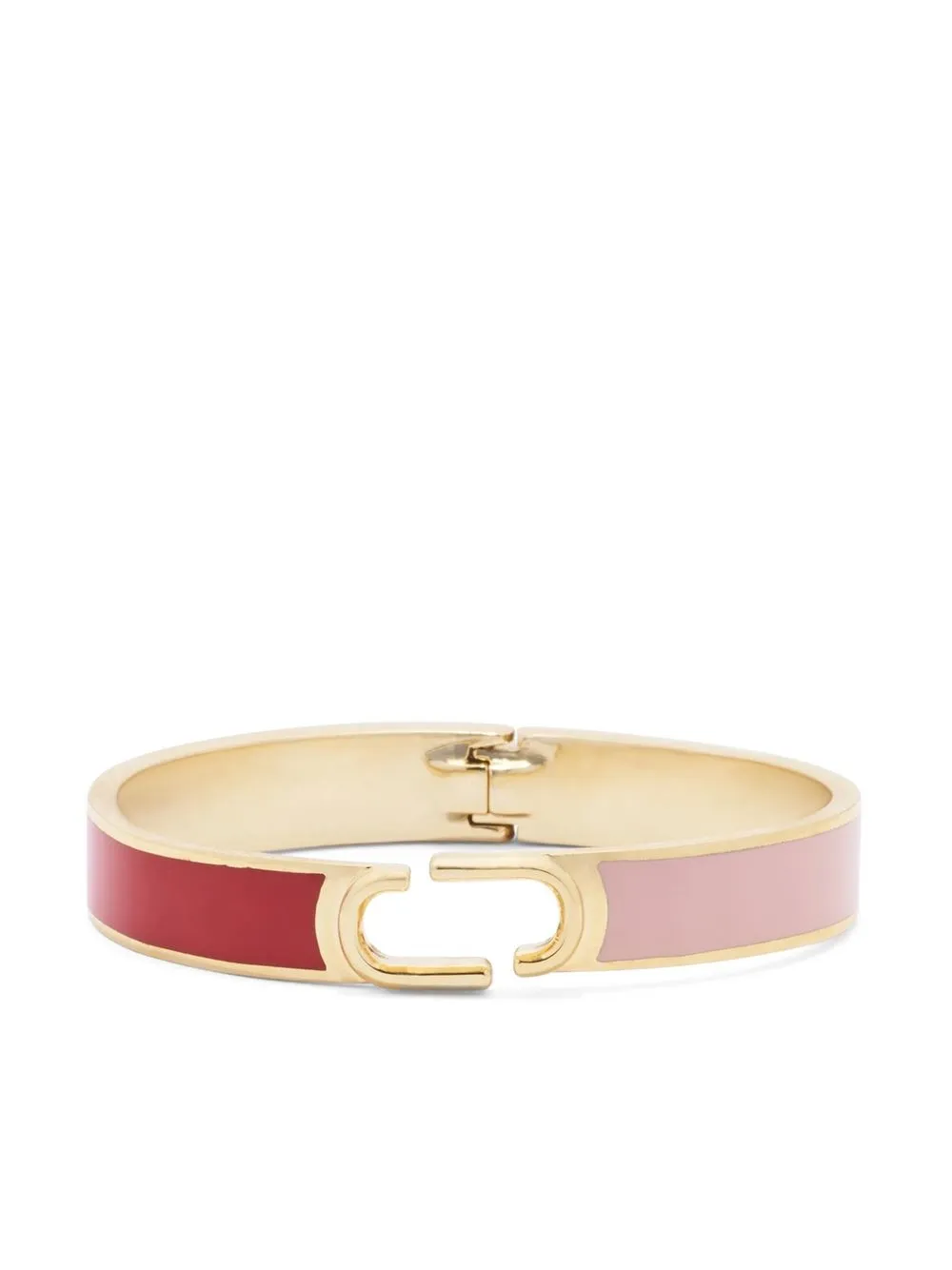 logo-detail bangle from Marc Jacobs featuring rose pink, gold-tone hardware, enamel detail, gold-tone logo plaque, thin band and hinge-pin fastening.