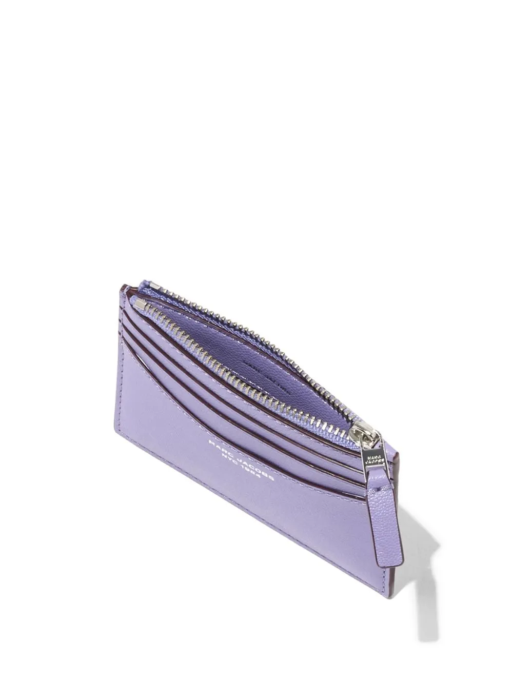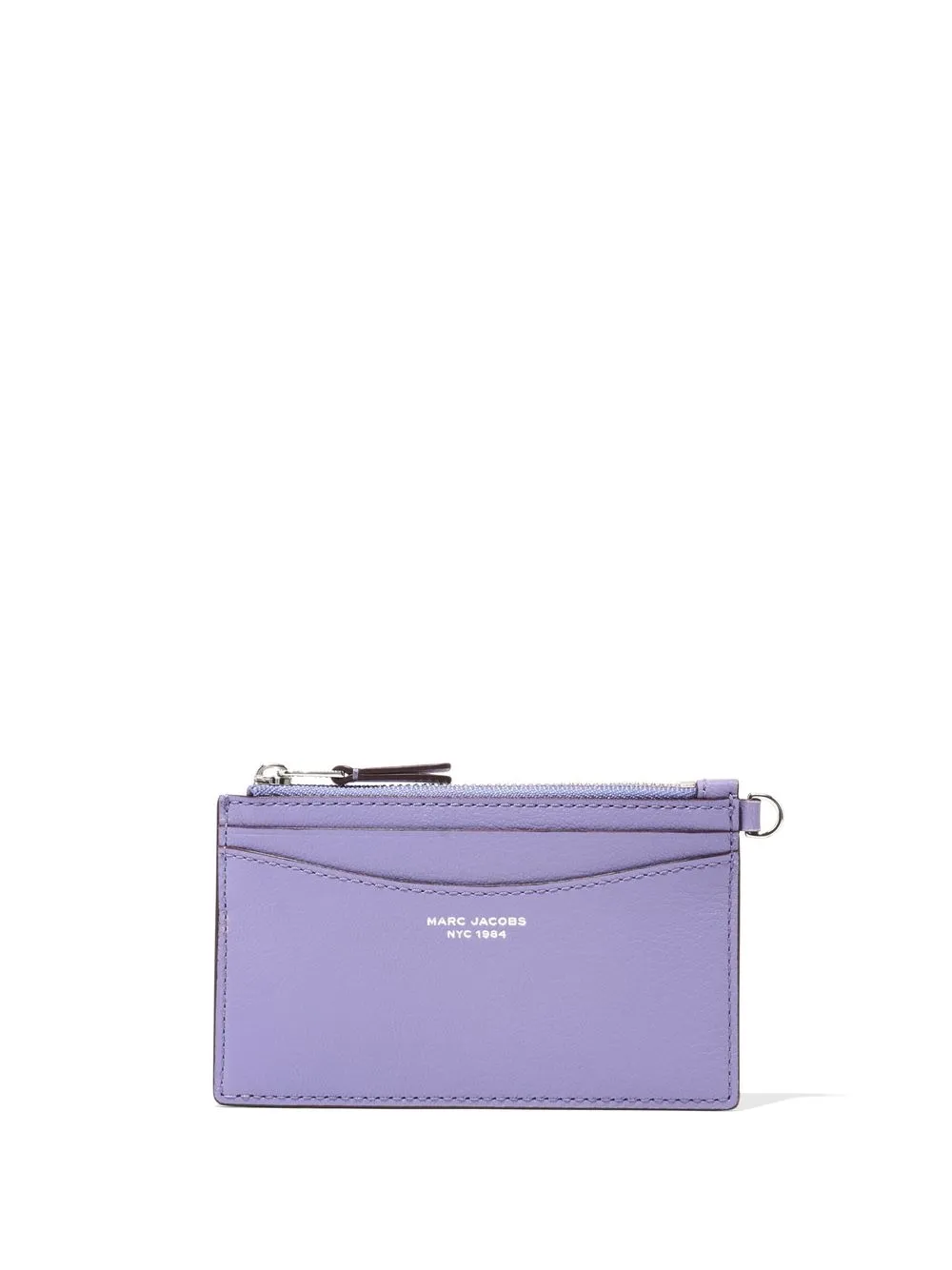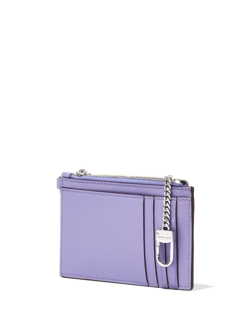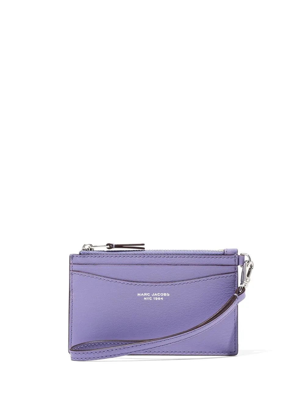 logo-detail wristlet wallet from Marc Jacobs featuring lilac purple, calf leather, silver-tone hardware, logo print to the front, engraved logo, card slots, top zip fastening and clip fastening.