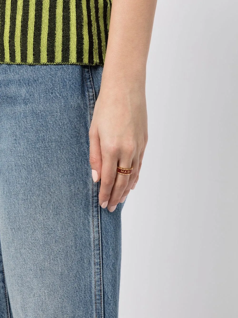 Marc Jacobs’ ring spotlights the brand’s moniker. Here, an embossed iteration decorates this chunky iteration framed with scallop edges. The gleaming gold-tone hardware pops against the fiery red resin.