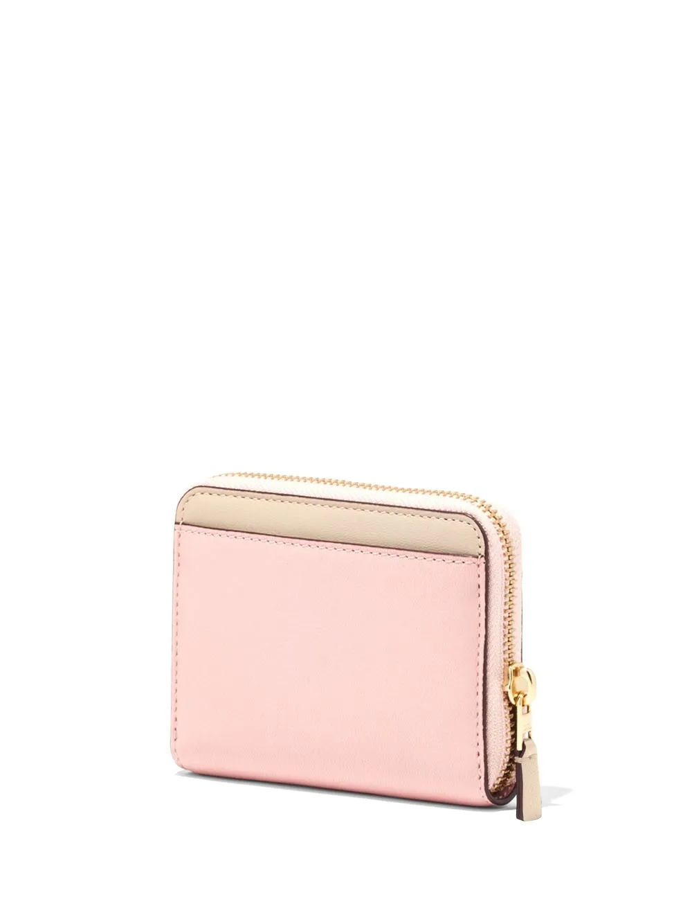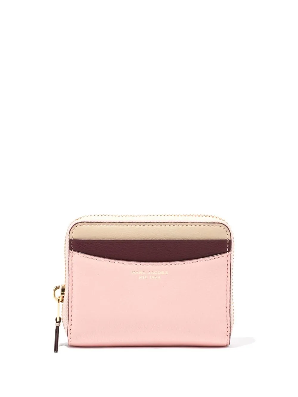 logo-lettering zip-up wallet from Marc Jacobs featuring pink, beige, brown, goatskin, grained texture, gold-tone logo lettering, all-around zip fastening, rear slit pocket and internal card slots.