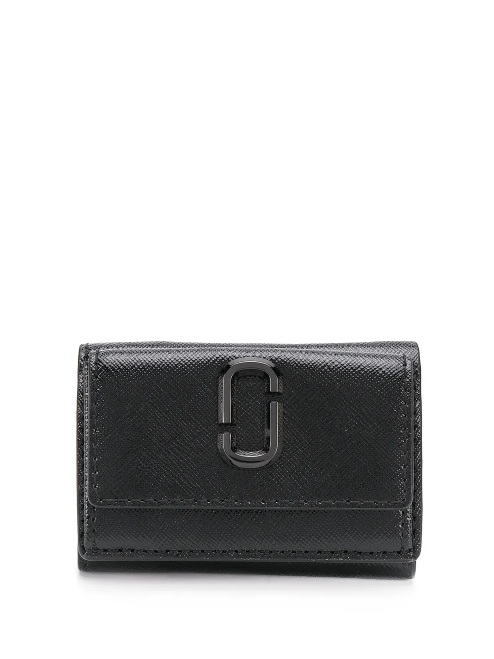Black mini Snapshot Trifold wallet from Marc Jacobs featuring a textured style, a logo plaque, a note compartment and a printed logo.