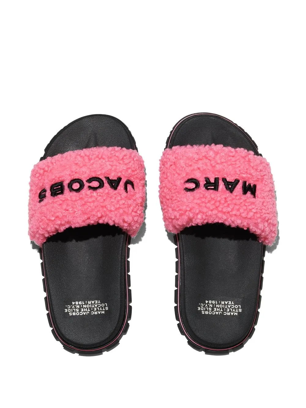 Teddy logo slides from Marc Jacobs featuring pink, fleece texture, logo lettering, open toe, slip-on style, branded leather insole and flat rubber sole.