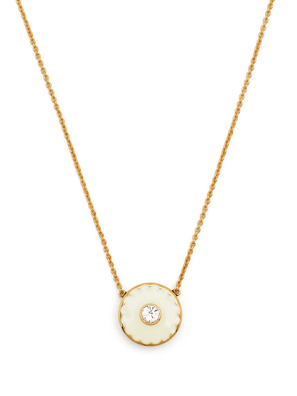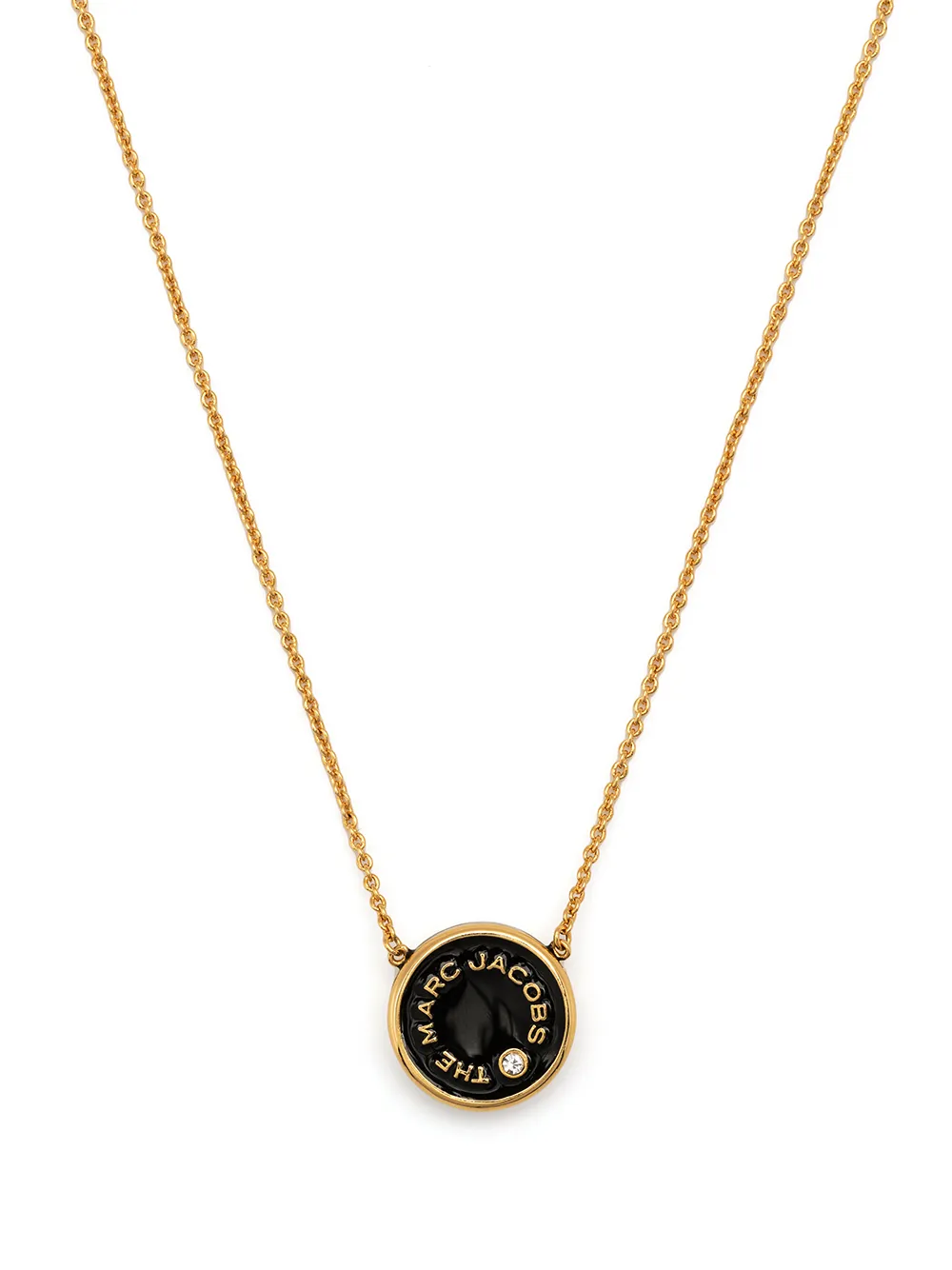 This necklace from Marc Jacobs features the brand’s iconic medallion strung from a slim yellow gold-tone chain. Reversible in design, it’s inlaid with black resin and has an inset crystal and logo engraving on one side.