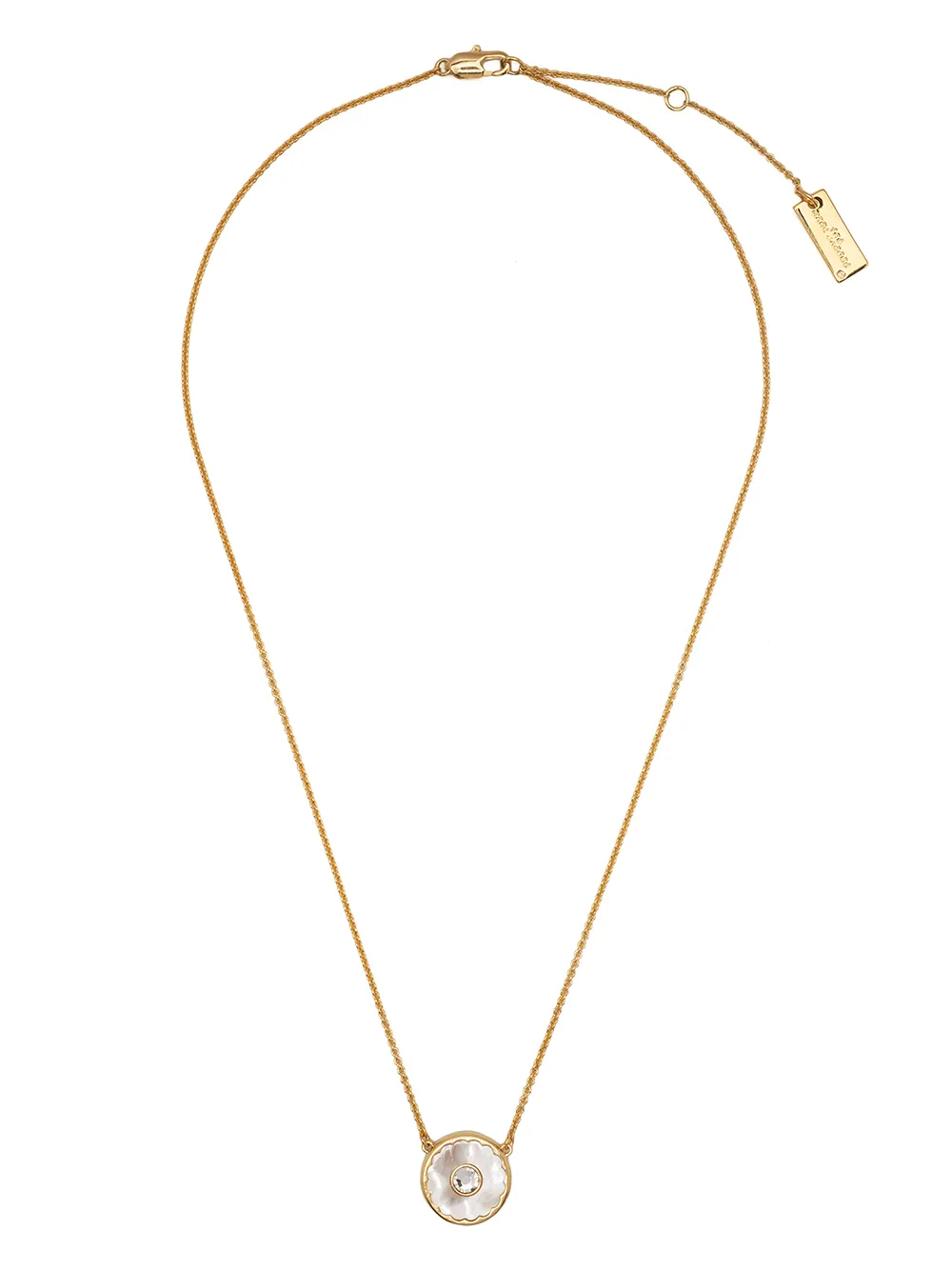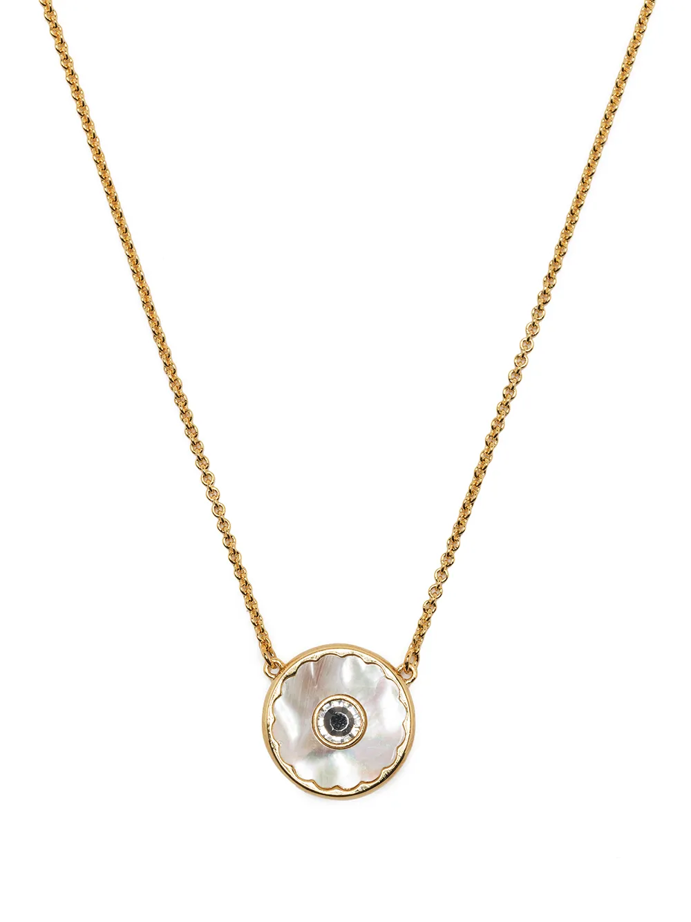Gold-tone metal The Medallion pendant necklace from Marc Jacobs featuring mother-of-pearl, polished finish, crystal embellishment, cable-link chain and lobster claw fastening.