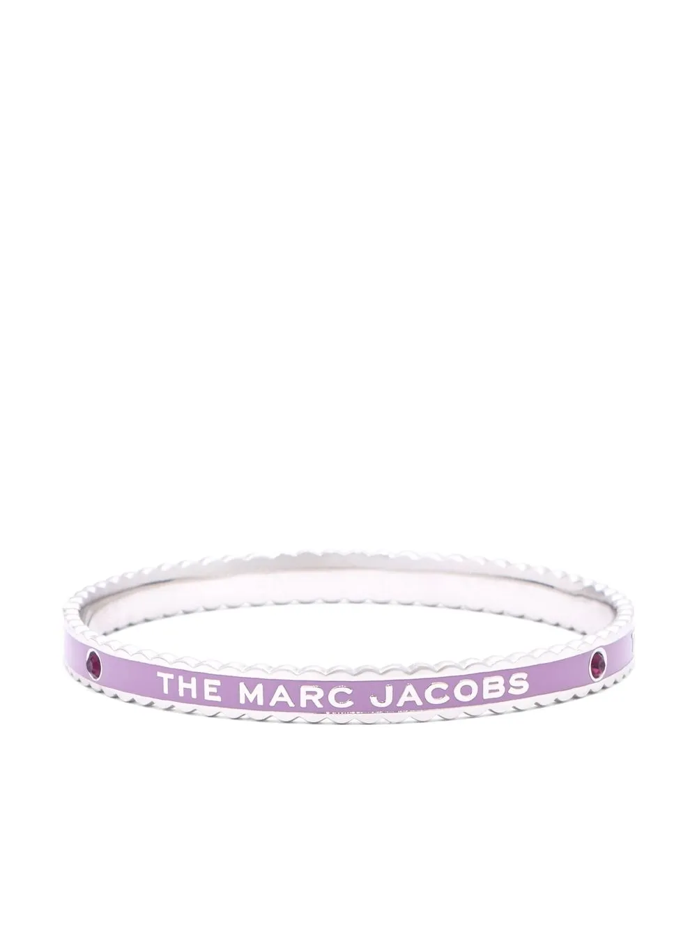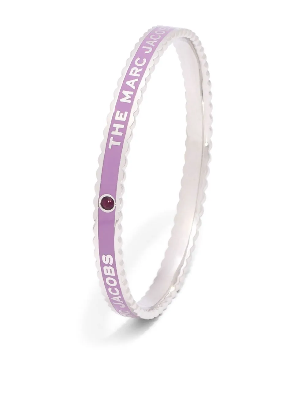 The Medallion Scalloped bangle from Marc Jacobs featuring lilac purple, brass, logo print to the front, crystal embellishment, scallop edge and slip-on style.