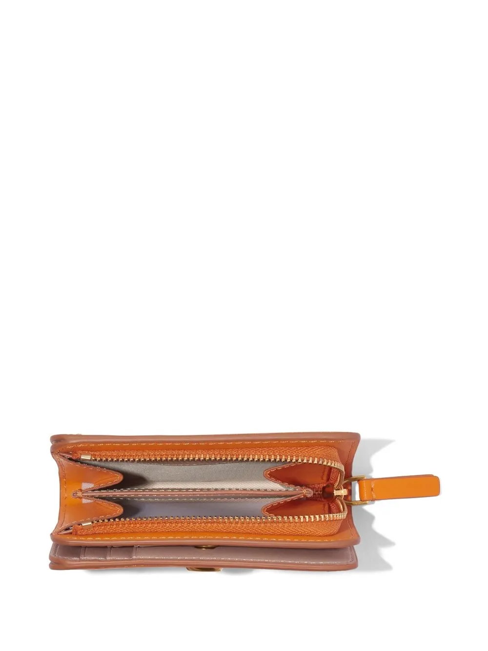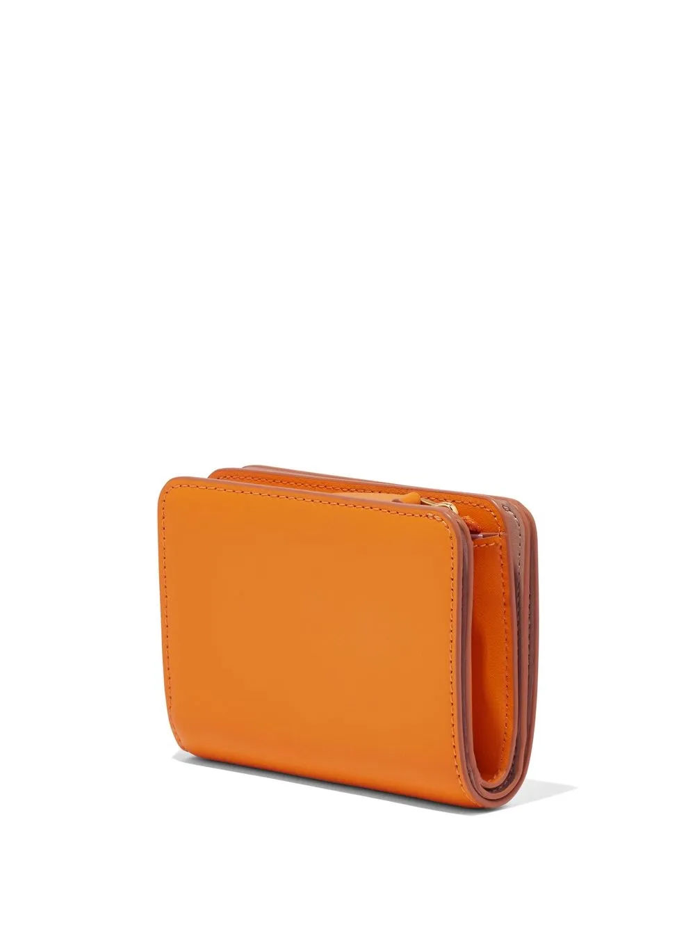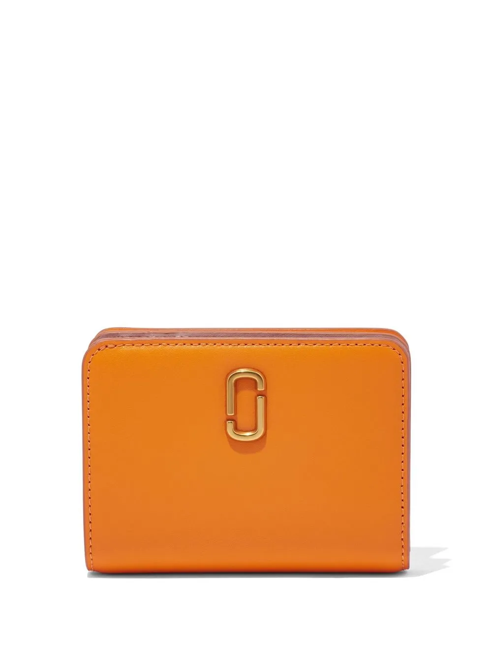The Mini Compact wallet from Marc Jacobs featuring orange, almond beige, leather, gold-tone logo plaque, embossed internal logo, top zip fastening, card slots and note compartment.