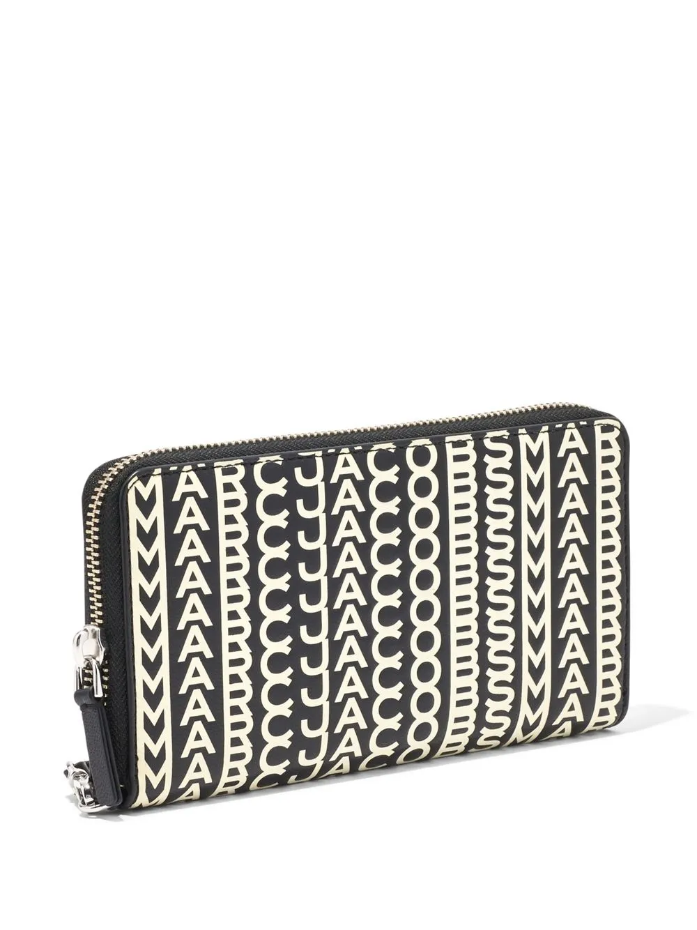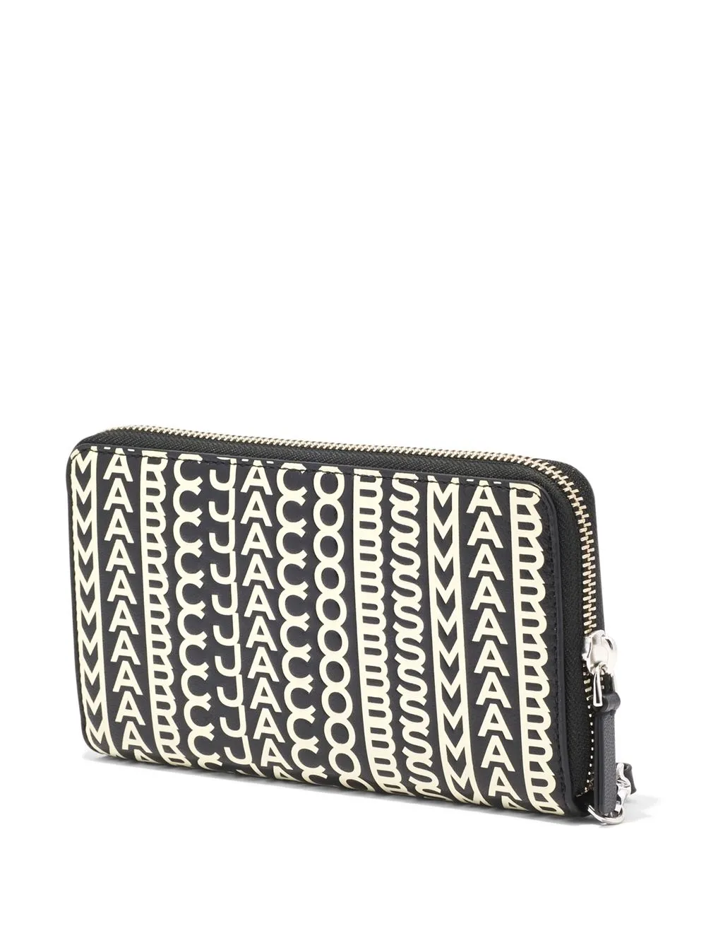 The Monogram continental wristlet wallet from Marc Jacobs featuring black/white, nubuck leather, all-over logo print, silver-tone hardware, top zip fastening, main compartment and internal card slots.