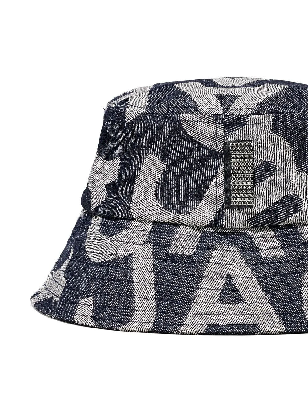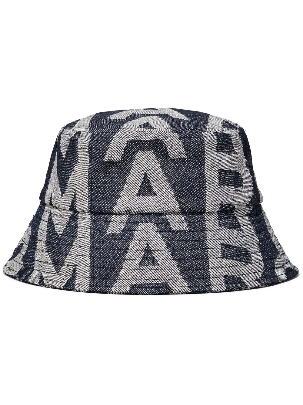 The Monogram denim bucket hat from Marc Jacobs featuring midnight blue, cool grey, cotton, monogram pattern, flat peak and wide brim.