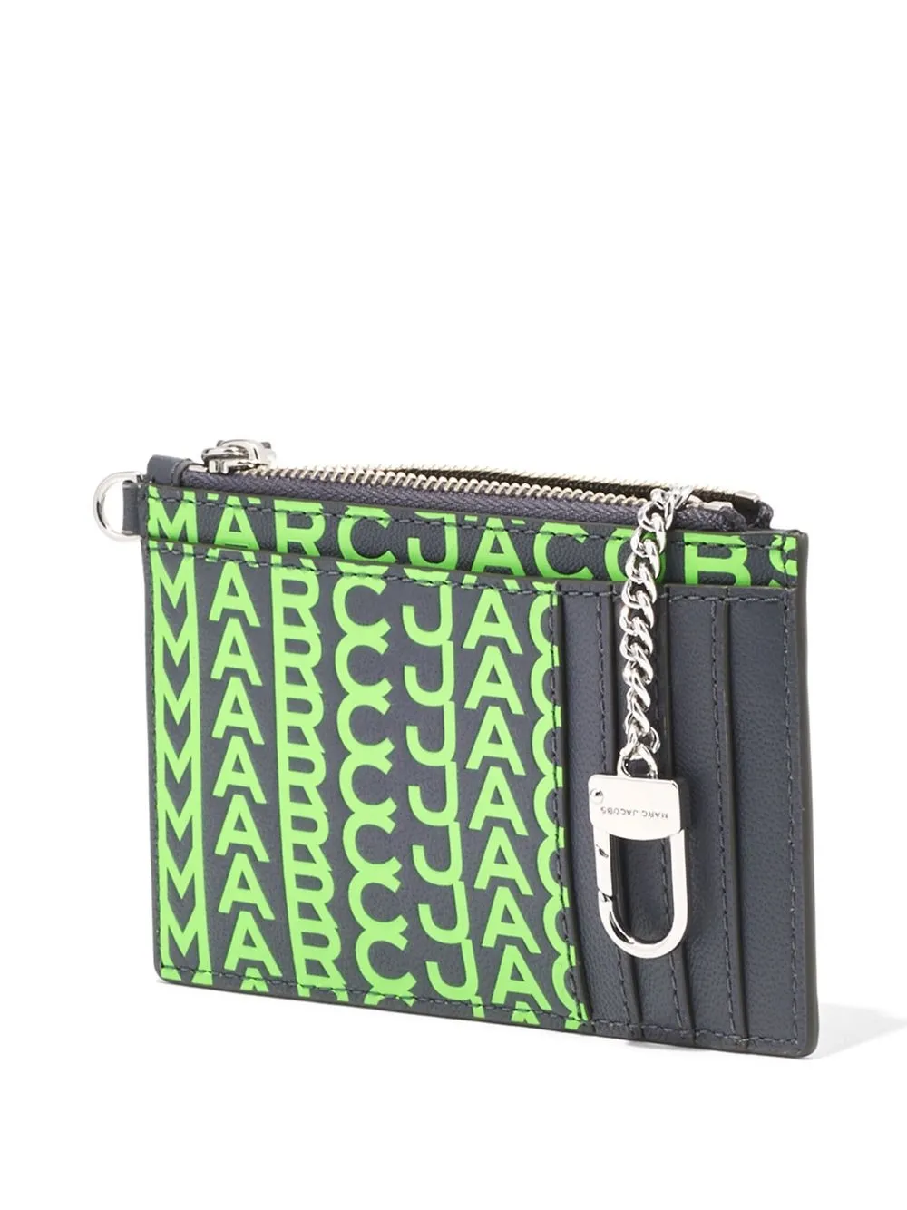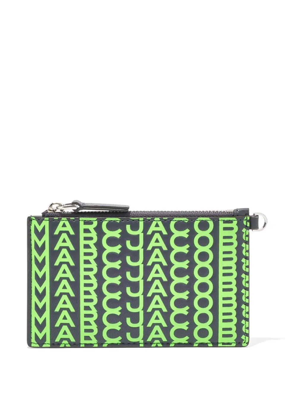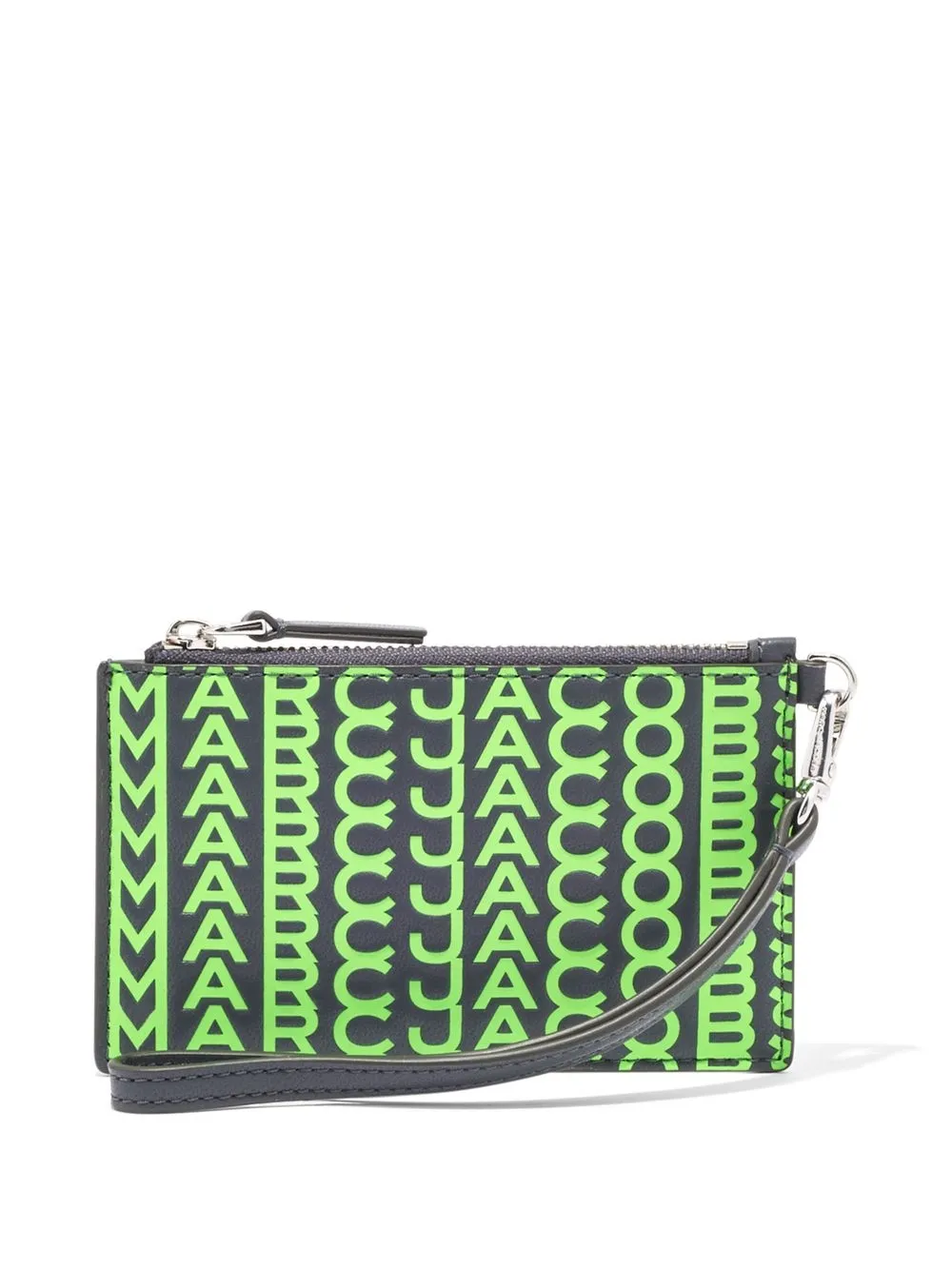 The Monogram printed wristlet from Marc Jacobs featuring black, neon green, sheepskin, monogram print, engraved logo, top zip fastening, card slots, detachable wrist strap and detachable wallet chain.