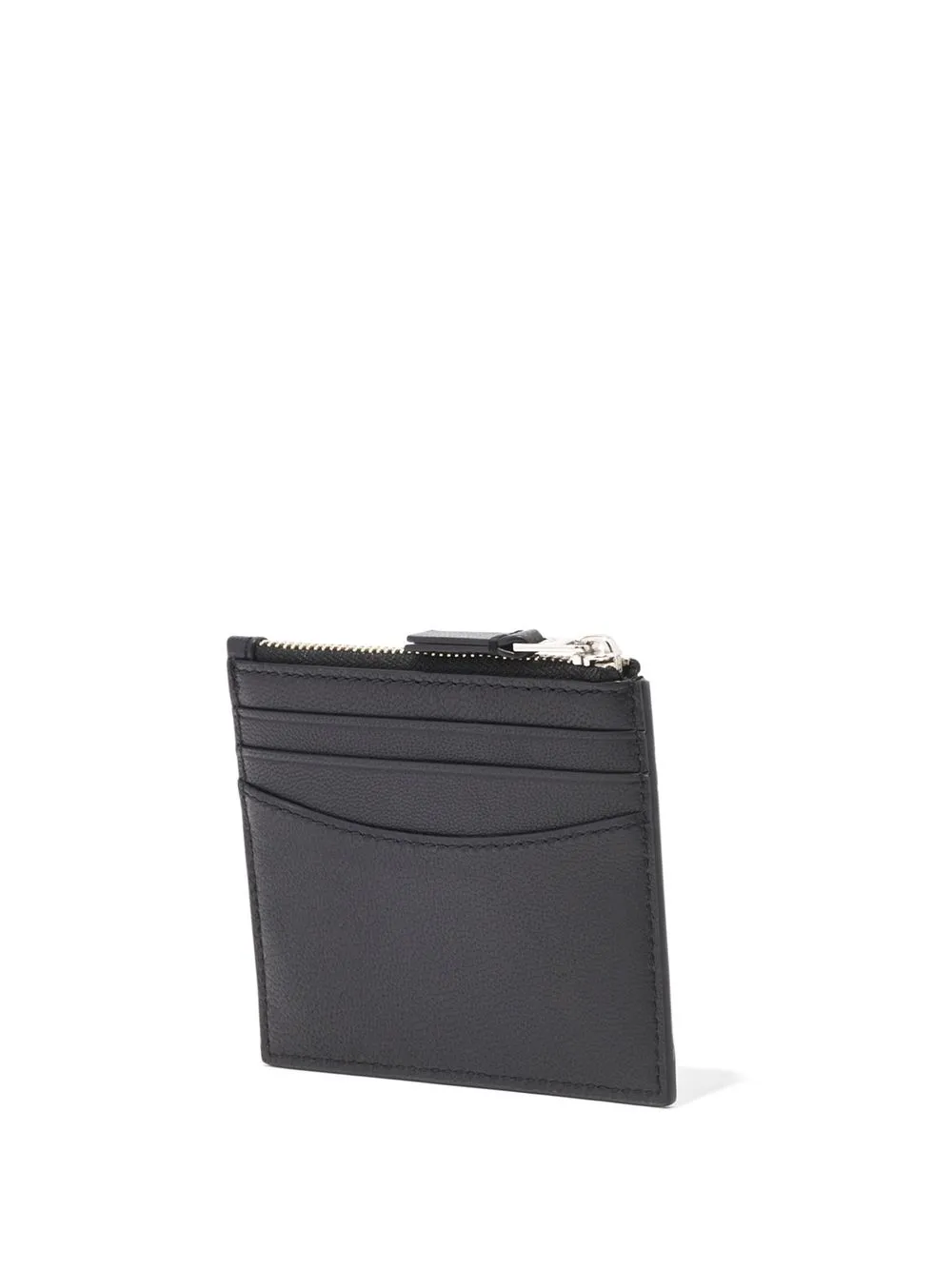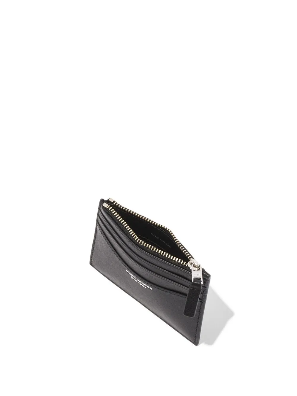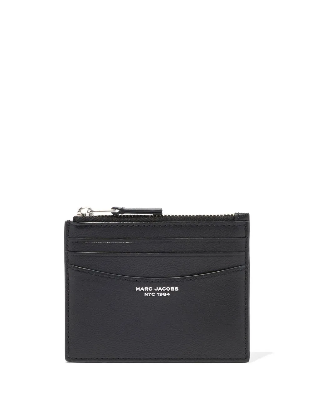 The Slim 84 cardholder from Marc Jacobs featuring black, goatskin, gold-tone hardware, top zip fastening, card slots and gold-tone logo lettering.
