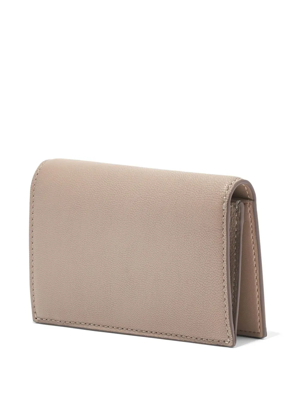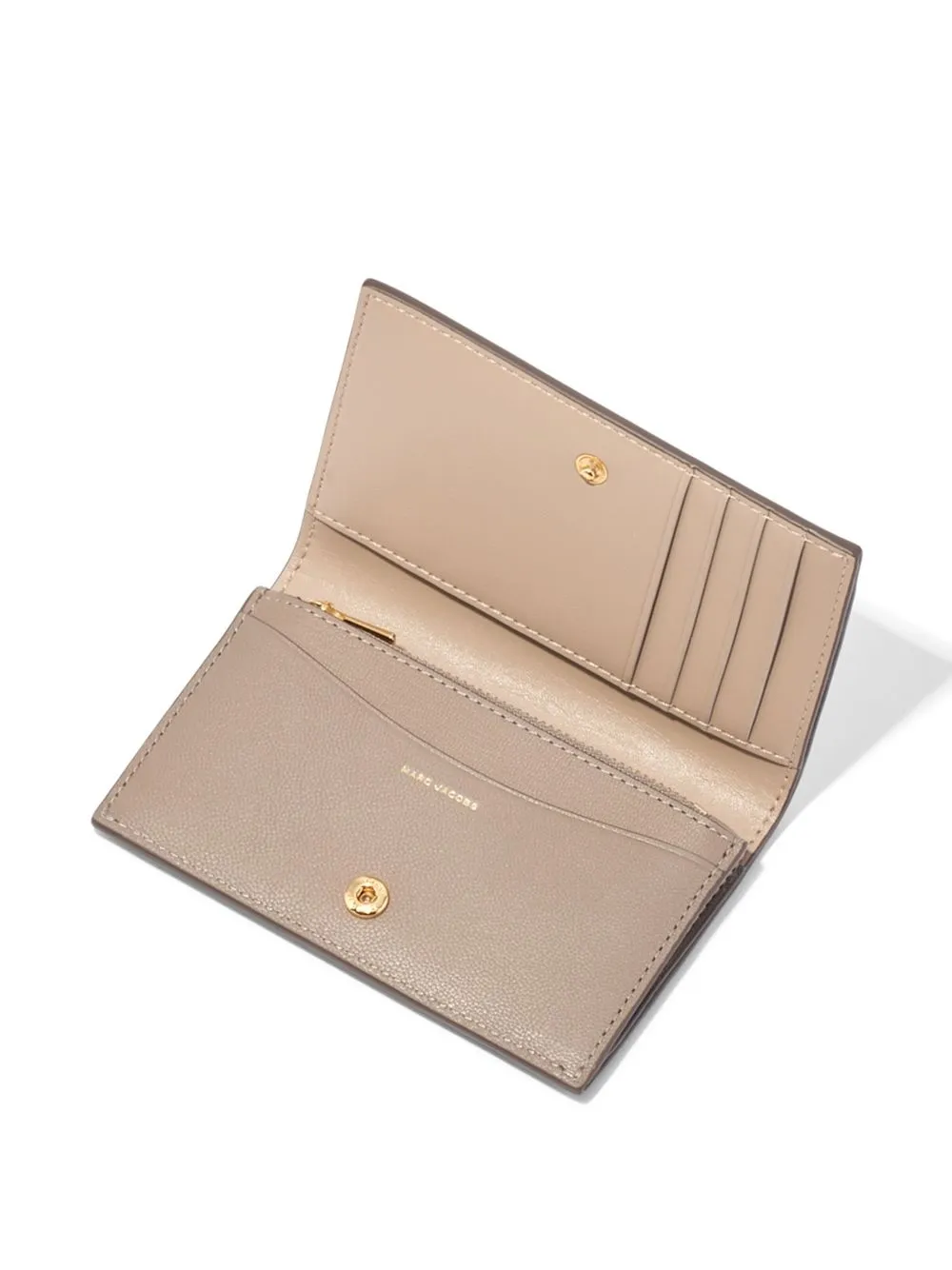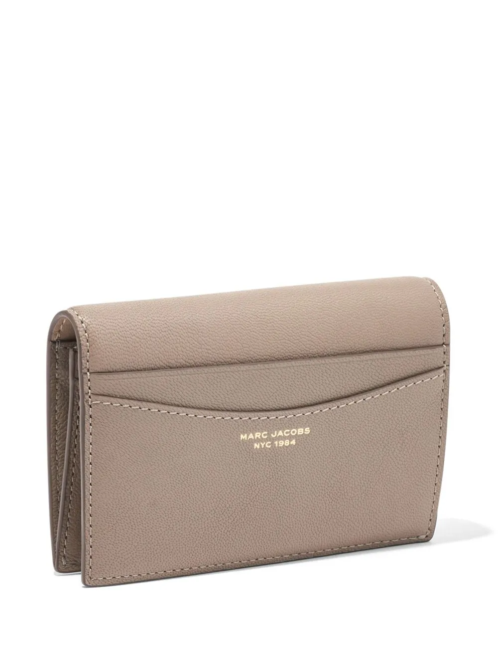 The Slim bifold wallet from Marc Jacobs featuring almond beige, goatskin, grained texture, gold-tone hardware, logo stamp to the front, internal logo stamp, foldover top with press-stud fastening, card slots, internal card slots and internal zip-fastening pocket.