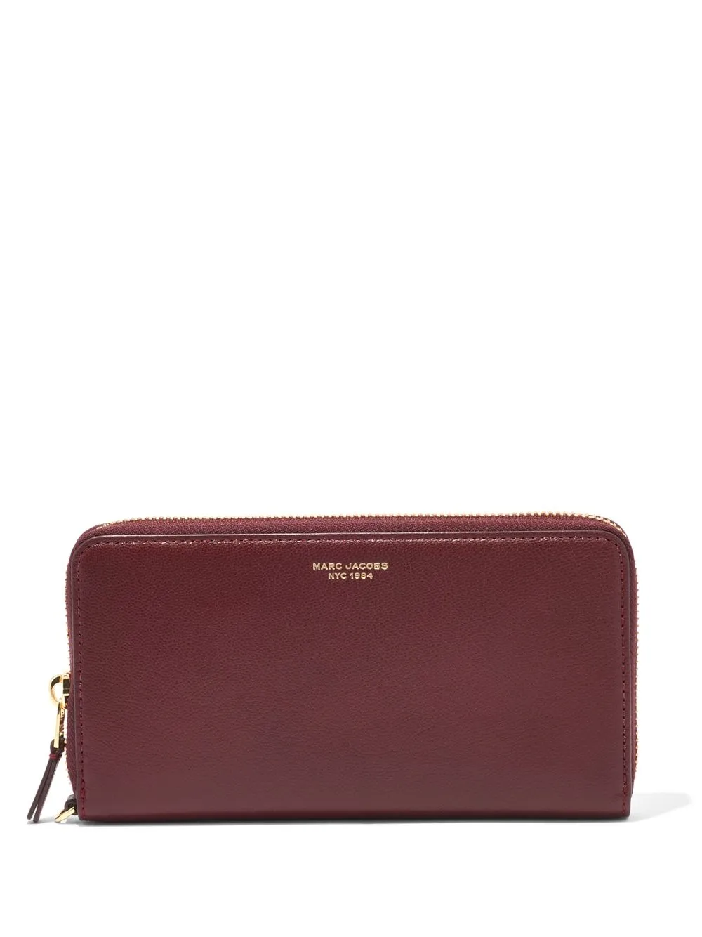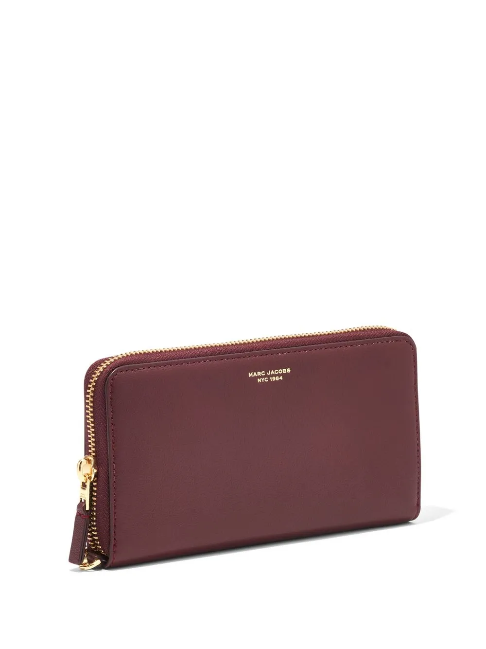 The Slim continental wallet from Marc Jacobs featuring dark red, goatskin, gold-tone hardware, logo stamp to the front, internal logo stamp, all-around zip fastening, main compartment, internal card slots and detachable wrist strap.