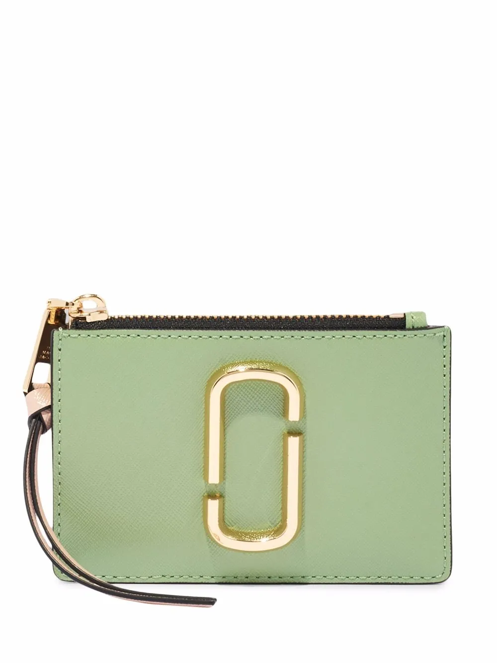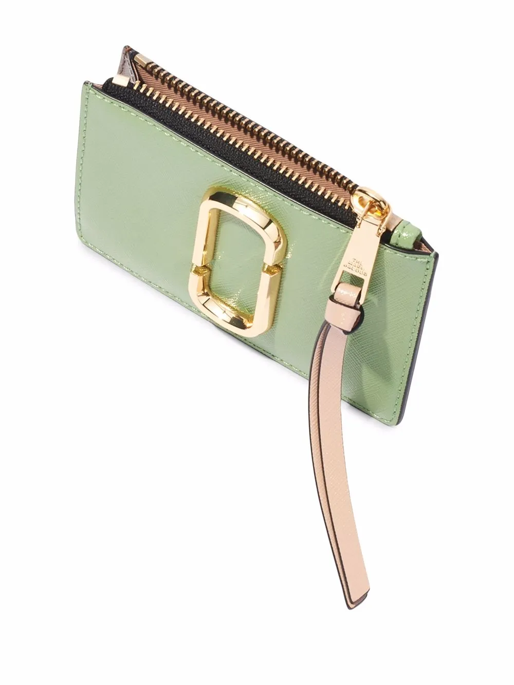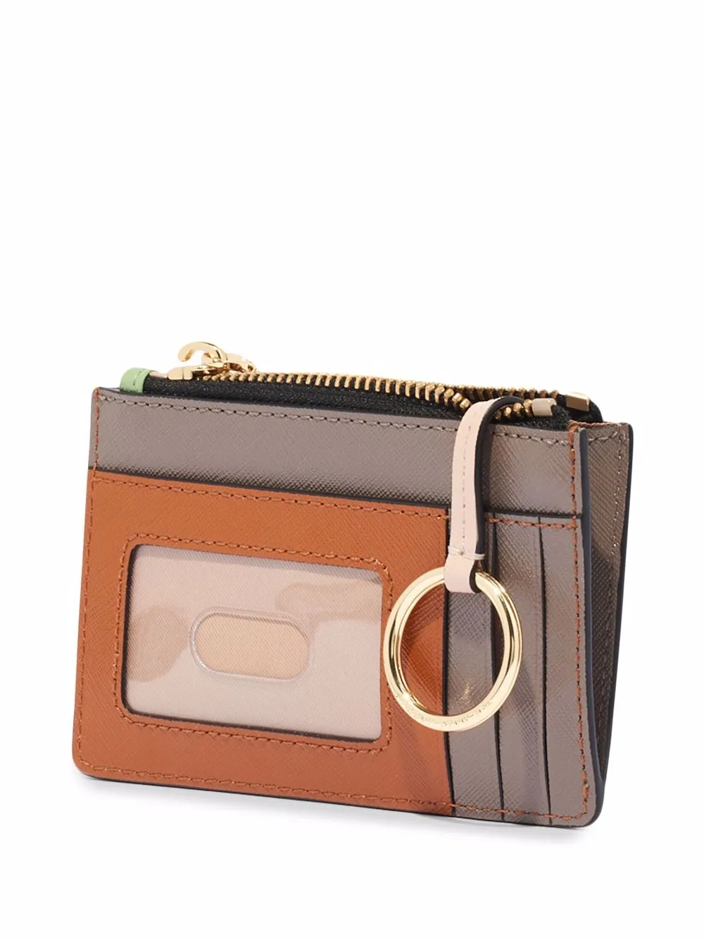 Mint green/purple/orange leather The Snapshot top-zip multi-wallet from Marc Jacobs featuring colour-block design, gold-tone logo plaque, top zip fastening, card slots, keyring attachment and transparent ID window.